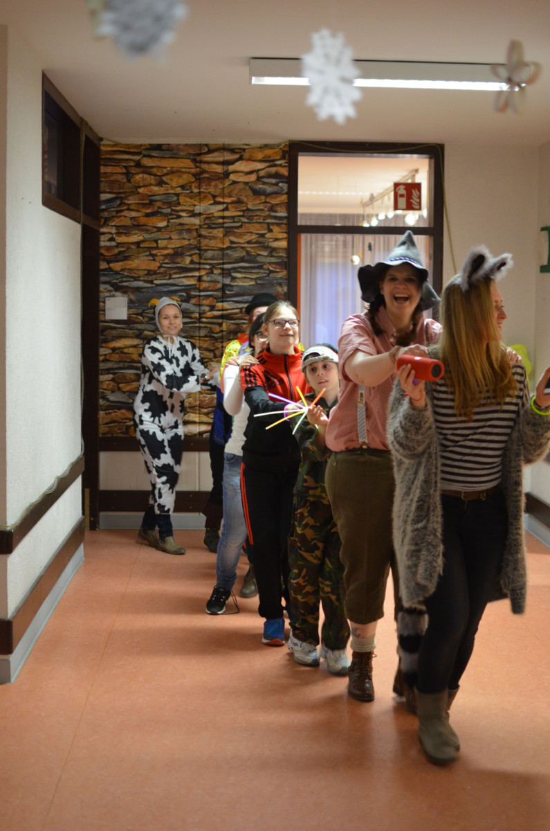 durfte ausgelassen getanzt und mitgesungen werden. Durch das Losverfahren wurde ermittelt, wer auf die selbstgebastelte Pinata einschlagen und somit Süßigkeiten für alle ergattern konnte. Auch in diesem Jahr wurden die drei schönsten Kostüme ermittelt und die glücklichen Gewinner und Gewinnerinnen mit kleinen Preisen belohnt. Den Abschluss des tollen Nachmittags bildete eine Polonaise durch die Internatsgruppen, bevor die Feiergesellschaft sich auflöste und jeder wieder auf seine Gruppe ging.
