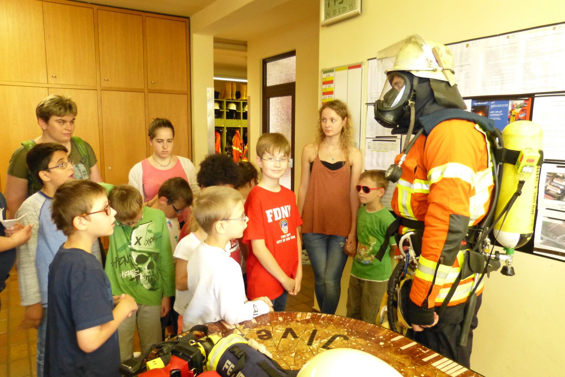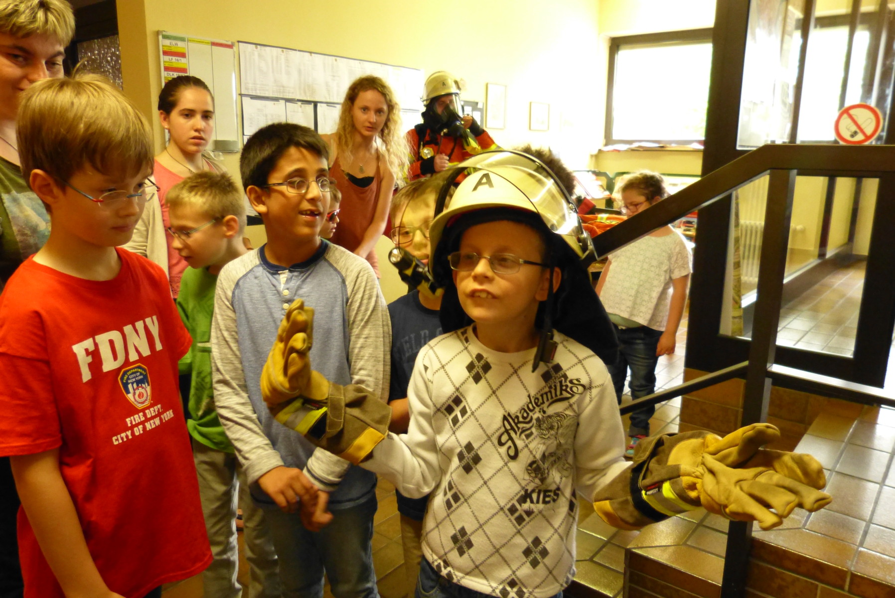 Die Tanja von der Feuerwehr aus Ilvesheim hat uns, der Klasse G 1-3, die Ausrüstung der Feuerwehr gezeigt. Wir durften den Feuerwehrhelm aufsetzen. Wir duften ein Spielhaus löschen.