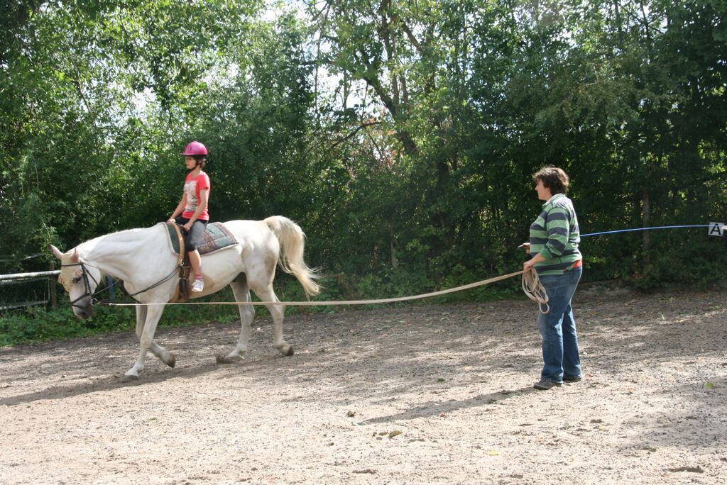Beim Nachmittagsprogramm war alles etwas chaotisch, da es plötzlich zu gewittern anfing und alle entweder in Reithalle oder Stallgasse flüchteten. Gott sei Dank war es schnell wieder vorbei und wir konnten doch auf dem Reitplatz arbeiten. Diesmal liefen die Pferde an der Longe, sodass wir auch mal traben oder galoppieren konnten.