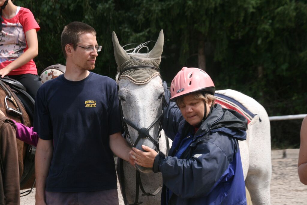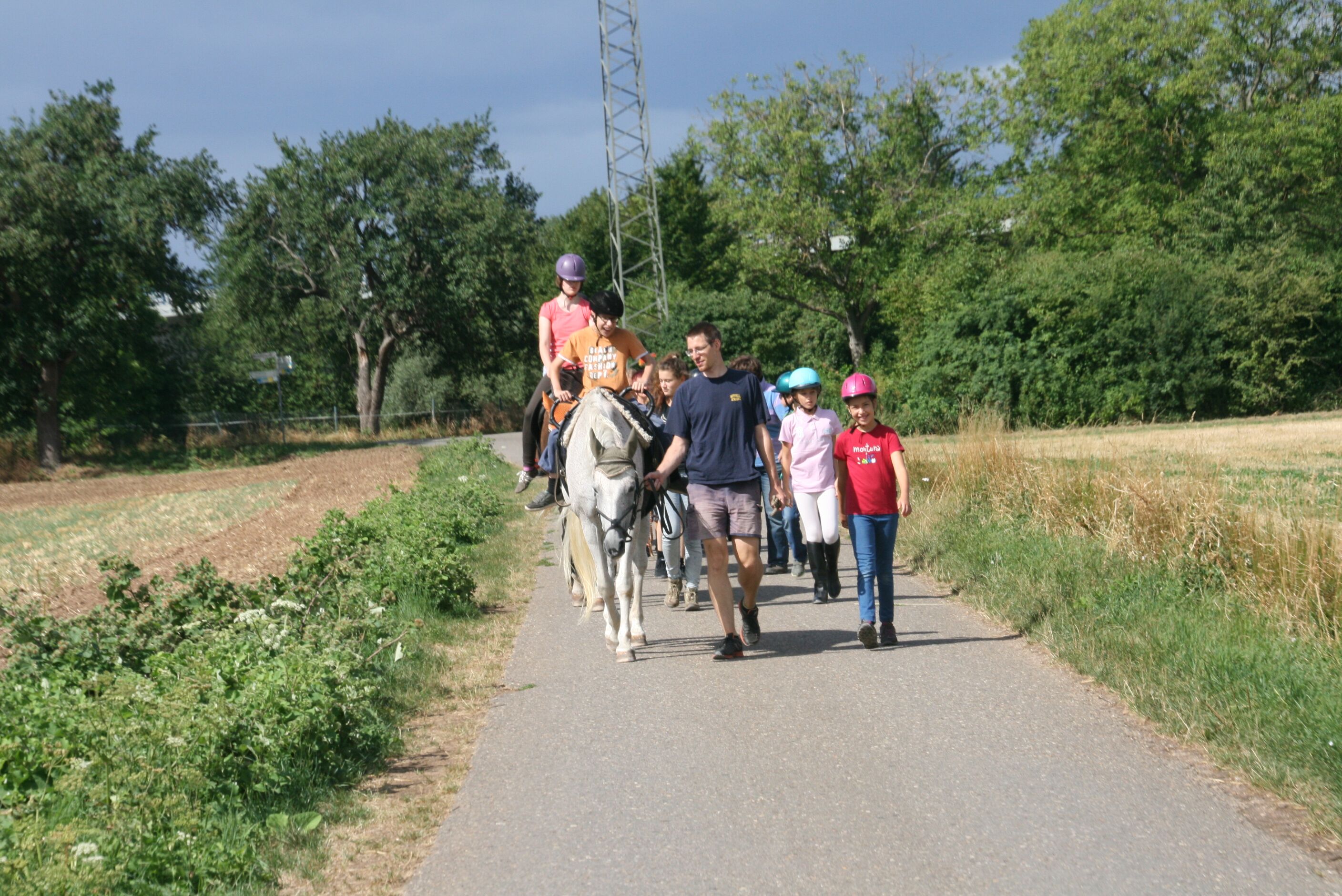 Das letzte Wochenende vor Sommerferienbeginn verbrachten sieben blinde und sehbehinderte Schülerinnen und Schüler wieder mit sehenden Kindern und Jugendlichen gemeinsam – und hatten dabei nicht nur beim Reiten jede Menge Spaß … Am Freitagmittag wurden wir mit drei Autos zum Leimener Gemeindehaus gefahren. Eigentlich sollte es dort eine Anfangsrunde geben, allerdings kamen wir überhaupt nicht dazu: Zuerst war der eigentlich für das Treffen bestimmte Raum belegt, sodass wir erstmal in einen anderen Raum umziehen mussten, dann dauerte es so lange, bis alle da waren – und als dann alle da waren, mussten wir uns schon auf den Weg zum Birkenhof nach Dossenheim machen. Dort angekommen, lernten wir die Pferde kennen, indem wir sie von der Weide führten und putzten, und holten unsere Anfangsrunde nach. Später kam Herr Groß, der Pfarrer der Leimener Gemeinde, zu Besuch, um mit uns gemeinsam den kommenden Gottesdienst zu gestalten. Da wurde eifrig diskutiert – über den Umgang mit Blinden und Sehbehinderten, über den Krieg in anderen Ländern, über Gewalt und Kriminalität, darüber, dass man jeden Menschen so akzeptieren soll, wie er ist – und es gab noch viel, viel mehr. Außer dem wirklich sehr interessanten Gespräch überlegten wir uns in kleinen Gruppen Fürbitten und planten alles Weitere.
