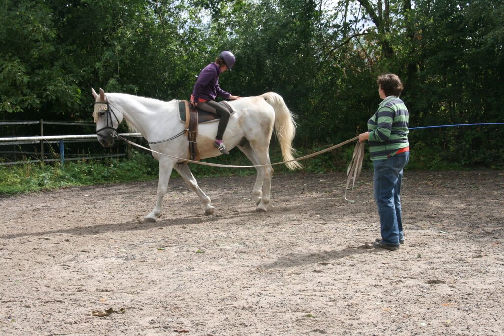 Beim Nachmittagsprogramm war alles etwas chaotisch, da es plötzlich zu gewittern anfing und alle entweder in Reithalle oder Stallgasse flüchteten. Gott sei Dank war es schnell wieder vorbei und wir konnten doch auf dem Reitplatz arbeiten. Diesmal liefen die Pferde an der Longe, sodass wir auch mal traben oder galoppieren konnten.