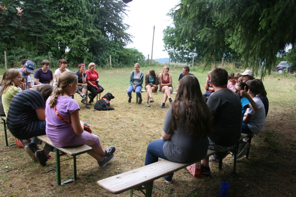 Am Abend grillten wir dann noch gemeinsam. Hierzu waren auch Eltern, Geschwister, Freunde und sonstige Bekannte und Verwandte der Leimener Kinder eingeladen. Jede Familie hatte etwas zu Essen mitgebracht, sodass es neben Steaks, Würstchen und Schafskäse auch ein reichliches Salatbuffet gab. Da auch einige Hunde den Weg zum Birkenhof gefunden hatten, fanden sich gerade nach dem Essen kleine Gruppen zusammen, die sie streichelten, mit ihnen spielten oder ein wenig mit ihnen auf dem Hof herumliefen. Eines der Kinder brachte einem Hund sogar bei, über die ganz niedrigen Pferde-Hindernisse auf dem Reitplatz zu springen, über die die Pferde mühelos drüber steigen. Zusätzlich gab es in der Reithalle ein kleines Lagerfeuer, an dem man Marshmallows und Stockbrot zubereiten konnte. Gegen halb neun löste sich die Gruppe auf und die Ilvesheimer Gäste fuhren wieder zum Haus der sehenden Kinder.