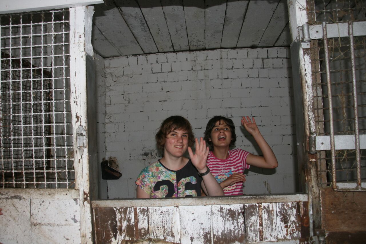 Nun fuhren wir wieder auf den Reiterhof und heute durften wir uns wünschen, was wir machen wollten. Schlussentlich ging eine Gruppe ausreiten und die andere voltigieren. Die Ausrittgruppe ritt wieder die selbe Strecke wie am Vortag, nur mit dem Unterschied, dass es diesmal weder regnete noch stürmte. Die Voltigiergruppe ritt an der Longe, trabte, galoppierte und machte kleine Übungen wie z.B. rückwärts reiten, auf dem Pferd knien, die Mühle oder die Fahne. Bei der Mühle dreht man sich wie ein Mühlenrad auf dem Pferderücken, und bei der Fahne kniet man ebenfalls, streckt aber zusätzlich z.B. das rechte Bein und den linken Arm (es geht auch umgekehrt) von sich weg. Später durften die Mitglieder dieser Gruppe noch frei reiten, das heißt, ohne Longe und mit Zügeln. So konnte man erfahren, wie es ist, allein und unabhängig die Oberhand über das Pferd zu haben. Später halfen wir alle bei der sonstigen Arbeit auf dem Hof – da wurden die Futterkammer erkundet, Karotten in die Pferdeboxen gelegt, Wasser in den Wasserkanistern auf der Weide nachgefüllt, Ställe ausgemistet usw.