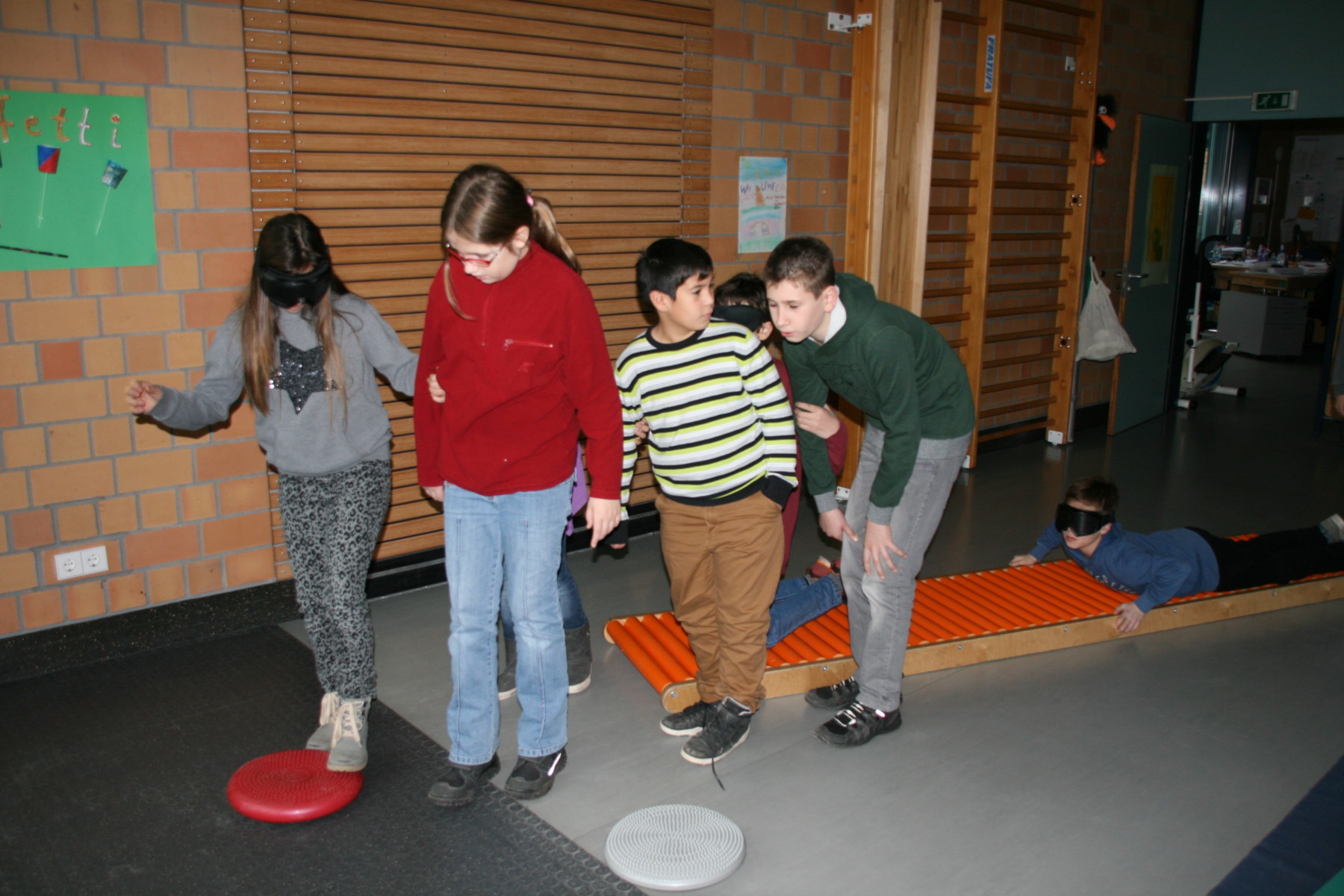 Die Kinder der 5. Klasse der Hörgeschädigten-Schule haben uns, die R5, am Freitag besucht. Wir hatten schon am Donnerstag mit unserer Klasse alles vorbereitet und uns überlegt, mit welchen Fragen wir die Schülerinnen und Schüler überhäufen wollten. Wir mussten in der Gymnastikhalle einen Parcour aufbauen. Am nächsten Tag kamen dann die Kinder in der 2. Stunde. Jeder Schüler und jede Schülerin aus unserer Klasse hat jemanden durch den Parcour geführt. Danach sind wir ins Klassenzimmer gegangen.