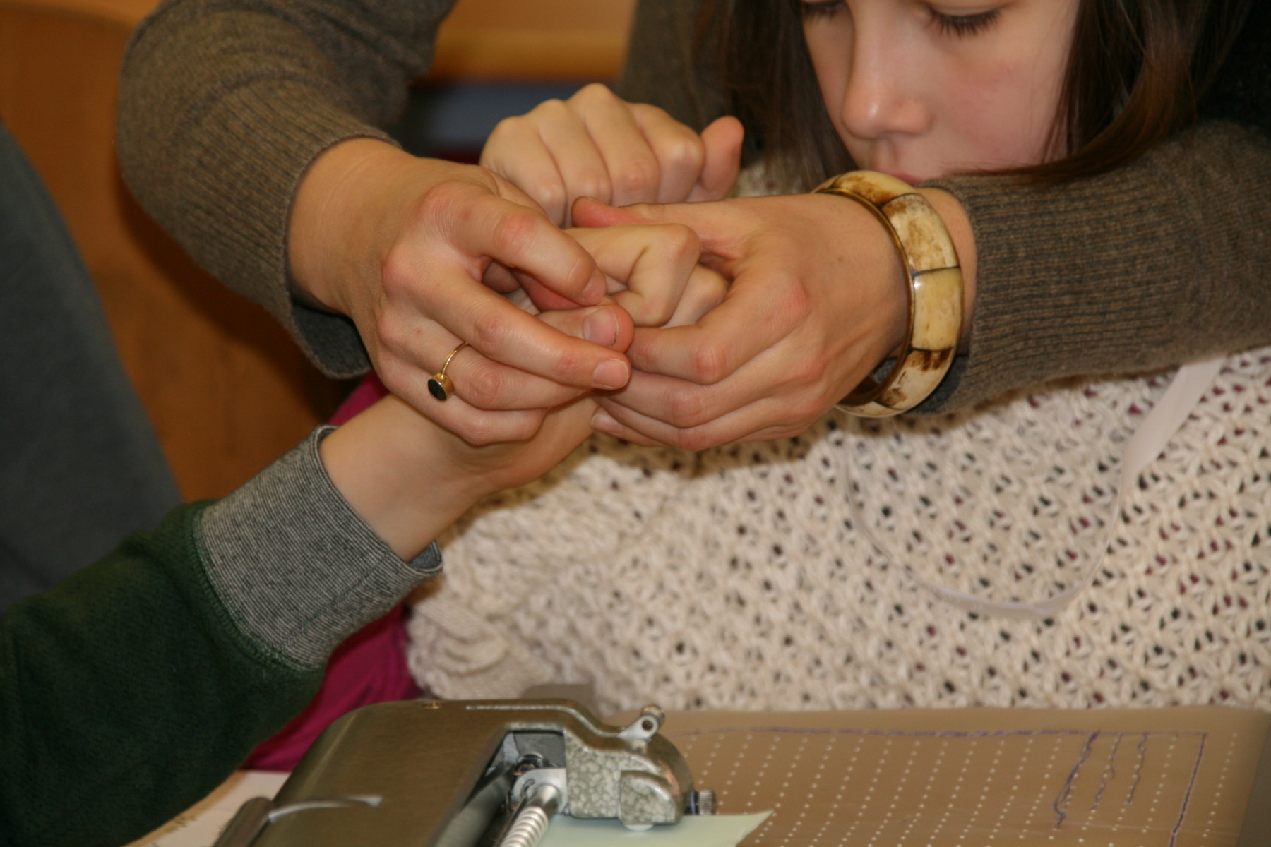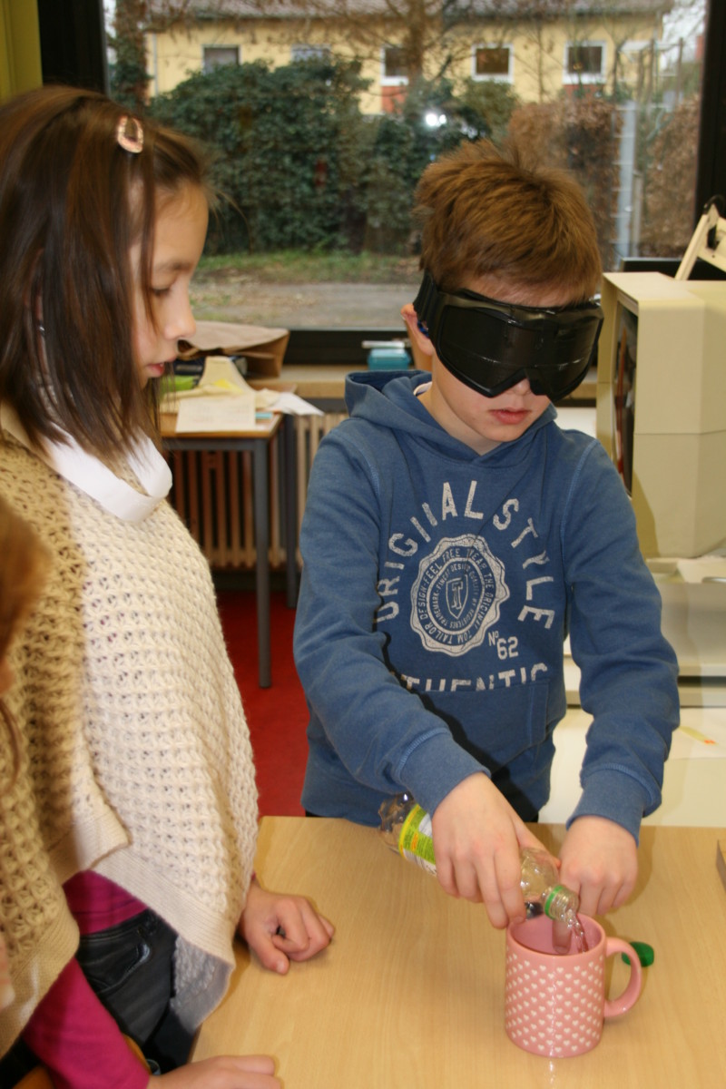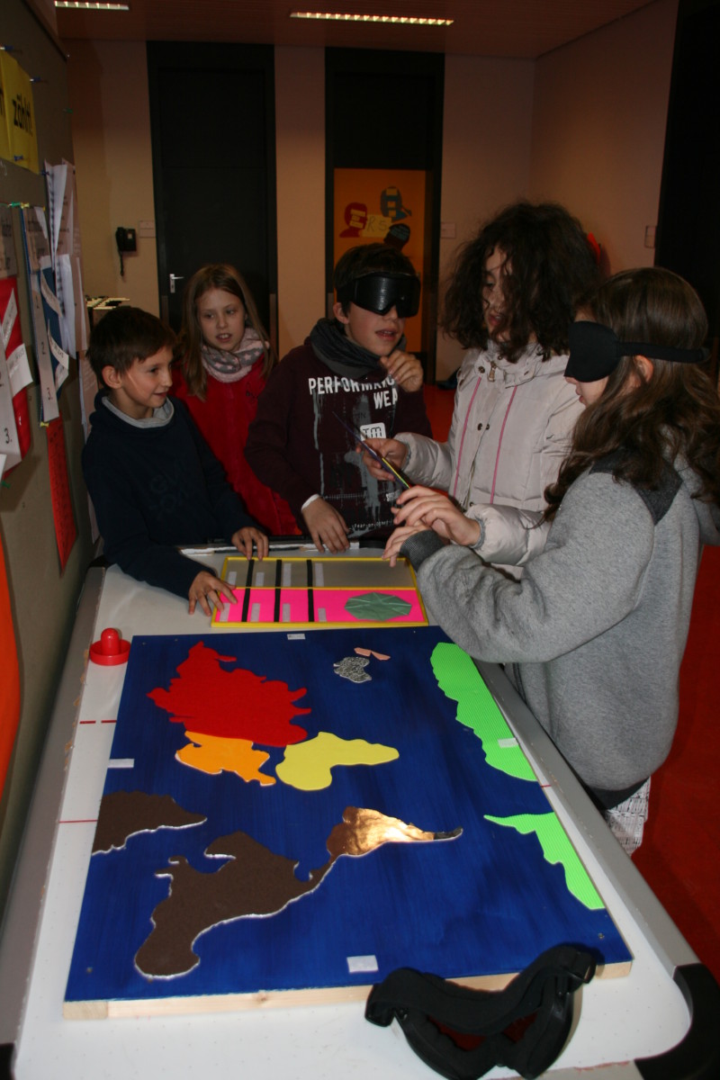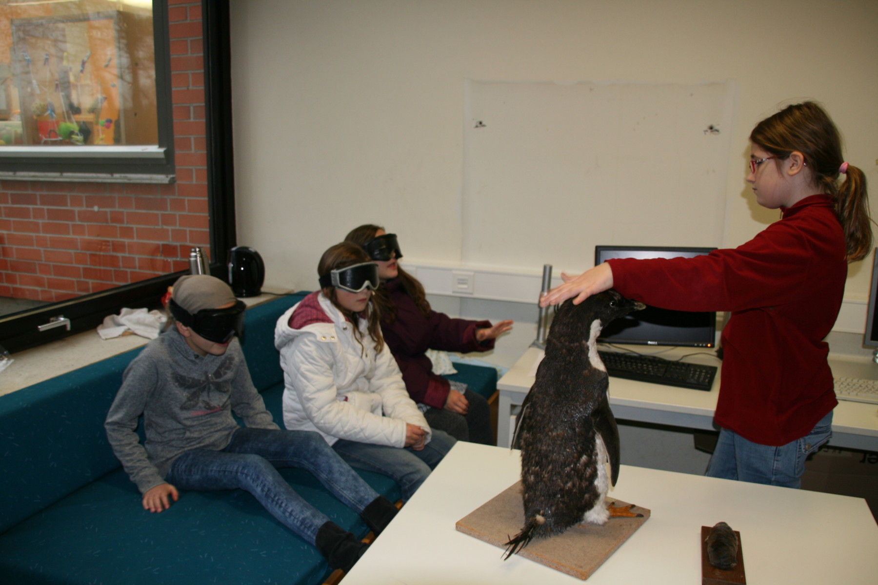 Emilin und die Leonie hatten ihnen die Landkarten gezeigt. Natürlich mit verbundenen Augen, damit sie nichts sehen können und verstehen, wie es für einen blinden Schüler ist. Also mussten sie es alles ganz genau betasten. Es gab aber auch andere Stationen wie die Natur! Das hatte die Noelle gemacht. Dort konnte man ausgestopfte Tiere anfassen, die früher mal gelebt haben und raten, welches Tier es ist. Es war ein Pinguin und ein Maulwurf! Serena hat den Schülern gezeigt, wie man sich unter der Augenbinde ein Glas Wasser einschenkt. Und natürlich konnten sie bei Süfyan und Justin noch Braille lesen und schreiben! Dann haben wir uns gegenseitig viele Fragen gestellt!