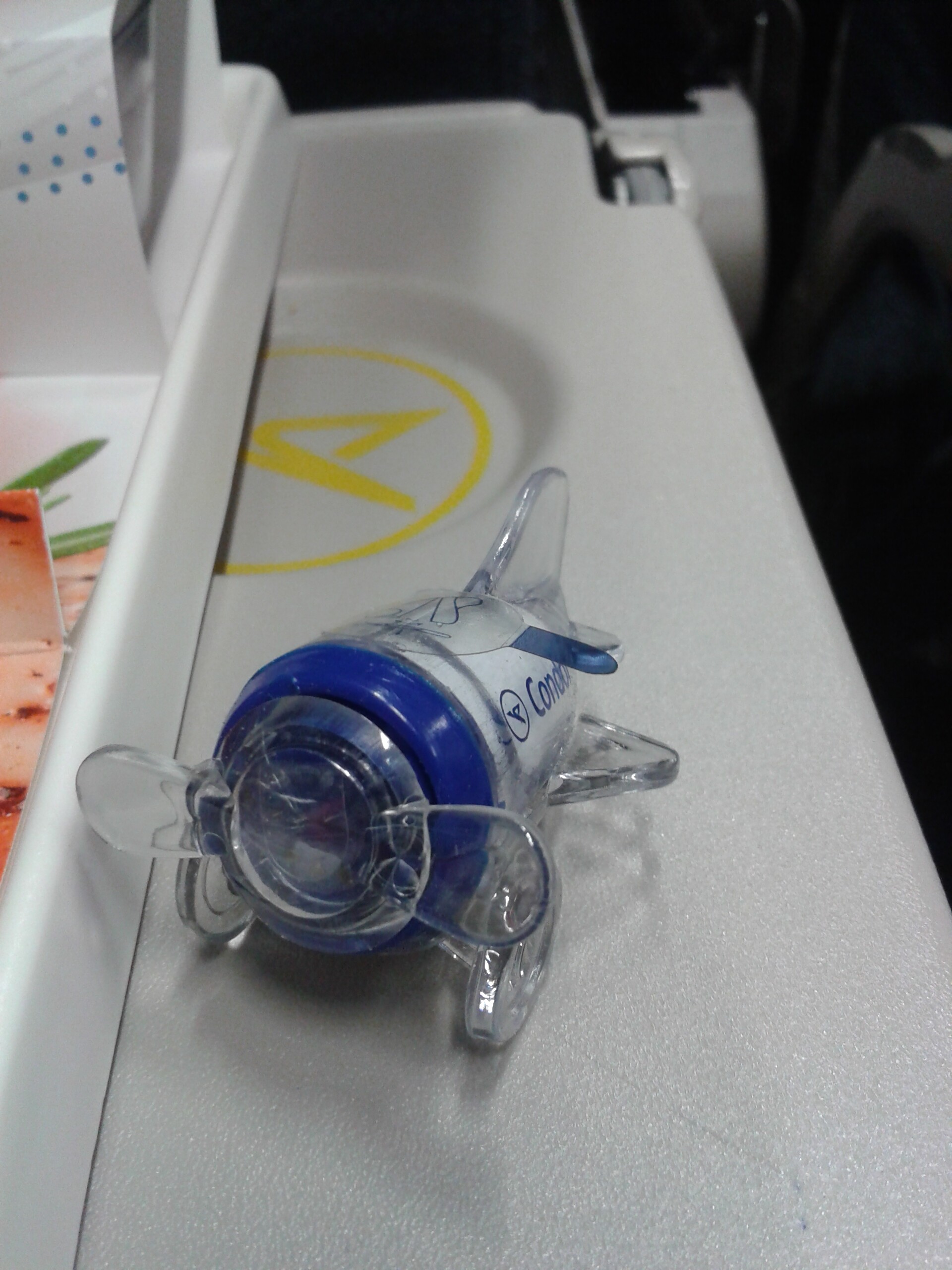 Nach dem „Abflug“ gab es Getränke und einen kleinen Snack. Anschließend bekamen wir unser richtiges Essen: Reis mit Fleisch und Sauce, etwas Käse und Trauben, eine kleine Schale Reisnudelsalat, ein Stück Lachs, ein Brötchen und einige andere Dinge. Besonders daran war, dass alles extra verpackt war. Zunächst hatte man als Blinder keine Ahnung, was sich unter welcher Verpackung an welcher Stelle des Tablets befand, aber das Begleitpersonal erklärte alles so genau und mit so viel Ruhe und Geduld, dass man die Anordnung bald verstanden hatte. Etwas ganz besonderes stellte das Plastikflugzeug mit integriertem Salz- und Pfefferstreuer dar, welches wir als Andenken mitbrachten.