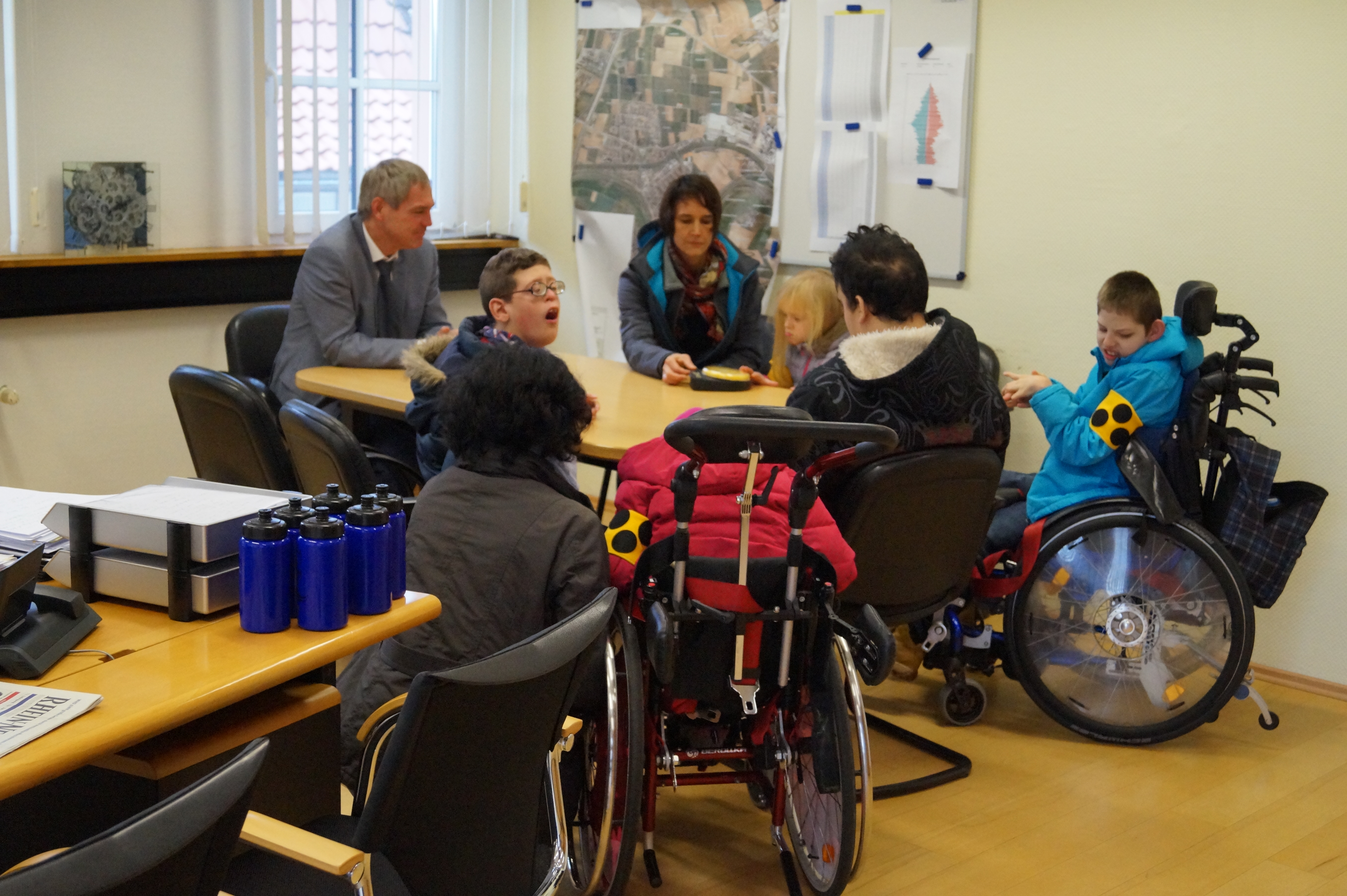 Im Arbeitszimmer des Bürgermeisters durften wir Platz nehmen und unsere Fragen an ihn stellen. Wir wissen nun, dass es in Ilvesheim 9008 Einwohner gibt und über 200 Menschen für die Gemeinde arbeiten. Herr Metz arbeitet nicht nur von montags bis freitags, sondern muss auch am Wochenende viele Termine wahrnehmen.
