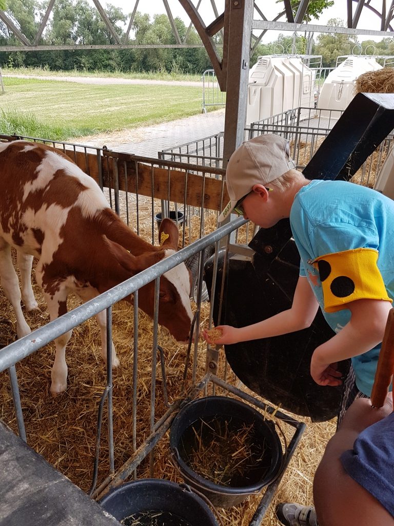 Auf dem Bauernhof haben wir Kälbchen gesehen. Ein Kälbchen hat an Viviens Langstock geleckt. Das sah lustig aus.