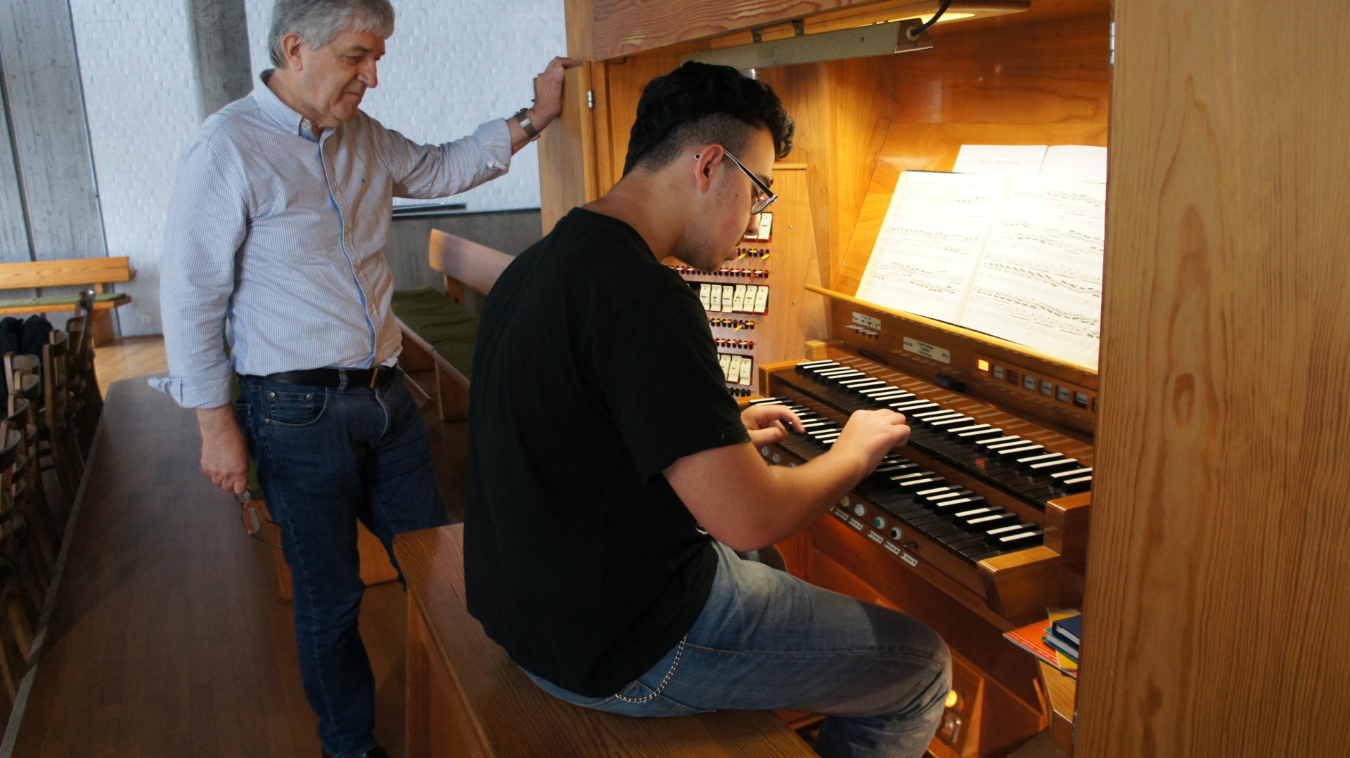 Als wir in der Kirche ankamen, wurden wir von Herrn Kegelmann, dem Organisten, in Empfang genommen. Zunächst hat er uns den ungefähren Aufbau und verschiedene Funktionen der Orgel erklärt.