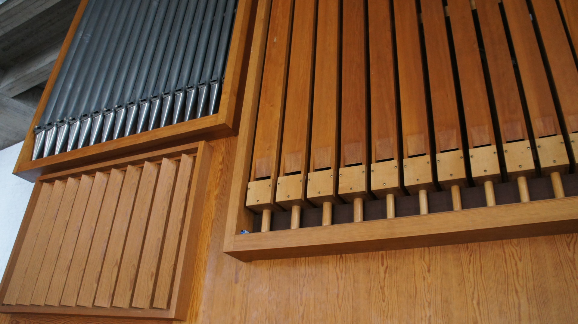 Die Orgel sieht wie ein Häuschen aus. Sie ist 2 Stockwerke hoch. In zwei Räumen sind Holz- und in einem Metallpfeifen. Die kleinste Pfeife ist ungefähr 30cm lang, also ungefähr so groß wie der Computerbildschirm, und die größte Pfeife ist ungefähr 1,5 Meter groß, also ungefähr die Länge eines Tisches. Für jeden Raum gibt es eine eigene Tastatur. Man kann sie mit den Füßen und mit den Händen spielen.