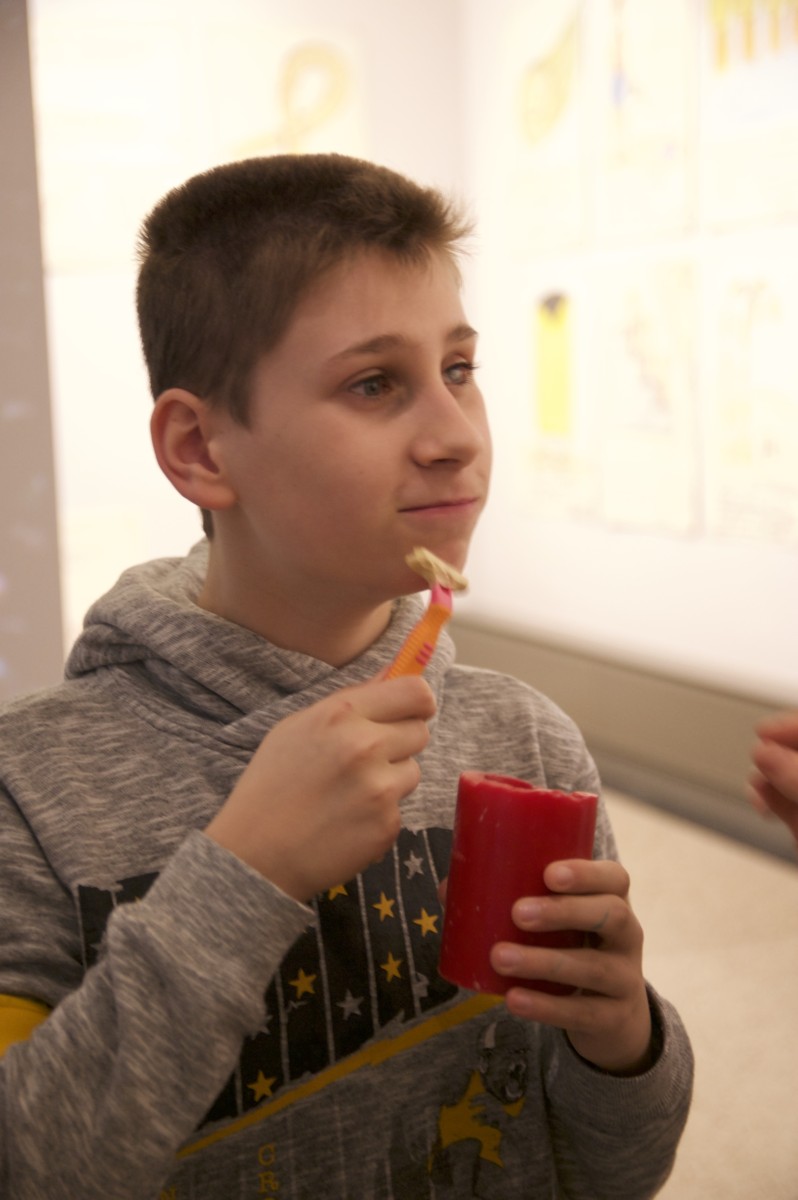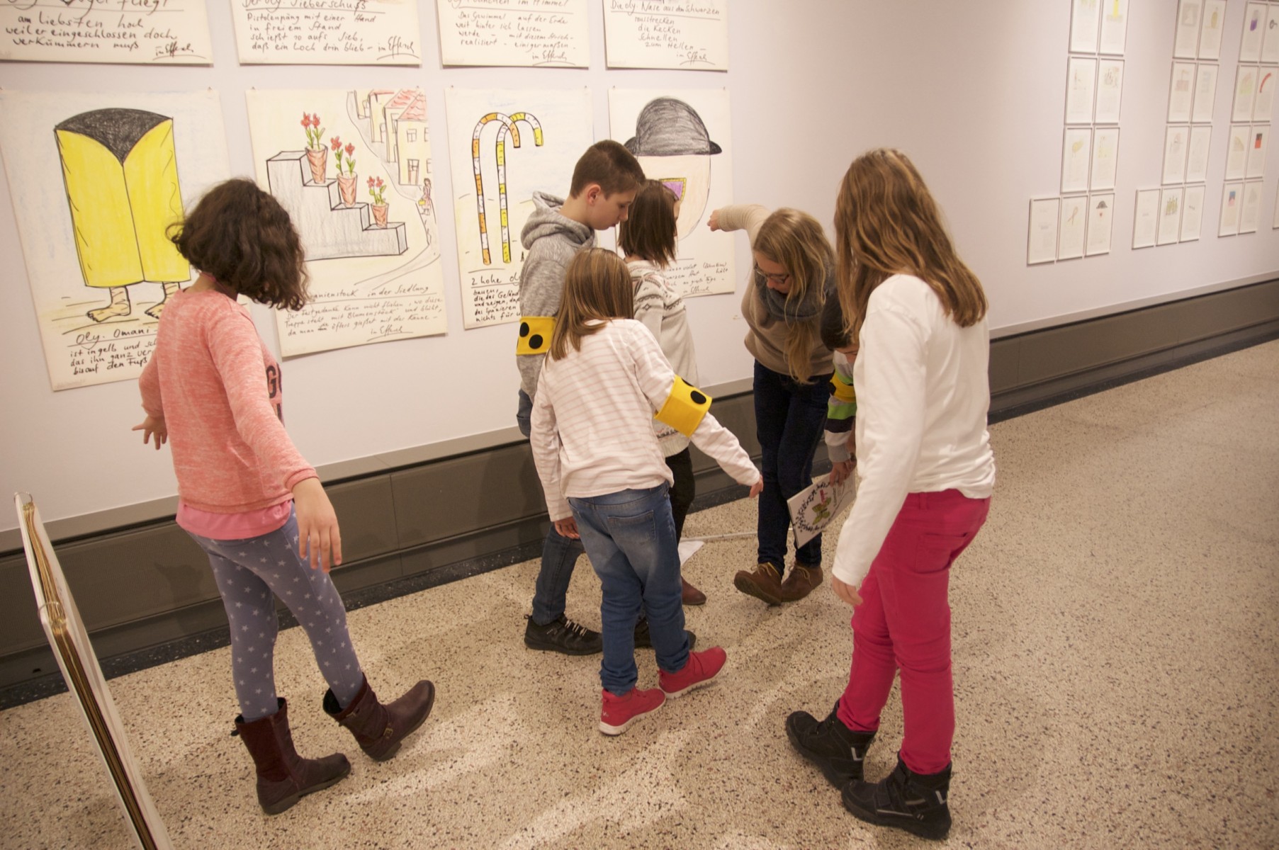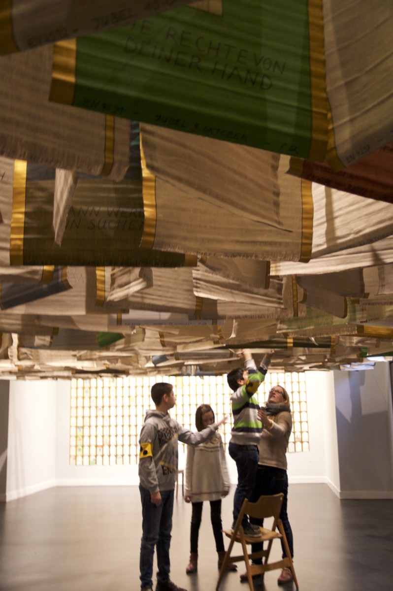 Wir fuhren in die Mannheimer Kunsthalle in der wir uns Kunstwerke von Fritz Schwegler ansahen! Eigentlich hätten wir die Sachen in der Kunstausstellung nie anfassen dürfen. Aber uns haben sie es ausnahmsweise erlaubt die Kunstwerke mit Handschuhen zu betasten!! Fritz Schwegler ist schon ein bisschen ein verrückter Künstler. Er machte zum Teil auch Kunstwerke, die in seinem Alltag vermutlich erschienen waren. In einem Raum hingen 365 Stoffteile auf denen so seltsame Sachen wie zum Beispiel „Putzhorn“ oder „Na da rennst du wieder“ oder „Jetzt illustriert die Schallrichtungen“ standen (oder so). Für jeden Tag im Jahr eins! Fritz Schwegler wollte, dass man die Sätze singt. Ein paar trauten sich die Sätze ihres Geburtstags zu singen. Allen außer Noelle und Frau Krammer war es peinlich, aber es wollte trotzdem jeder wissen, was an seinem Geburtstag für ein Spruch stand. Frau Kramme, unsere Klassenlehrerin, traute sich sogar in Opernform zu singen.