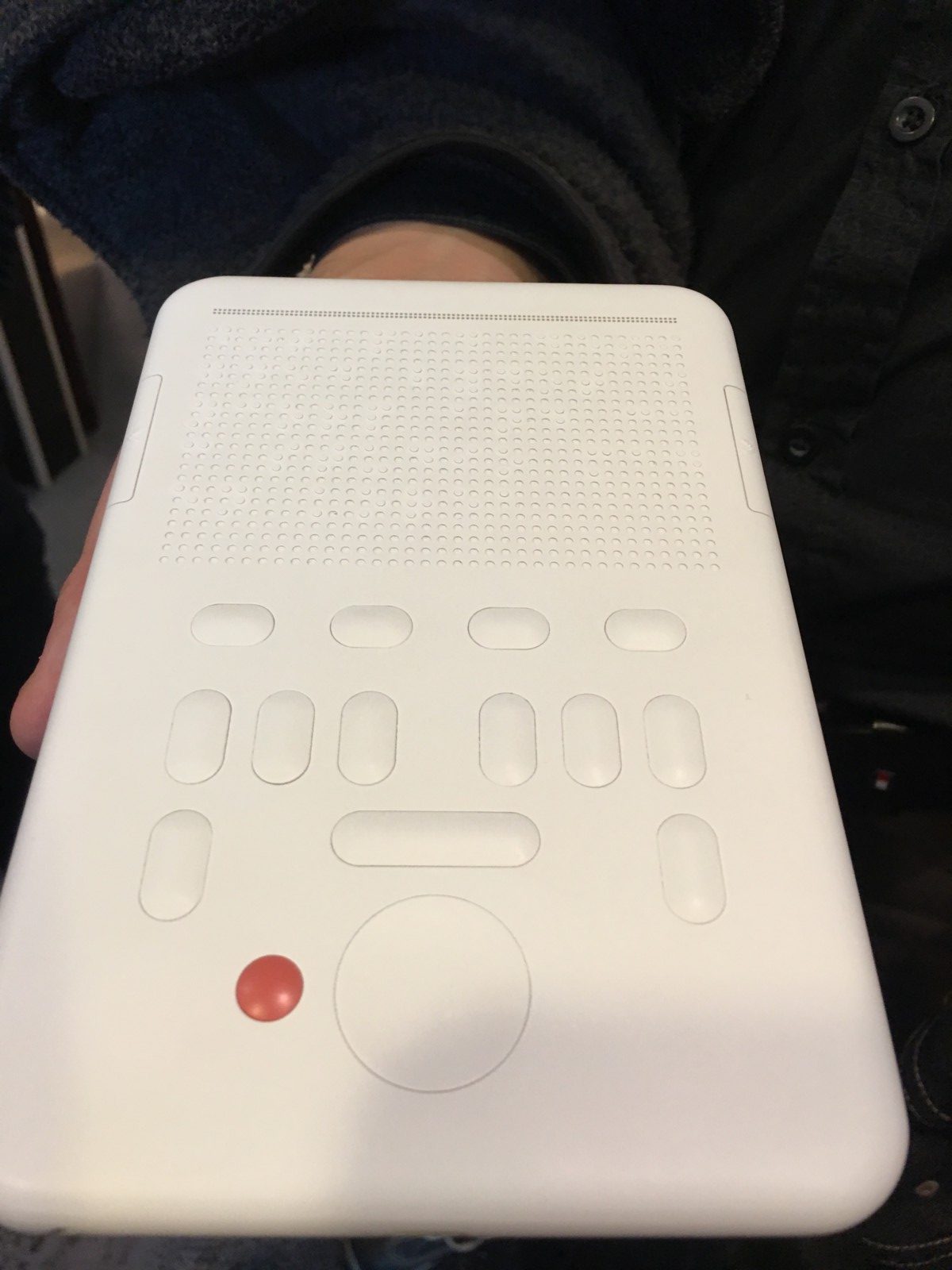 So verschiedene Braillezeilen es gibt, so verschiedene Blindenuhren gibt es auch. Manche zeigen die Uhrzeit in Blindenschrift an, andere sind mit einer Sprachausgabe ausgestattet, die die Uhrzeit auf Knopfdruck ansagt, wieder andere können aufgeklappt werden, sodass man durch vorsichtiges Betasten des Zifferblatts die Uhrzeit ablesen kann. Hier haben wir noch eine neue Form kennengelernt: Die Vibrations-Uhr „Meteor“. Wie der Name schon sagt, arbeitet diese Uhr mit Vibrationssignalen. Sie ist sehr leicht und liegt gut in der Hand. Über drei Knöpfe kann die Uhrzeit über Vibrationssignale erfasst werden. Dabei ist ein Knopf für die Stunden, ein Knopf für die Zehner einer Stunde (also 10, 20, 30, 40, 50) und ein Knopf für die einzelnen Minuten (1, 2, 3, 4 usw.). Wenn es also 05.25 Uhr (oder 17.25 Uhr, das macht in diesem Fall keinen Unterschied) ist, drückt man zuerst auf den Stunden-Knopf. Dieser vibriert fünfmal, da es ja 05.00 Uhr ist. Dann drückt man auf den Zehner-Knopf, dieser vibriert zweimal, da es ja 20 Minuten nach 05.00 Uhr ist. Als letztes drückt man auf den Minuten-Knopf, der fünfmal vibriert. So weiß man: Es ist 25 Minuten nach 05.00 Uhr, also 05.25 Uhr!
