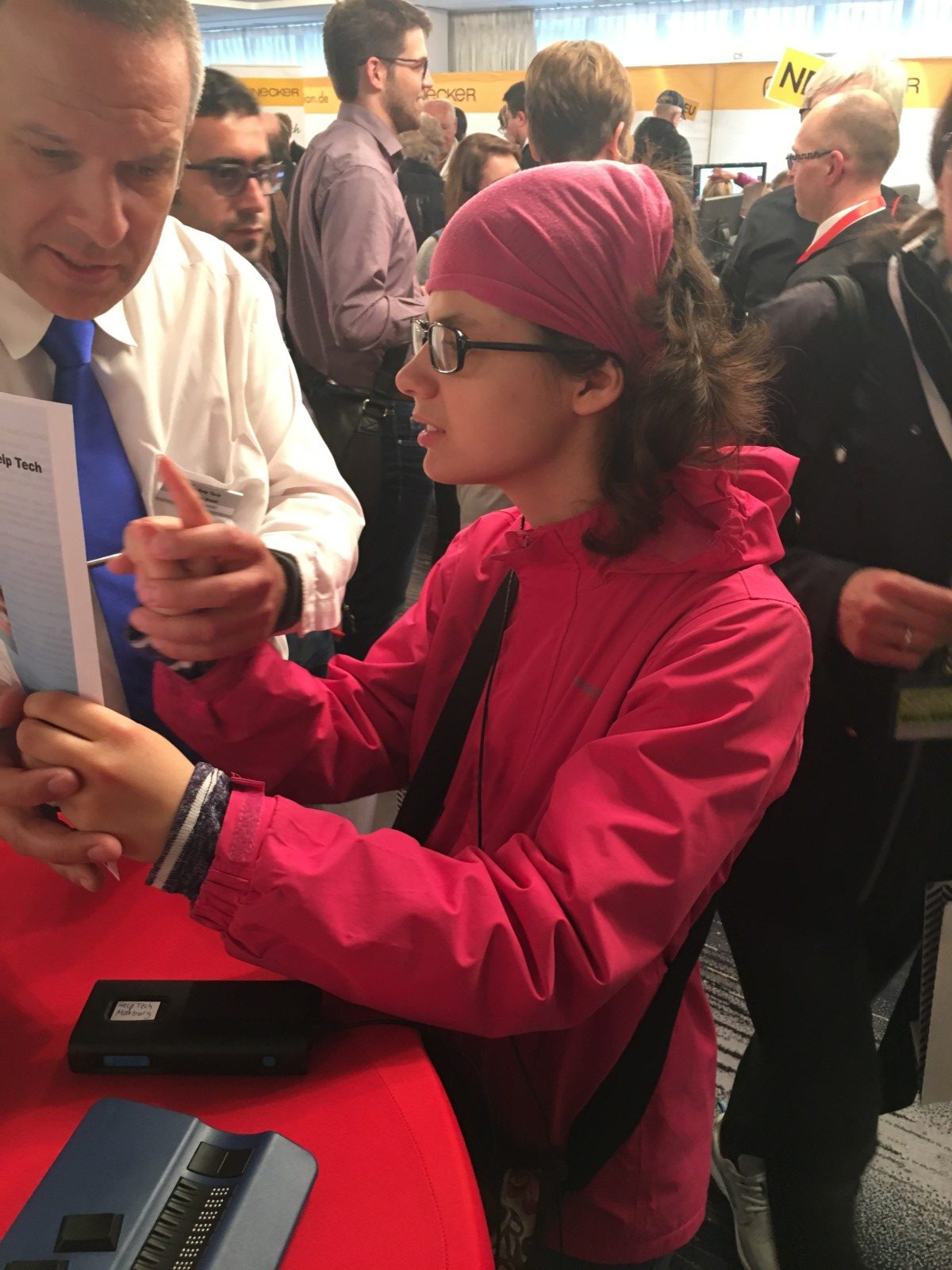 Aber natürlich ist es nicht optimal, sich alles vorlesen zu lassen. Deshalb stellten einige Firmen neue Braillezeilen (Geräte, die man mit dem Laptop oder Computer verbindet und die mittels eines besonderen Programms den Inhalt, der auf dem Bildschirm angezeigt wird, in Blindenschrift übertragen, sodass blinde sie auch lesen können) vor. Hier gab es kleine und handliche Braillezeilen, aber auch solche mit integriertem Computer. Solche Zeilen sind extrem leistungsfähig und können nicht nur die Inhalte eines Bildschirms in Blindenschrift wiedergeben, sondern auch unabhängig eines Computers oder Laptops Dokumente erstellen und bearbeiten oder E-Mails verschicken. Die besten Geräte haben sogar integrierte Lautsprecher!