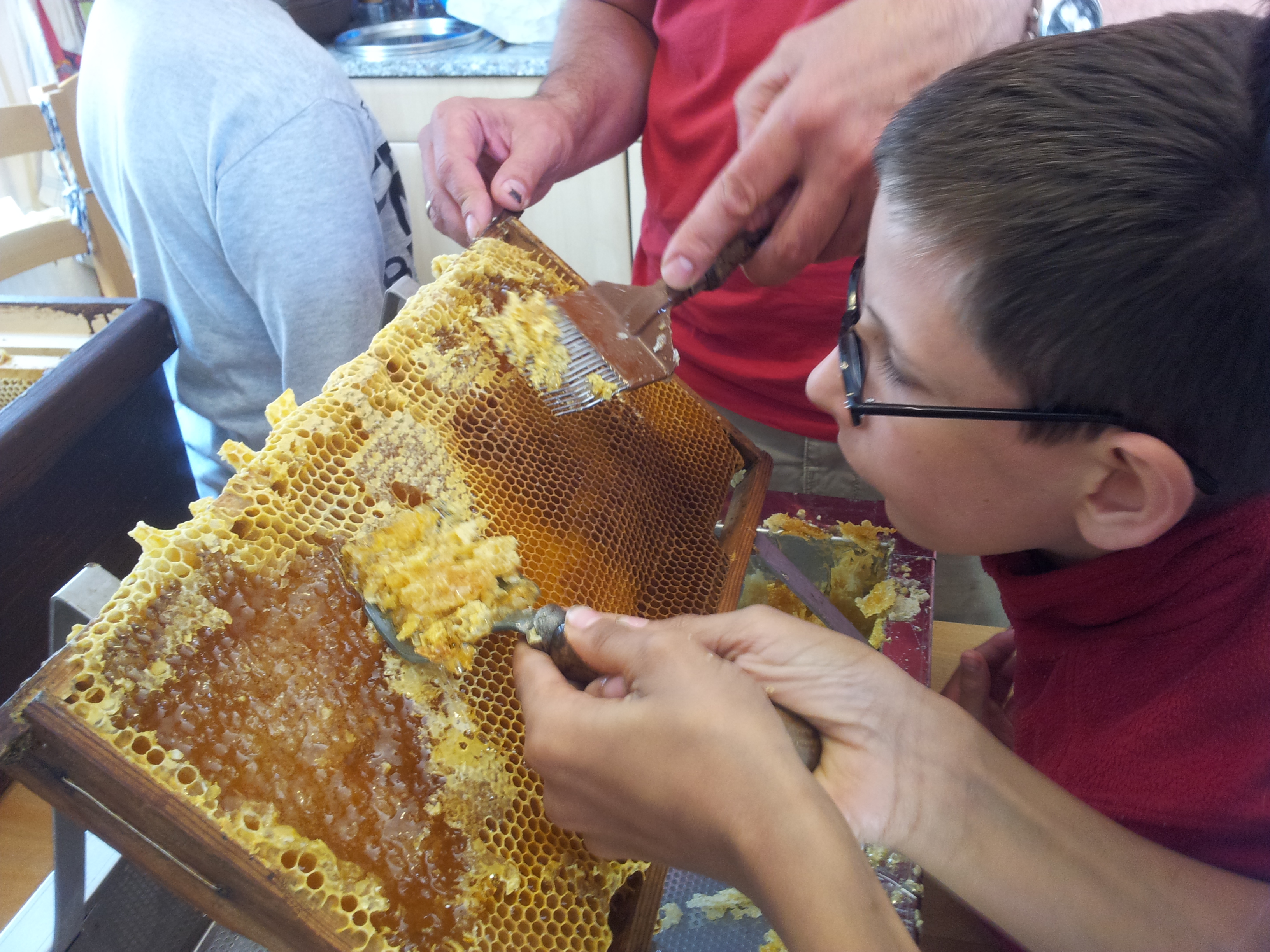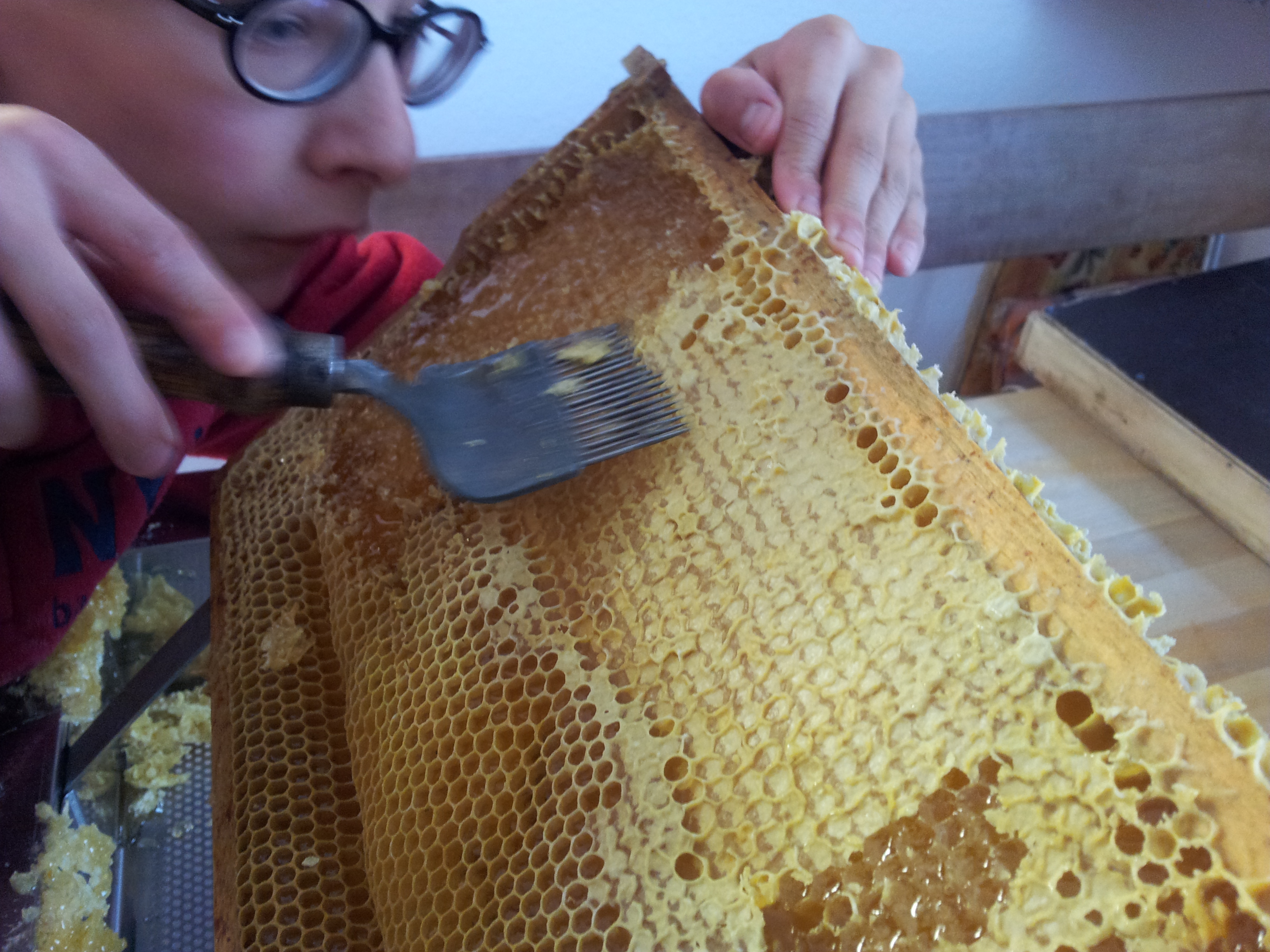 Danach haben wir Herrn Renz geholfen, die Waben zu entdeckeln. Anschließend haben wir den Honig geschleudert.