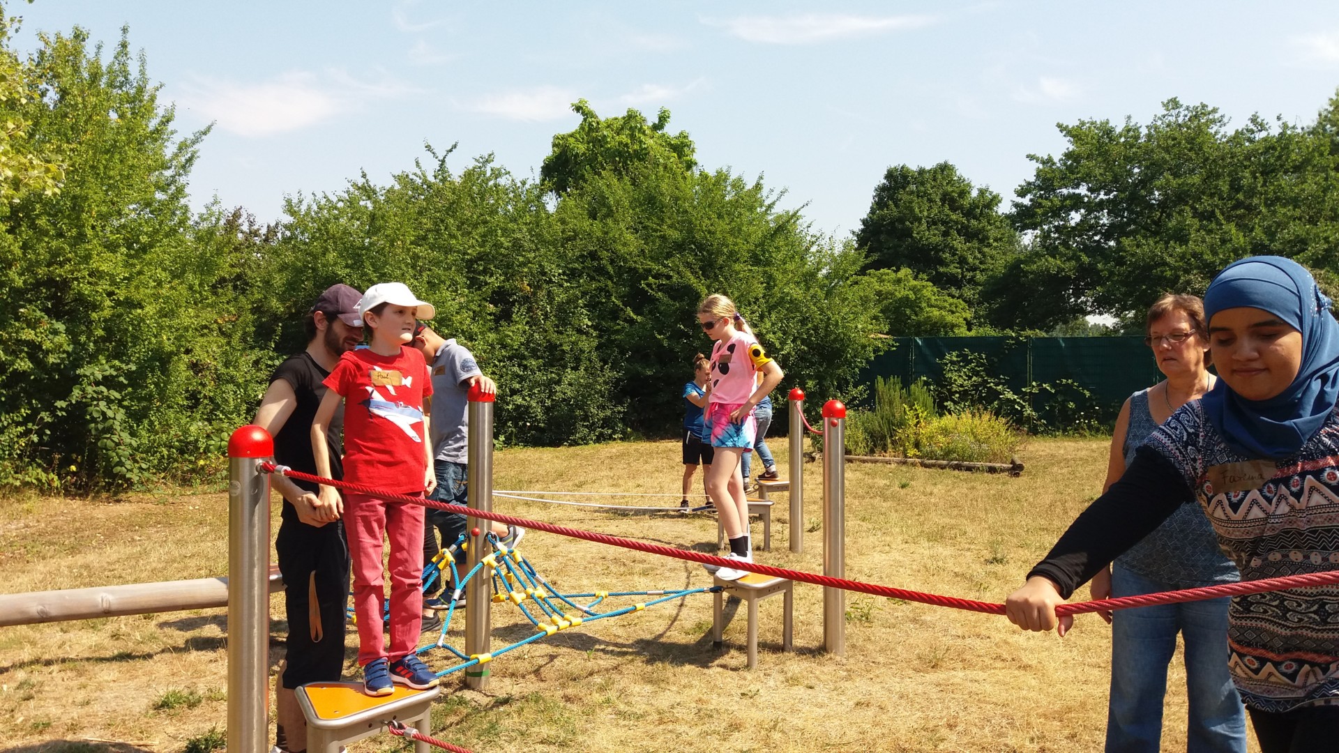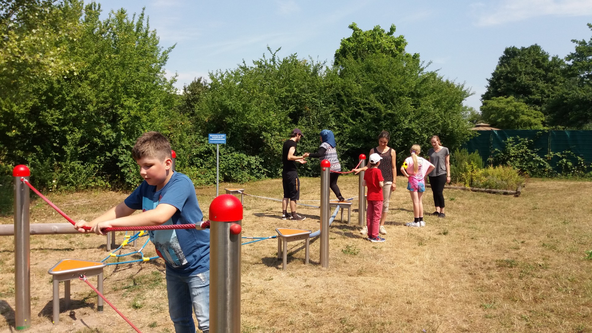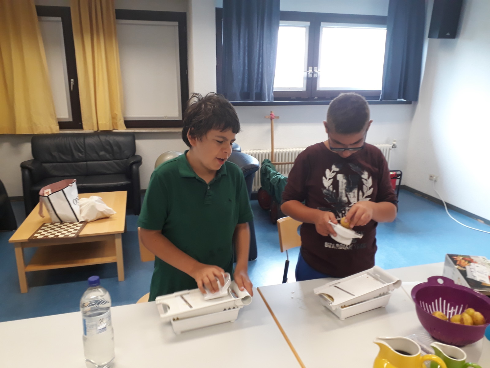 Am Dienstag sind wir morgens nach dem Frühstück zum Niederseilgarten nach Heddesheim gefahren. Ein Niederseilgarten ist ein Klettergarten, bei dem das Seil nur 30 cm über dem Boden ist. Hier gab es „Hosenträger“, über die man laufen konnte, einen Feuerwehrschlauch und einen drehenden Baumstamm. Es gab erst viele Übungen, die man allein bewältigen musste und anschließend Partner- und Gruppenübungen, bei denen man sich unterinander helfen musste. Danach sind wir zurück gefahren und haben gegessen. Wir haben aus unseren eigenen Kartoffeln Pommes und vor allem Kartoffelchips gemacht. Dann haben wir die Schüler in zwei Gruppen aufgeteilt und jeweils eine Sams-CD angehört.