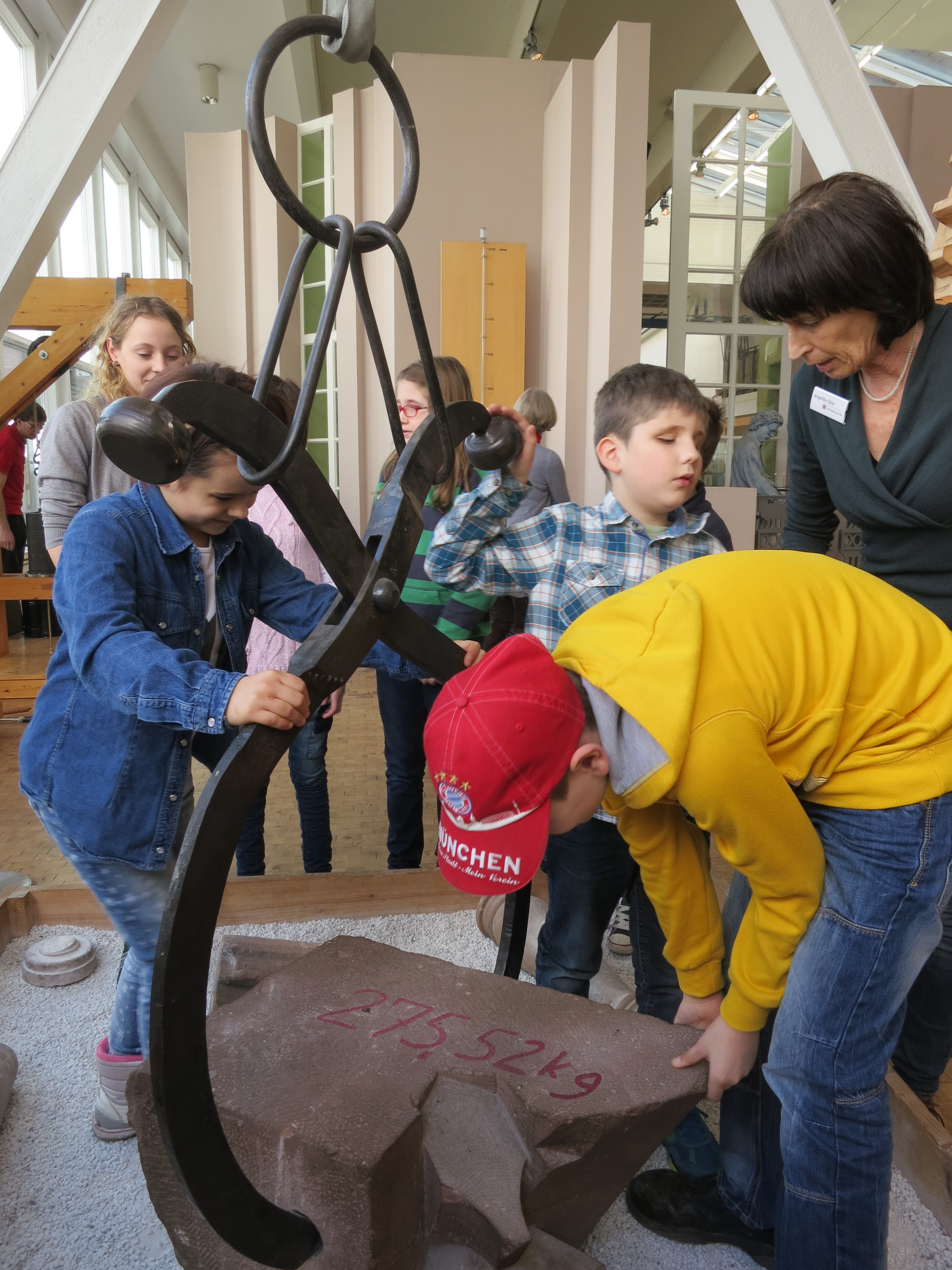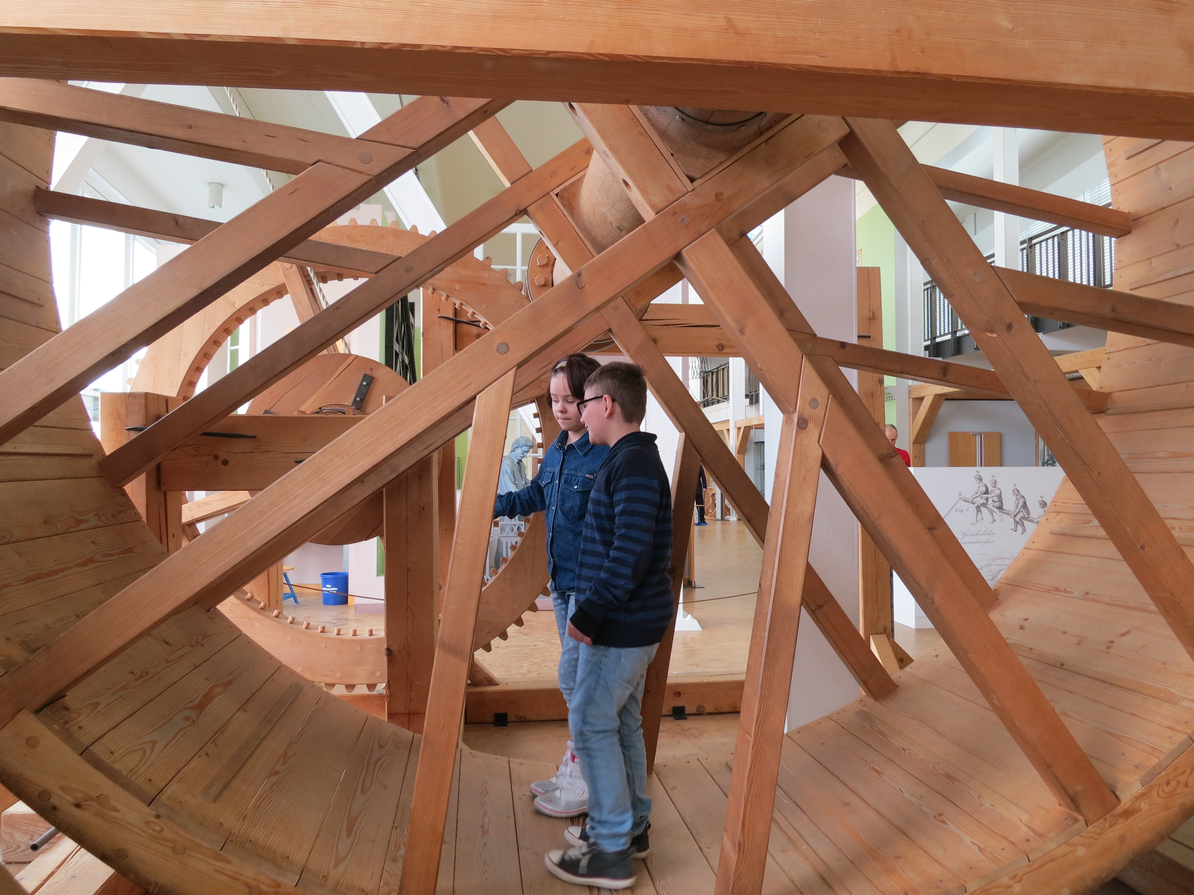Der Laufradkran war echt cool. Man konnte einen 275 kg schweren Stein hochheben, indem man in dem Laufrad lief. Der Holzkran war sehr interessant. Wir haben einen Torbogen gebaut und danach geschaut, ob er ein Gewicht aushält. Er hat es nicht überlebt…