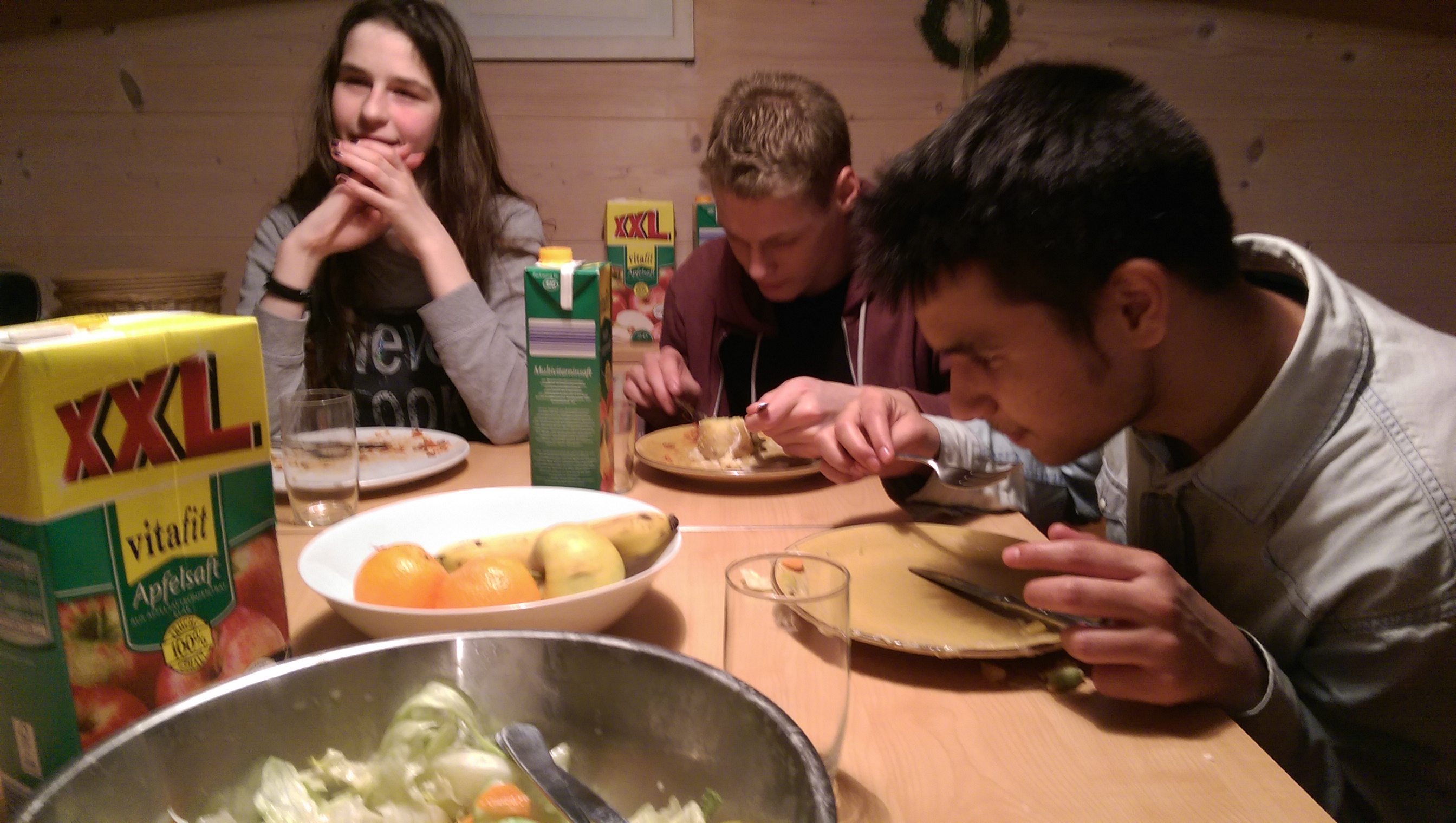 Gegen 10.35 Uhr fuhren wir mit einem Bus und einem Privatauto los. Da die Möglichkeit zur Abholung bestand, machten wir noch in Bad Rappenau und Stuttgart Halt. In Ulm machten wir eine gemeinsame Mittagspause. Gott sei Dank waren die Straßen frei und so verloren wir keine zusätzliche Zeit. In unserem Haus in Andelsbuch, einem kleinen Ort im Bregenzer Wald, packten wir erstmal unsere Sachen aus und richteten die Zimmer ein. Außerdem mussten wir Skischuhe und Helme anprobieren, um sicherzustellen, dass auch etwas Passendes dabei war. Schließlich begannen wir mit der Vorbereitung des Abendessens. Jeder Schüler hatte im Laufe der Woche dreimal Küchendienst – mal morgens, mal abends – bei dem er beim Tischdecken, Kochen, Spülmaschine ein- und ausräumen usw. half. Zum Abendessen gab es Pellkartoffeln mit Quark und Rohkost. Nachher trafen wir uns nochmal für eine theoretische Einweisung. Dabei schauten wir uns zum Beispiel Skischuhe und Skier einmal ganz genau an, durften Fragen stellen und bekamen einiges erklärt. Es wurde demonstriert, wie man die Skistiefel in die Bindung der Skier einhakt und was bei einem Sturz passiert. Blinde bekamen die Möglichkeit, alles in Ruhe zu ertasten. Außerdem wurden noch die FIS-Regeln, die Regeln, die auf der Piste gelten, besprochen. In denen steht unter anderem, dass man, wenn jemand zum Beispiel hingefallen ist, dazu verpflichtet ist, zu helfen – man darf also nicht einfach weiterfahren, sondern muss erst fragen, ob alles in Ordnung ist – und dass man keine anderen Skifahrer oder Snowboarder bei ihremVorhaben behindern und stören darf. Nach etwas mehr als einer Stunde war alles geklärt und wir verbrachten den restlichen Abend mit den Uno-Karten oder bei „Wahrheit oder Pflicht“.
