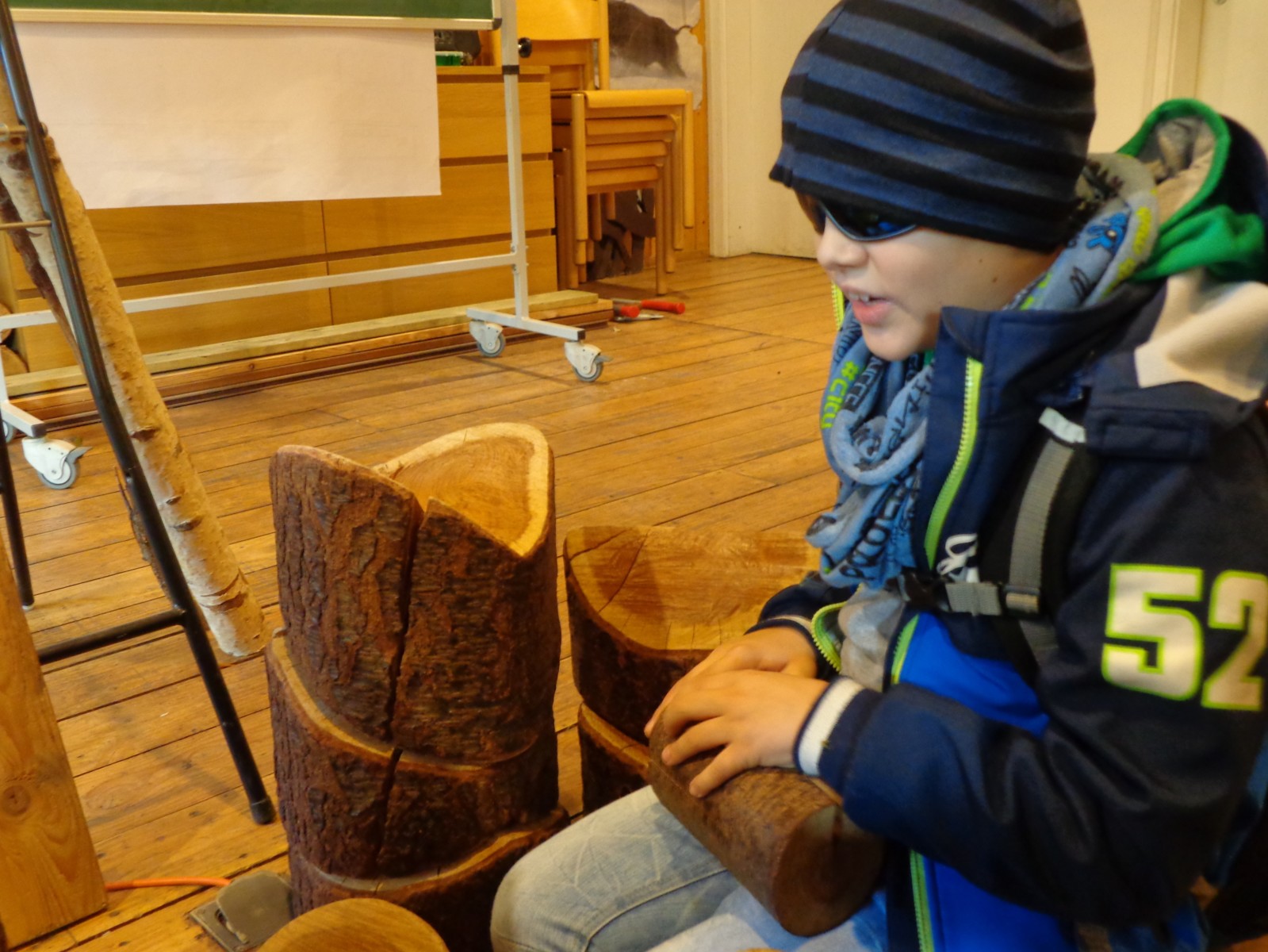 Dort angekommen hat uns Herr Gentner begrüßt. Der Waldpädagoge gab uns die Aufgabe, aus verschiedenen Baumstammstücken zwei Stämme wieder richtig zusammen zu puzzeln. Das war gar nicht so einfach, aber wir haben es schließlich alle gemeinsam hinbekommen.