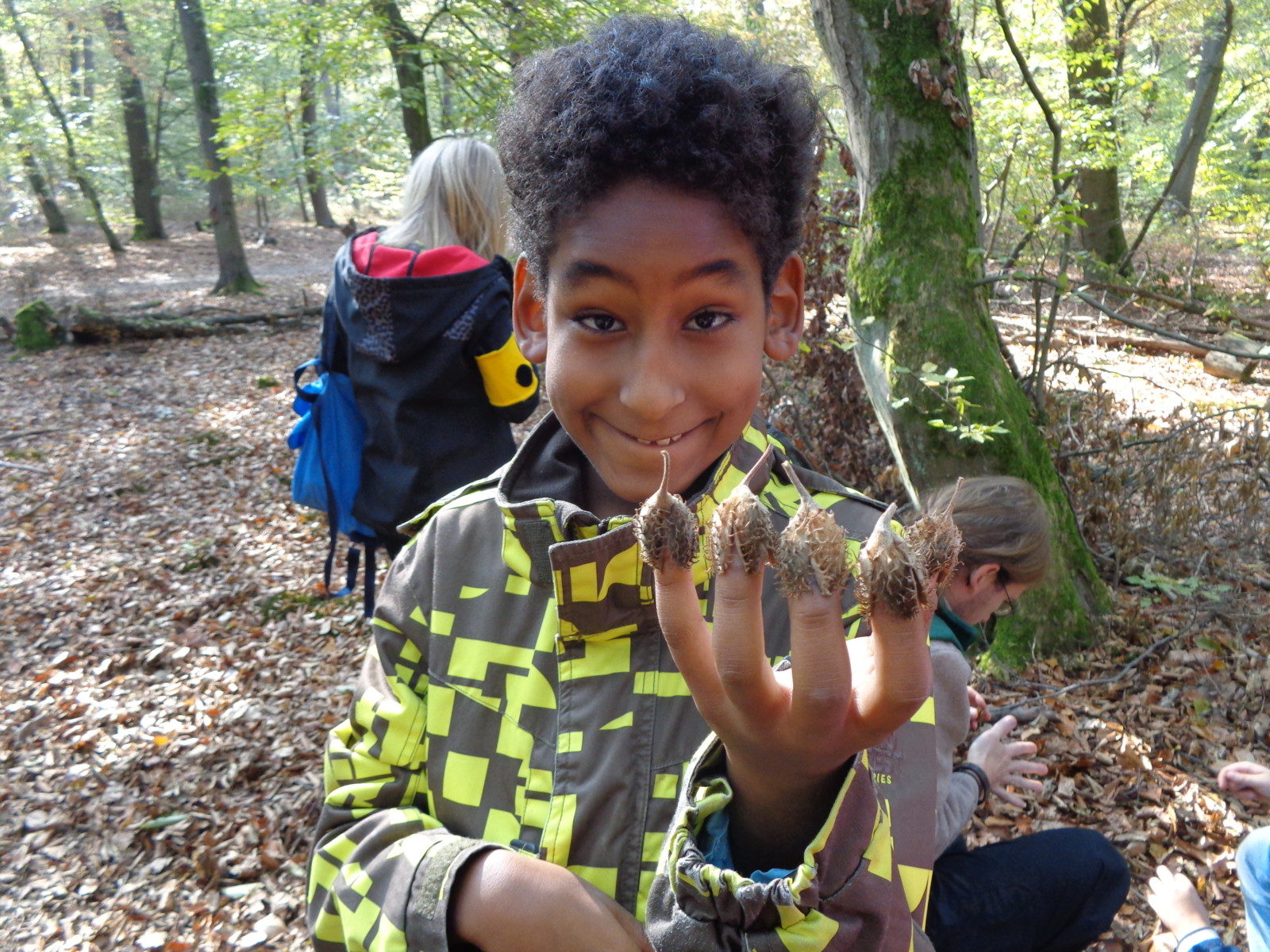 Anschließend sind wir endlich raus in den Wald. Wir haben viele verschiedene Bäume entdeckt und auch ganz viele Eicheln, Zapfen und Bucheckern.