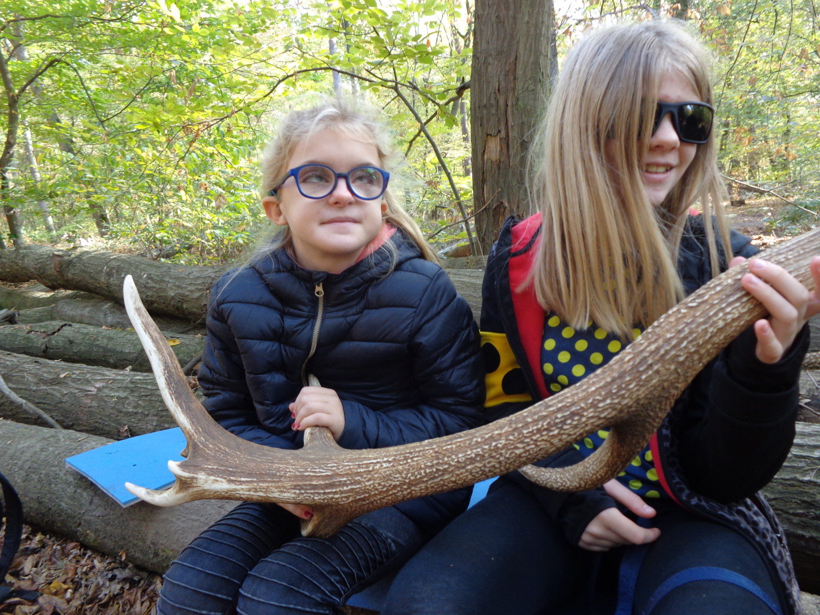Weil es im Wald aber noch ganz viele andere Tiere gibt, die so scheu sind, dass man sie nicht beobachten oder anfassen kann, hat uns Herr Gentner viele verschiedene Tierfelle mitgebracht – ein borstiges Wildschweinfell, ein rotes Fuchsfell und ein schwarz- weißes Dachsfell. Außerdem haben wir die riesigen Geweihe vom Hirsch angefasst und gelernt, dass Geweihe Knochen sind, die besonders schnell wachsen. Jedes Jahr wächst dem Hirsch ein neues Geweih – wirklich beeindruckend!