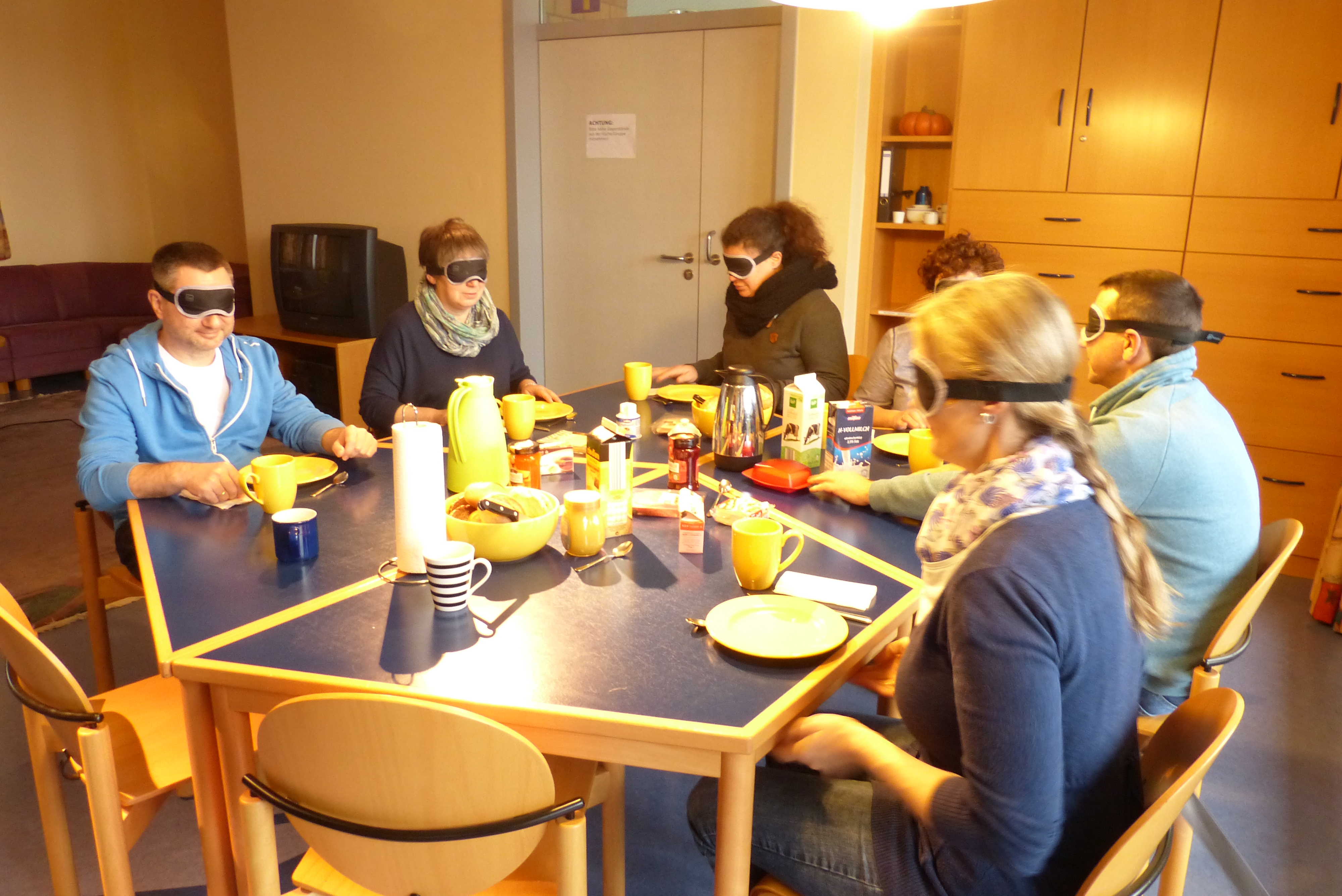 Schon im Vorflur wird es für uns dunkel. Geführt, mit aufgesetzter Augenbinde geht es in einen unbekannten Raum, wo wir an einen Platz am Tisch gebracht werden.