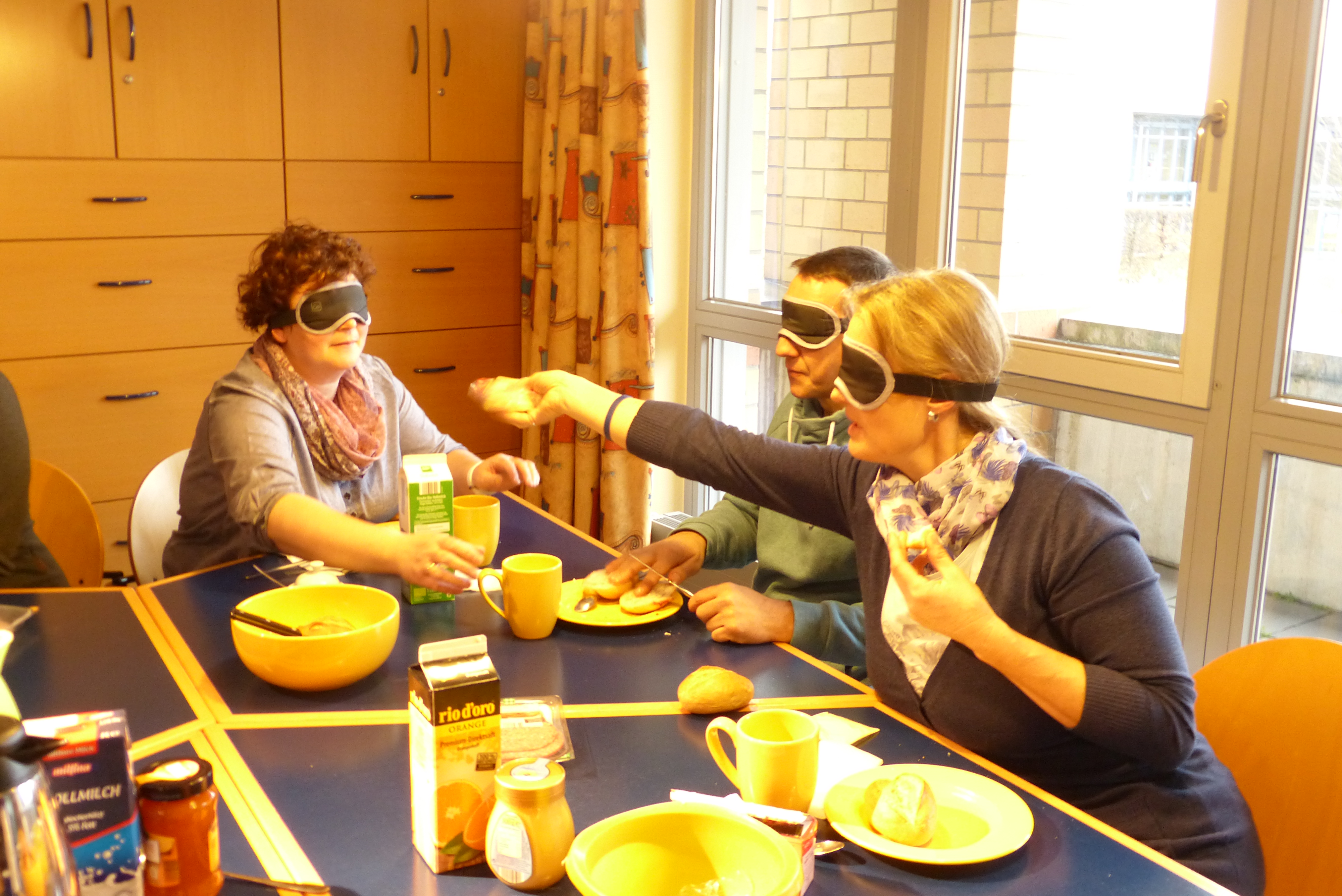 Nicht alles landet gleich auf dem Teller, aber nach einer halben Stunde sind alle entspannt gesättigt und wir legen die Augenbinden ab. Begreifen lernen, wie unsere Kinder ein Frühstück erleben, wie man lernt zu schneiden, zu streichen, einzugießen, welche Tischanordnungen und Hilfen wichtig sind um selbstständig speisen zu können, ist das Thema des Morgens.