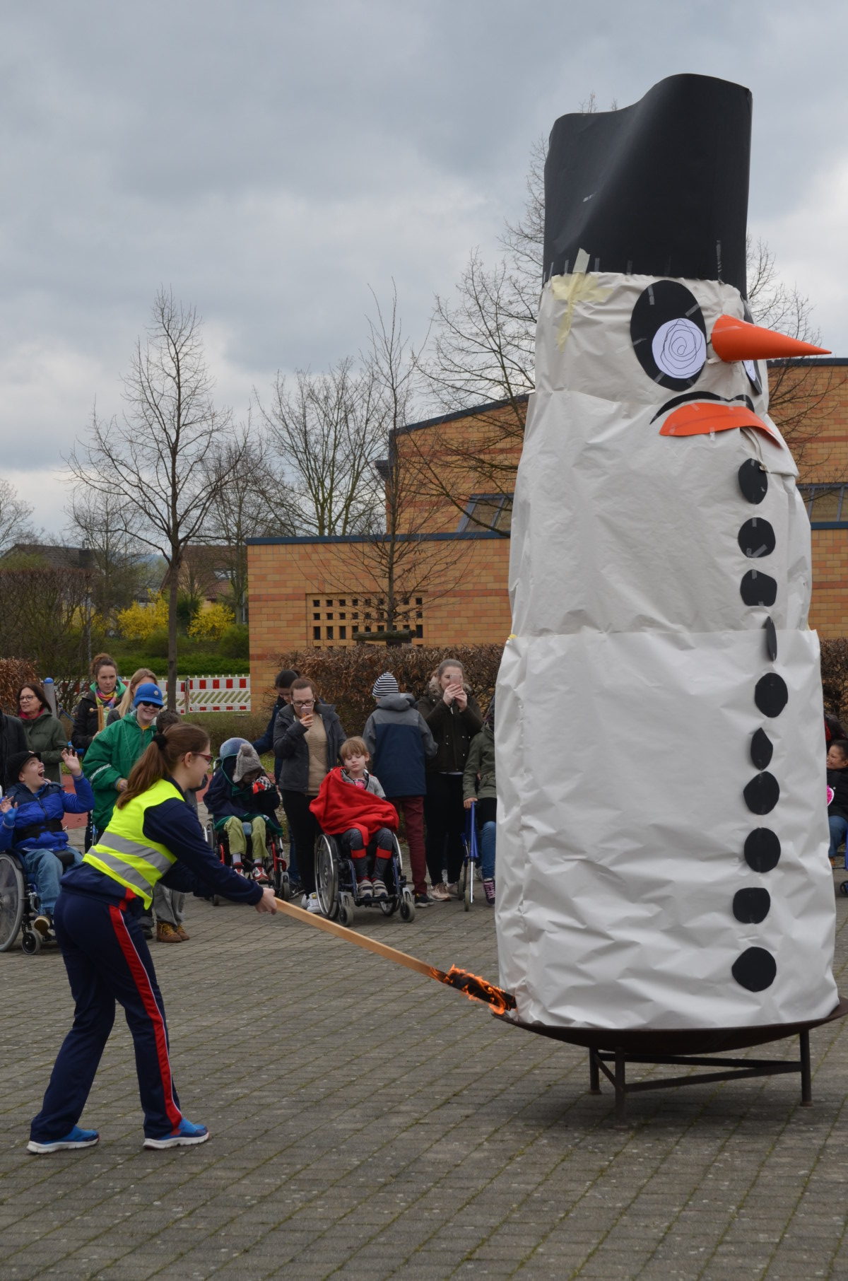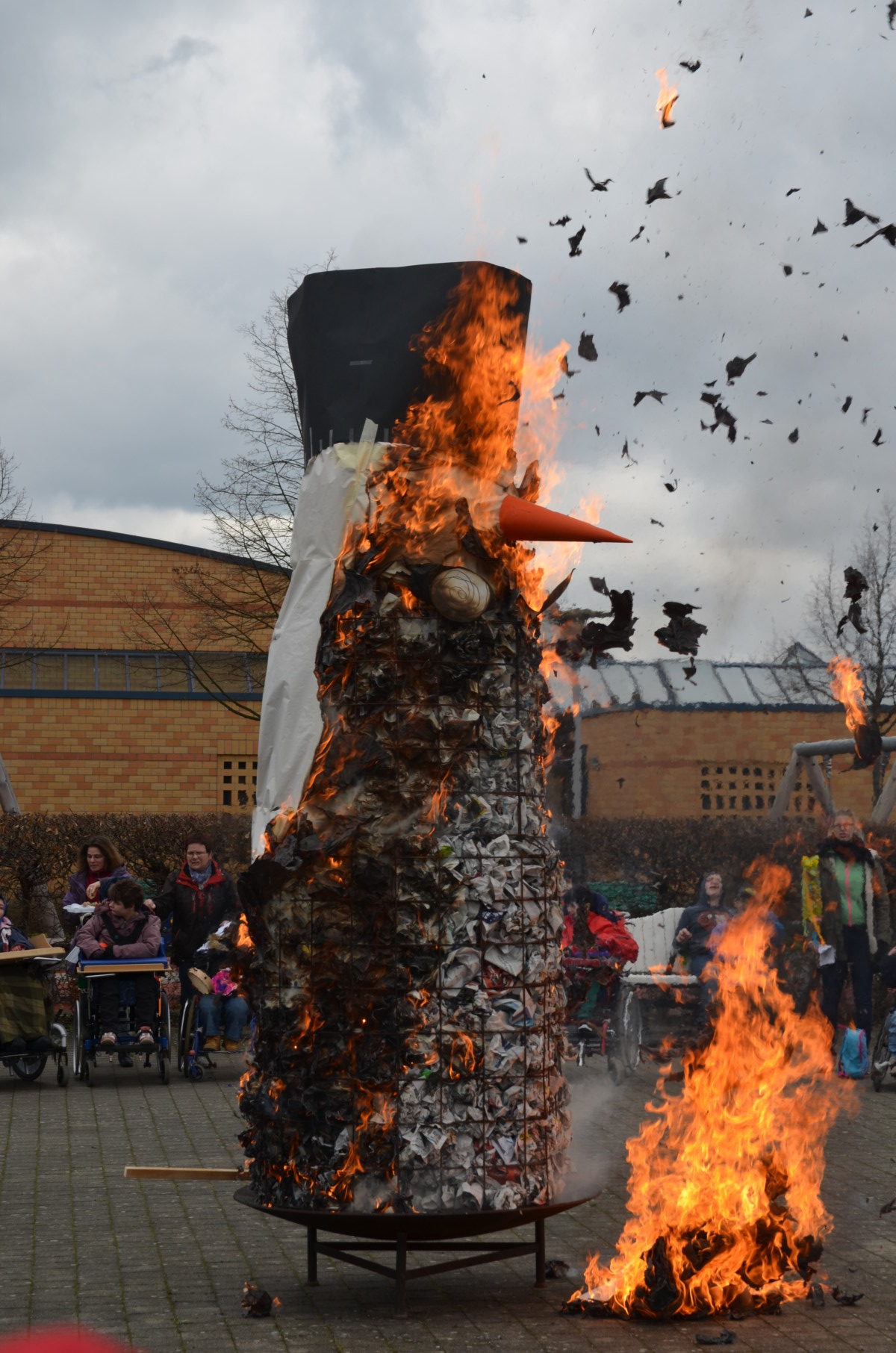 Der riesige Schneemann, den wie jedes Jahr die Berufsschulstufe gebaut hatte, brannte lichterloh und zum Schluss blieb von dem kalten Gesellen nur noch ein Häuflein Asche übrig.