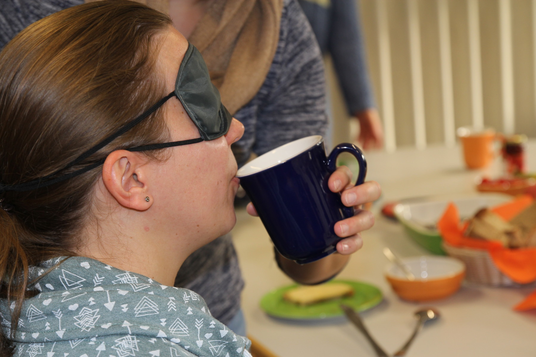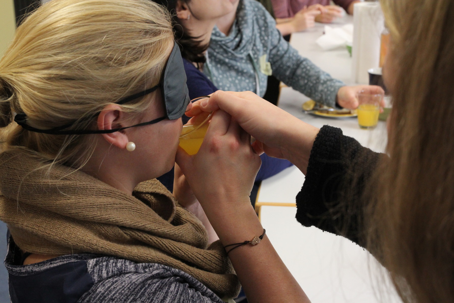 Der Tag begann mit einem „Frühstück“ – Erzieherinnen hatten unter der Augenbinde die Chance, zu erfahren, wie es ist, Essen gereicht zu bekommen. Alle waren sehr beeindruckt, am eigenen Leib zu erfahren, wie es ist, wenn keine Handlung und kein Essen angekündigt werden; wenn der Lärmpegel hoch ist; wenn ein kalter Metalllöffel in den Mund geschoben wird; wenn das Getränk nicht dosieren werden kann usw. usw..
