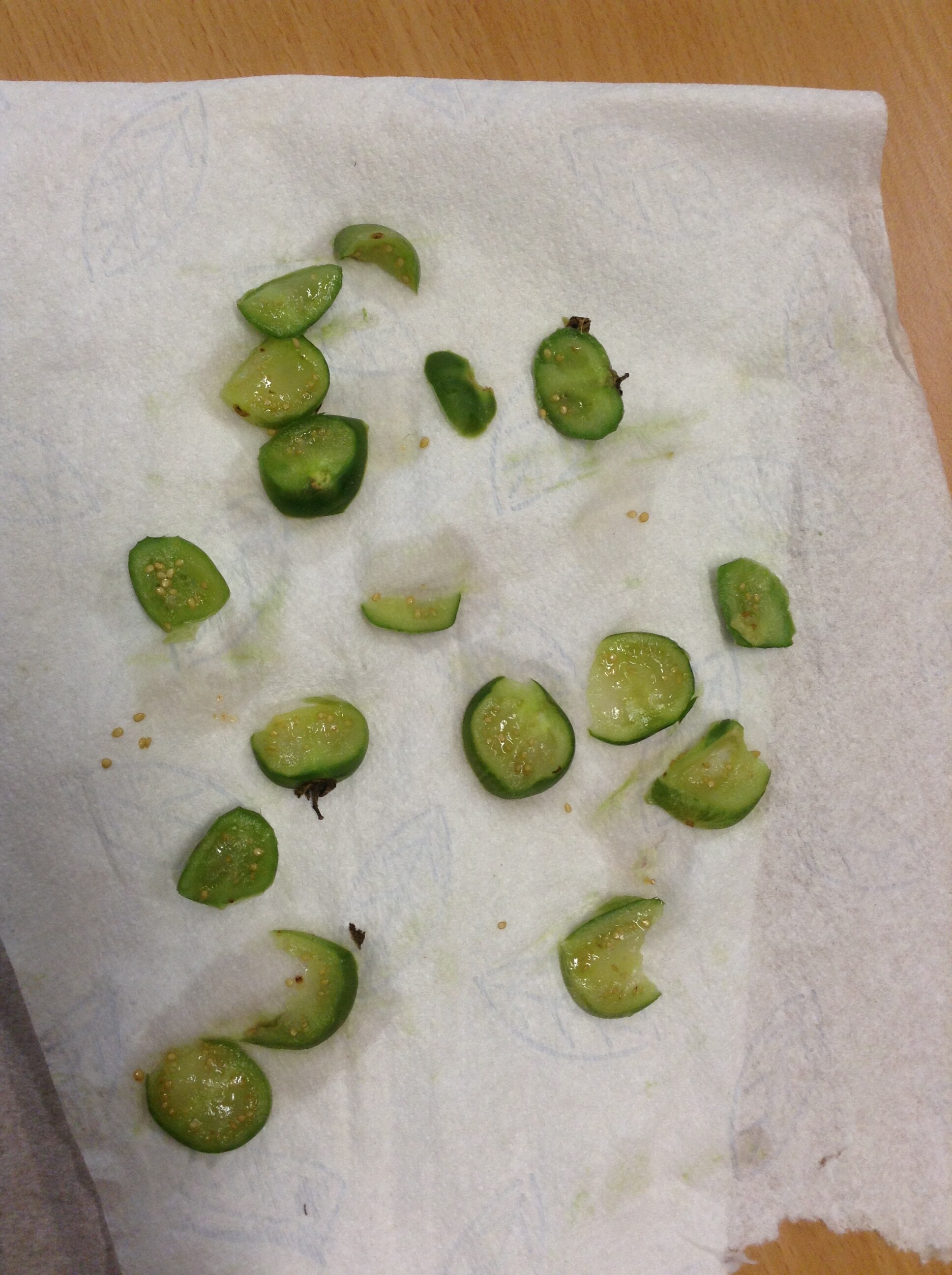 Geblüht haben während der ganzen Zeit nur wenige Kartoffelpflanzen, am besten die vom hohen Kartoffelturm von Frau Walz. Da sind dann auch viele Beeren gewachsen, die wir aufgeschnitten haben. Es sind unglaublich viele winzige Samenkörner in den Kartoffelbeeren. Wir haben die Kartoffelbeeren in dünne Scheiben geschnitten und getrocknet. Im Frühjahr wollen wir die Samen einpflanzen – was in der Kartoffelforschung zur Verbesserung von Eigenschaften der Kartoffel gemacht wird und auch in Sri Lanka zum Beispiel und anderen subtropischen Regionen, weil man Pflanzkartoffeln dort nicht gut lagern kann. Wir sind gespannt!