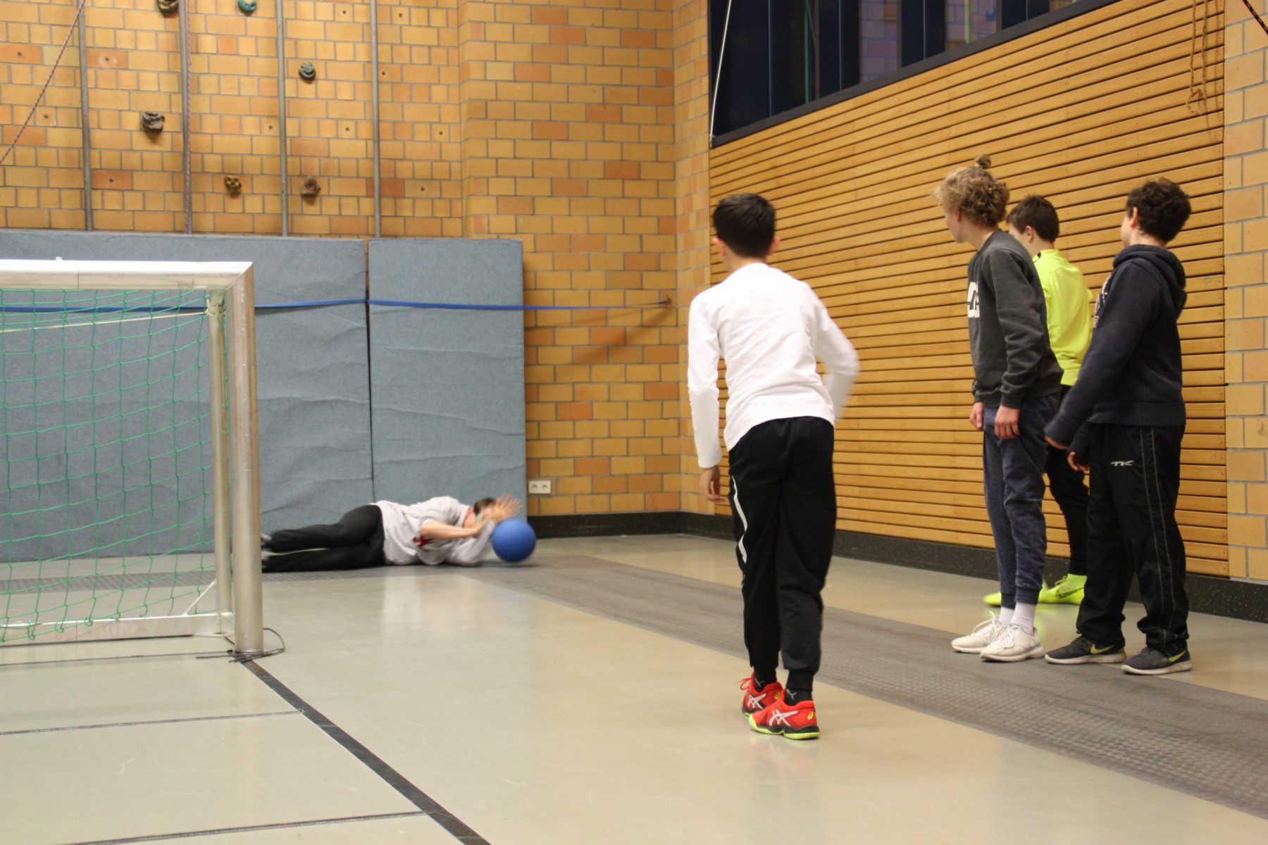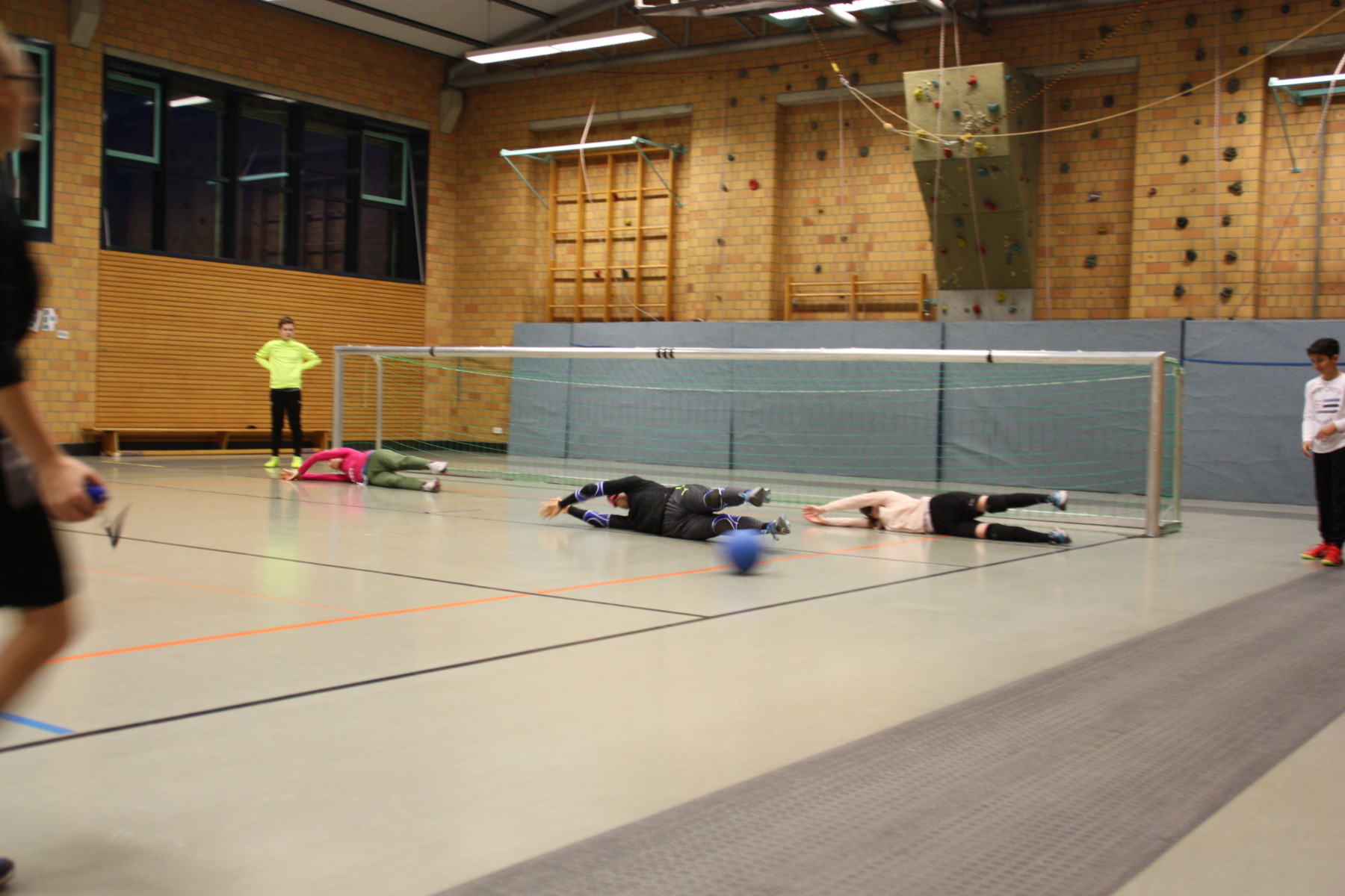 Davon motiviert legten dann auch schon die Gäste los. Aufgeteilt in vier Teams wurde ein kleines Turnier mit vielen Toren ausgetragen. Natürlich fanden nicht alle Bälle den Weg ins Tor, viele wurden auch mehr oder minder konventionell abgewehrt. Zuspiele des Mitspielers landeten auch mal im eigenen Tor, der eine oder andere fand die Orientierungsmarkierungen nicht und die Highball-Linie war irgendwie auch des öfteren mal viel zu nah am eigenen Tor, sodass auch der ein oder andere Penalty bewundert werden konnte.