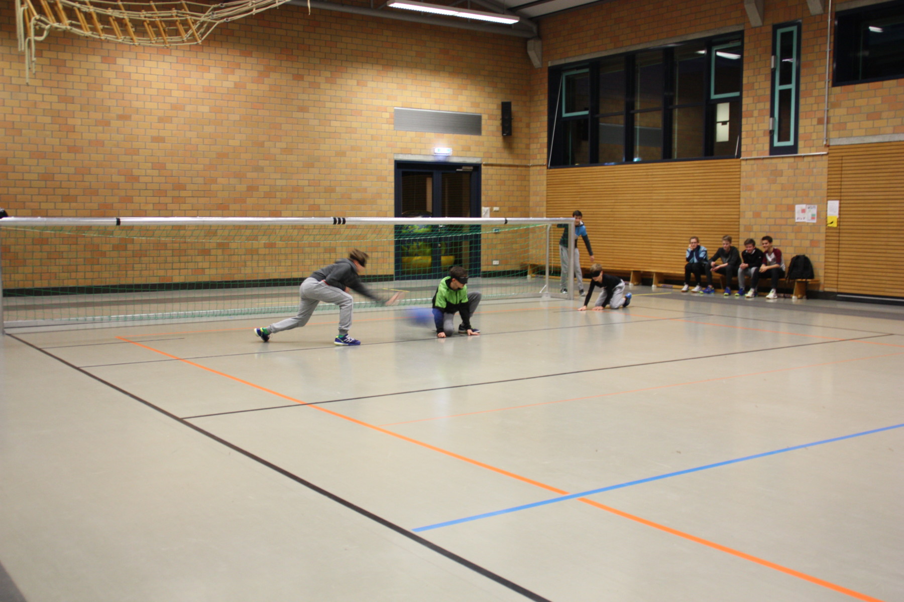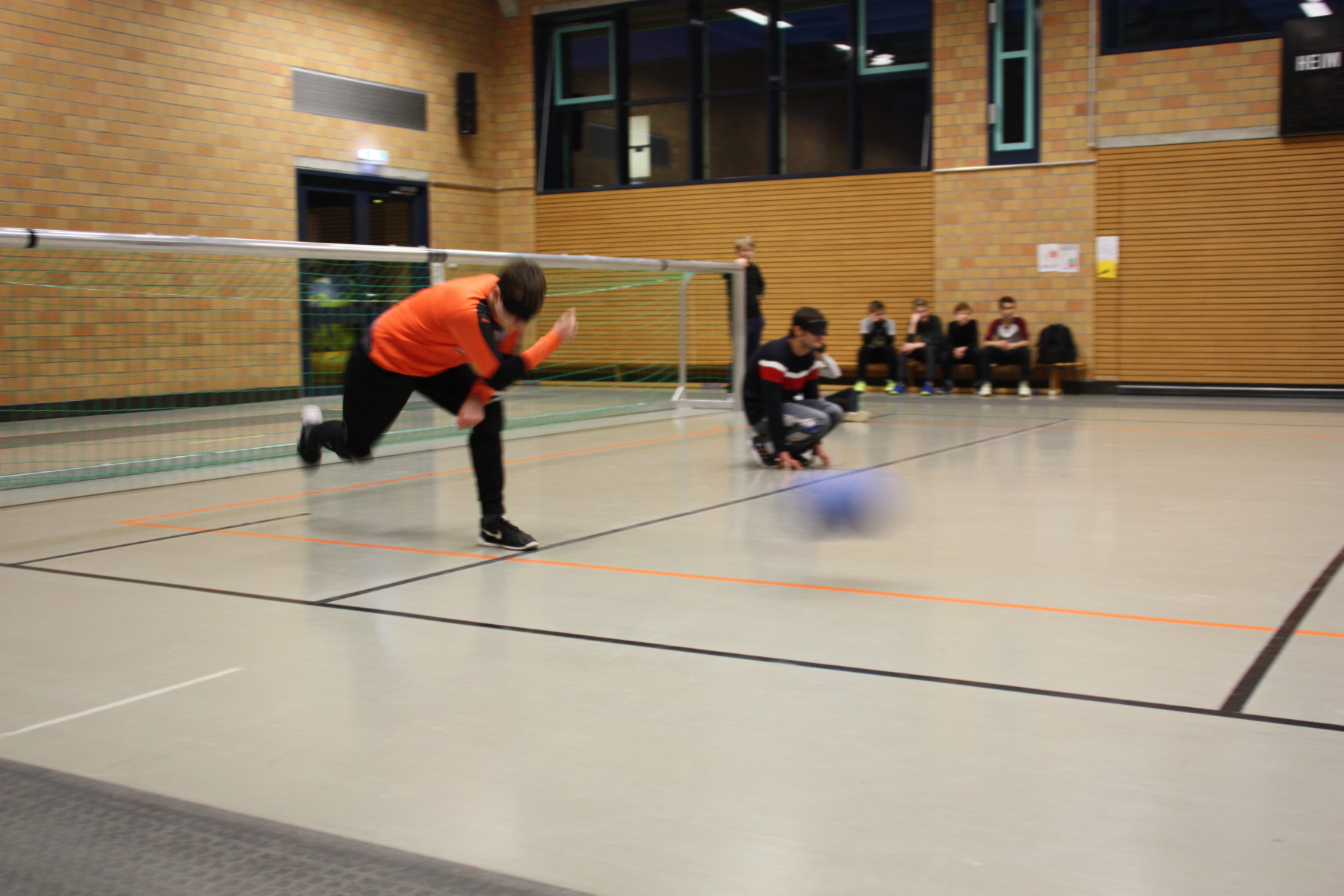 Doch dann wurde es spannend: Die Abwehrhaltung, die für das Goalball-Spiel ganz wichtig ist, wurde von den erfahrenen Spielern demonstriert und erklärt. Dann ging es in Kleingruppen und die llvesheimer Spieler coachten die Jungs des TSV Mannheims, korrigierten die Abwehrhaltung und gaben wertvolle Tipps, wie man z.B. den Kopf schütz, um nicht den 1,25kg schweren Klingelball an die Rübe zu bekommen.