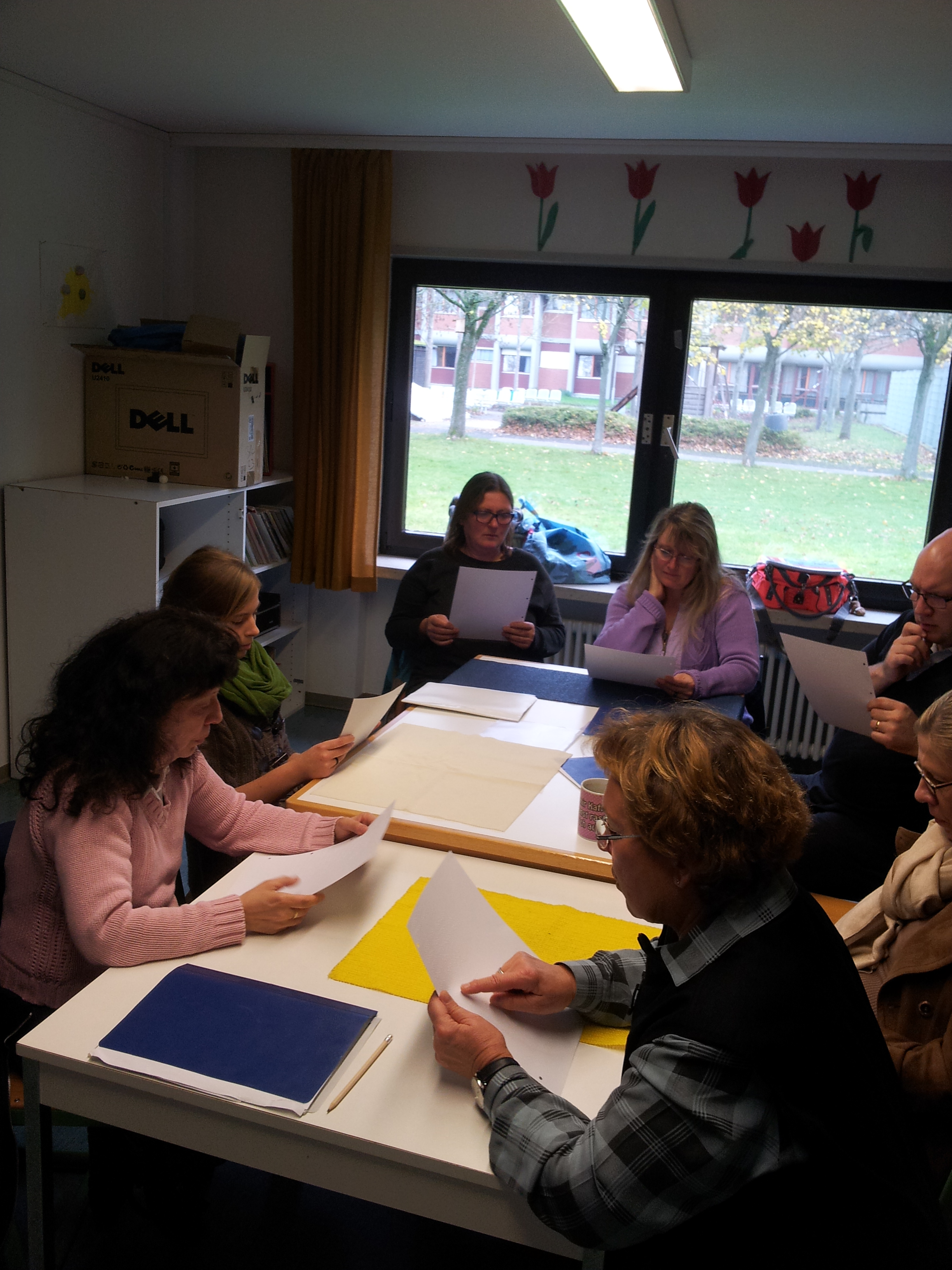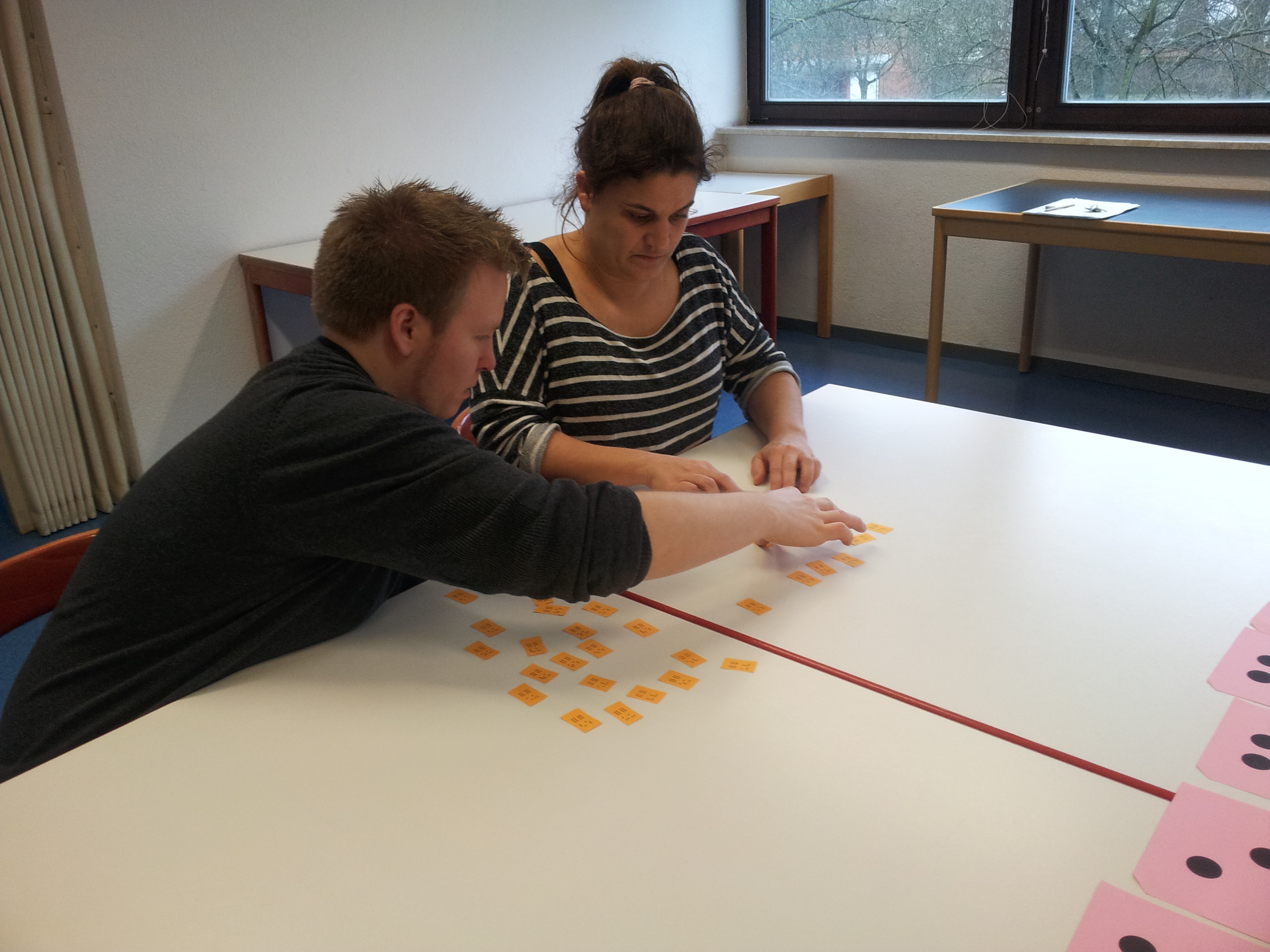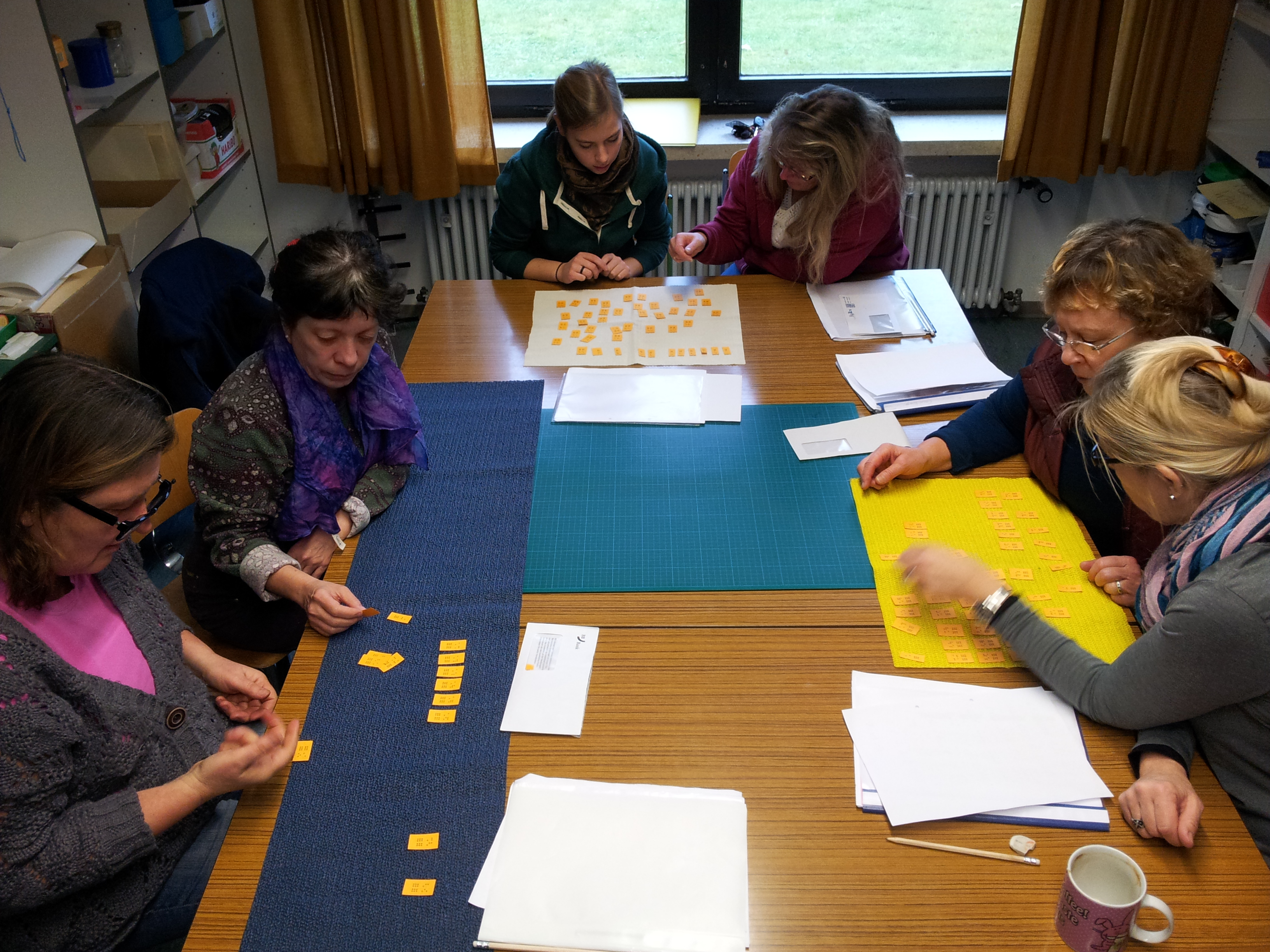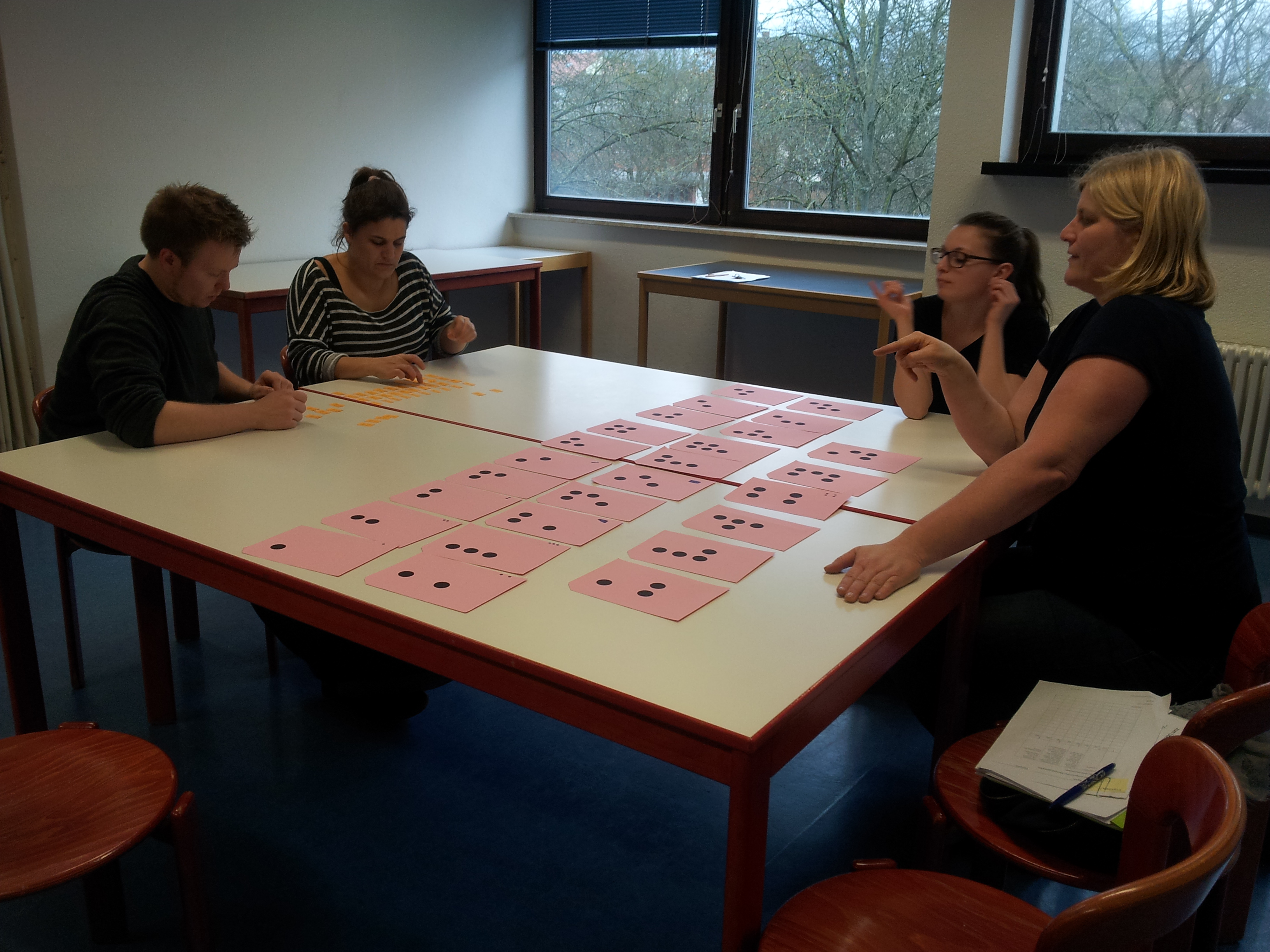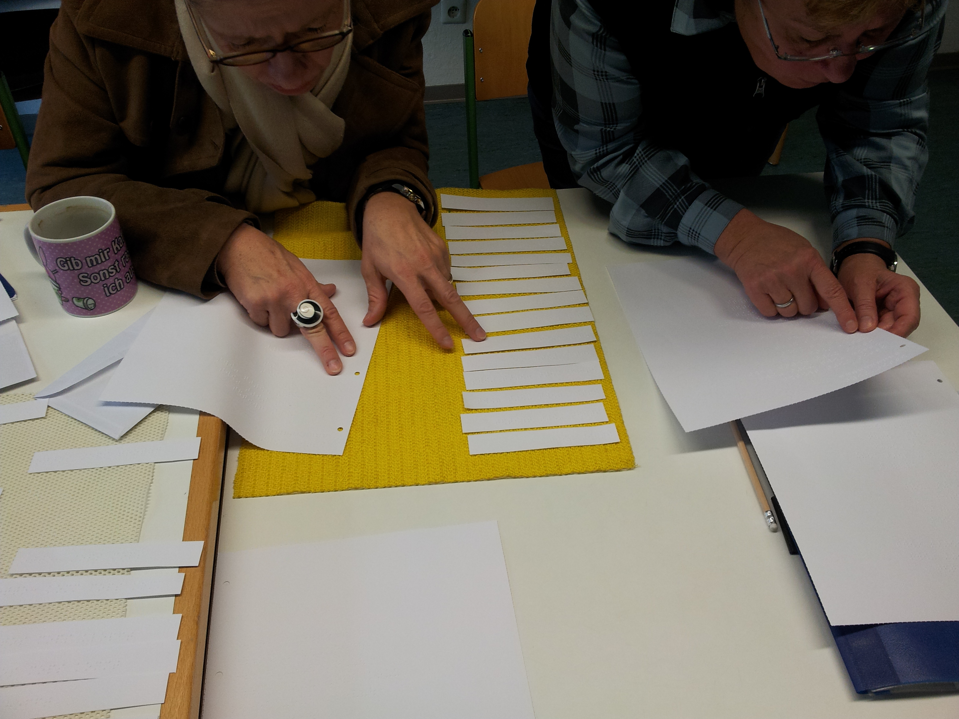 Seit mehreren Jahren findet hausintern eine Qualifikationsmaßnahme für Mitarbeiter zum Erlernen der Blindenschrift statt. In Kleingruppen erarbeiten wir über mehrere Monate hinweg alle Buchstaben, Zahlen und Zeichen und festigen sie in vielen Übungen lesend und schreibend. So wird immer wieder ein „Kärtchensalat“ sortiert, sich auf die Suche nach absichtlich eingefügten Fehlern gemacht, gegenseitig ein Briefchen geschrieben usw. Wir vergleichen außerdem die unterschiedlichen Blindenschriftsysteme und bereiten Dokumente und Internetinhalte für den Brailledruck vor.