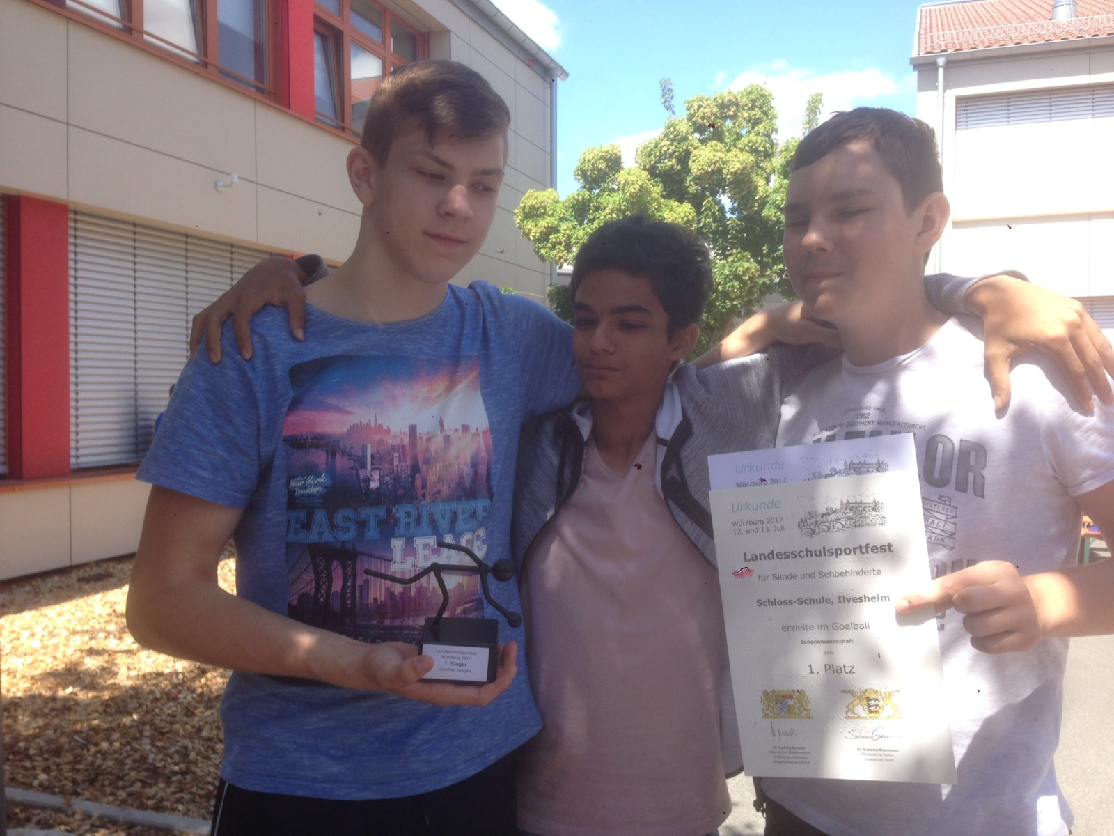 Nach dem etwas feuchten Start in das Landesschulsportfest standen nach der Übernachtung in der Jugendherberge am nächsten Tag die Wettkämpfe im Schwimmen und Goalball an. Leonie, Dana und Jan gingen für die Schloss-Schule im Schwimmbecken an den Start. Dabei schwamm Jan – sowohl im Freistil als auch beim Brustschwimmen – über die 25 Meter aufs Treppchen und holte sich in beiden Fälle die Bronze-Medaille!