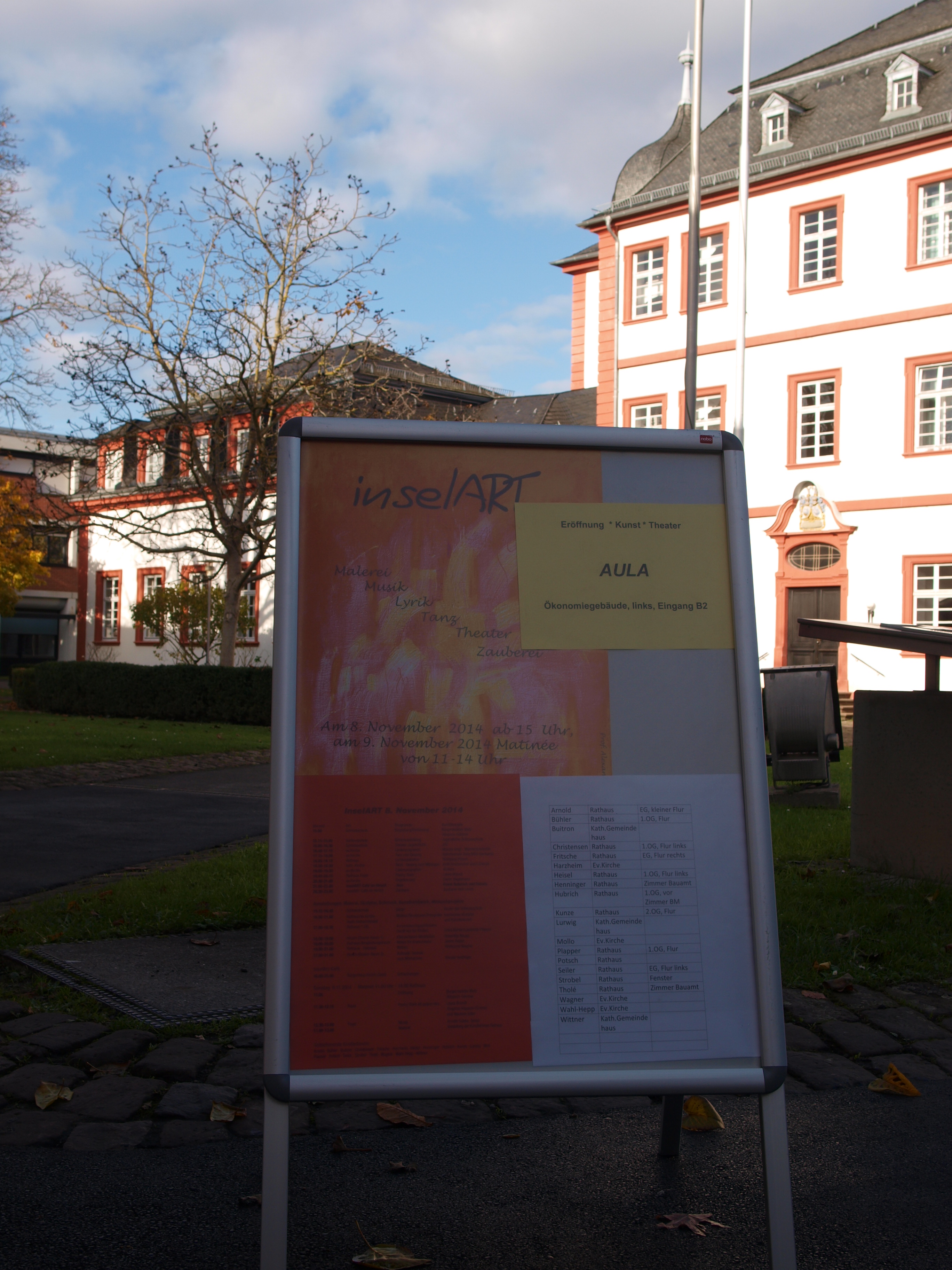 In diesem Jahr beteiligte sich die die Schloss-Schule zum ersten Mal aktiv an Inselart und stellte unterschiedliche Kunstwerke aus dem Schulunterricht und einer Internats-Kunst-Gruppe vor. Bilder, Skulpturen, Drahtgebilde, Masken und eine Schneckenparade begeisterten die Zuschauer. Diese, bestimmt 70 an der Zahl, blieben nach einer gelungenen Eröffnung des Gesamt-Events in unserer Aula noch eine ganze Weile im Raum und betrachteten die ausgestellten Objekte oder informierten sich anhand eines Videofilmes über den Entstehungsprozess und die Gedanken der Künstler, also unserer Schüler.