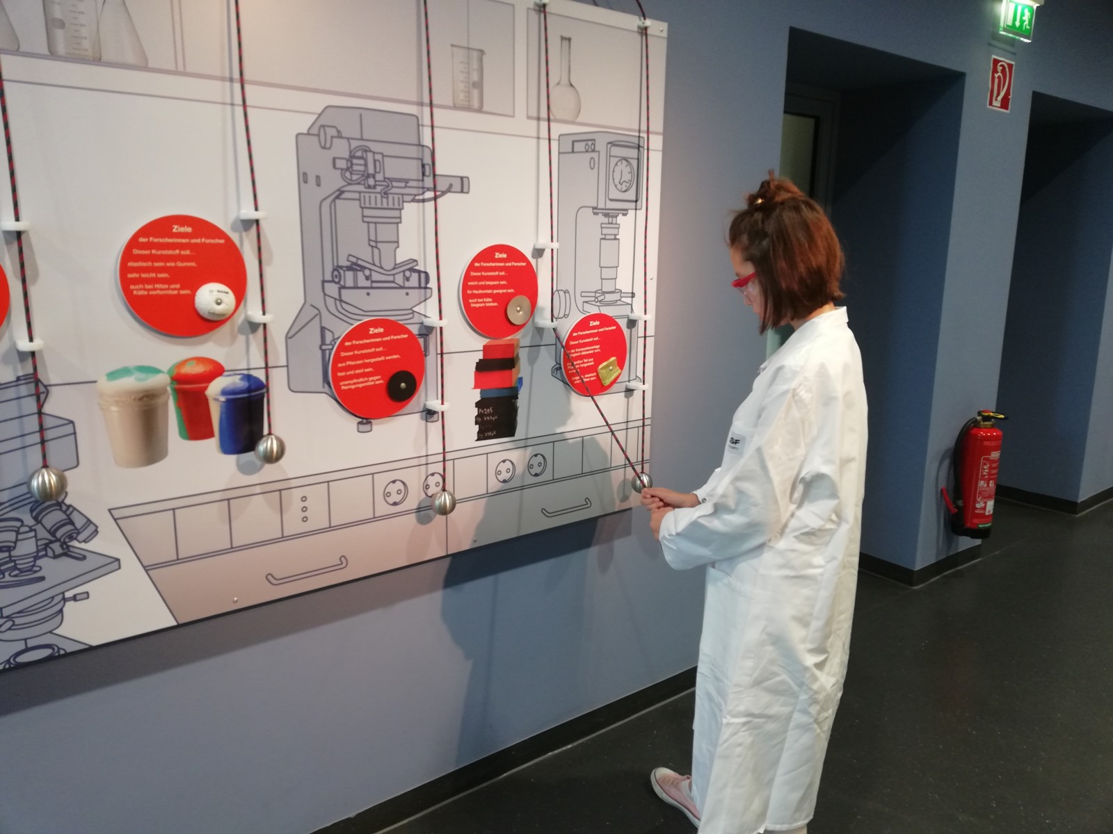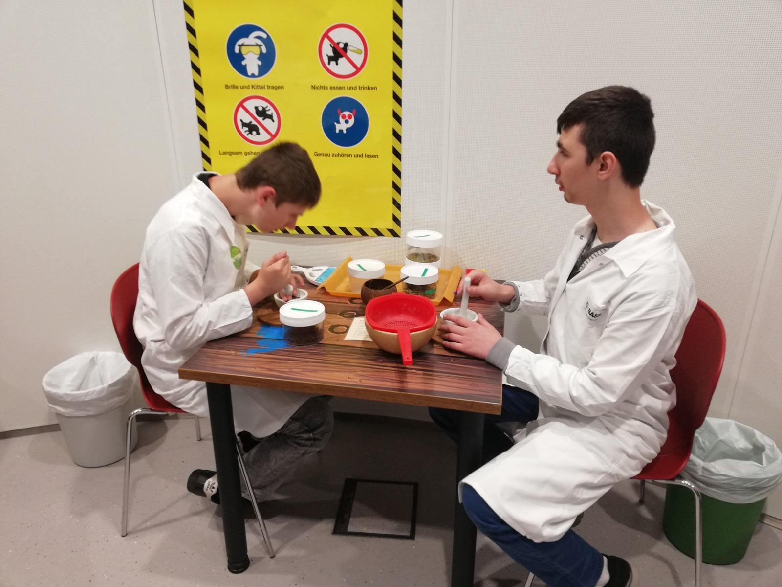 Schüler und Lehrer wurden im Besucherzentrum herzlich empfangen und sofort zu den Laboren begleitet, wo es schon gleich mit spannenden Informationen rund um die BASF losging. Erstaunlich war die Information über die Größe des Geländes, das ca. 10 km² groß ist und 1200 Gebäude umfasst. Es ist wahrlich eine Stadt in der Stadt mit allem was dazugehört – Bäcker, Reinigung, Friseur, Fitness Center… außerdem besitzt die BASF eine eigene Buslinie und 12000 Werksfahrräder. Natürlich wurde über Schutzmaßnahmen und Regeln im Labor aufgeklärt und dann ging’s los. Ausgestattet mit Laborkittel und Schutzbrillen sahen alle aus wie echte Forscher!
