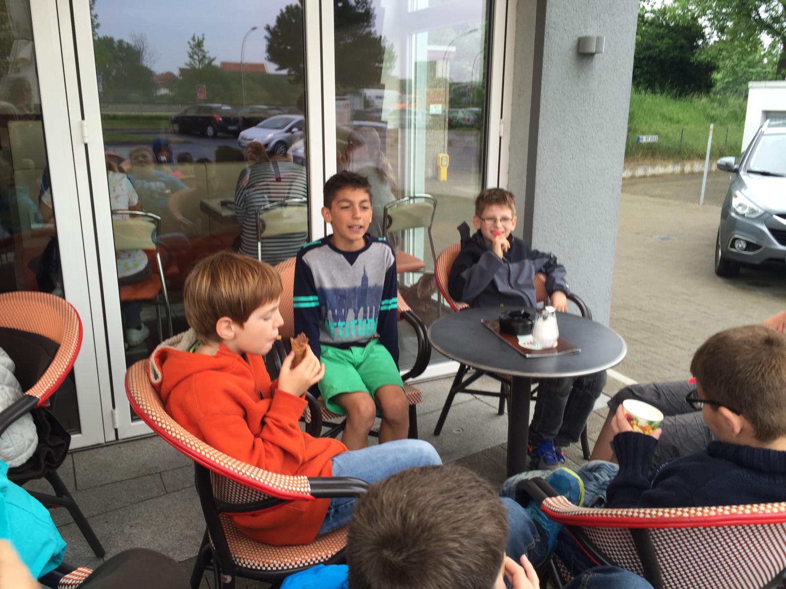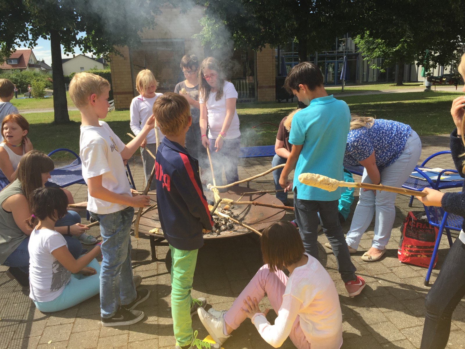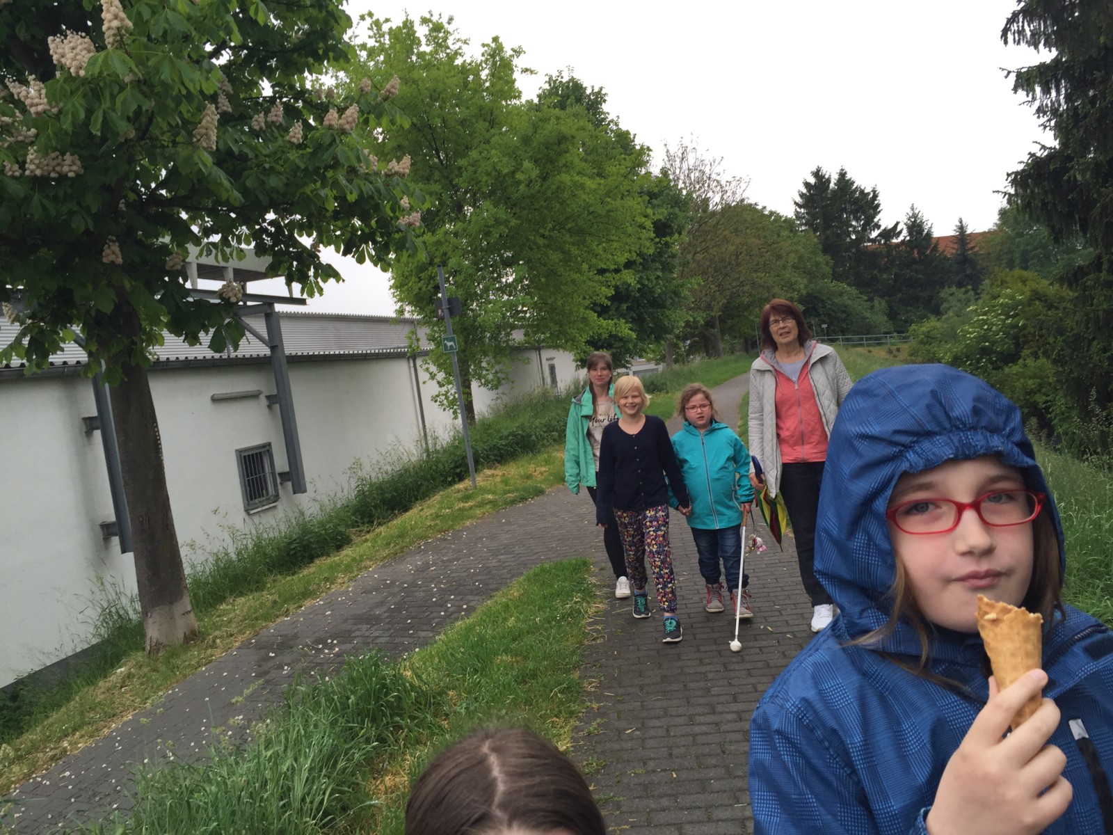 Bei den darauffolgenden Treffen, war die Idee immer ein Angebot zu machen, wie z.B. Bilderrahmen aus Salzteig herzustellen, Geschmacksquiz, Kennenlernen der Blindenschrift (durch Legesteine sowie speziellen Schreibmaschinen) und den Rest der Zeit zum Freispiel, Toben, Gespräche und Begegnungen zu zulassen. Damit hatten wir einen großen Erfolg, da jedes Kind davon profitieren konnte und die Interessen aller umgesetzt werden konnten. Somit verpackten wir einmal mehr die Interessen aller, indem wir einen Ausflug zur Eisdiele unternahmen und dabei die Kinder der FES Blindenstock führen, Blindenampeln sowie Treppensteigen kennenlernen konnten. Dabei lernten alle Rücksicht auf jeden einzelnen zu nehmen, geduldig sowie empathisch zu sein. Sie bekamen einen Einblick in die Welt der Blinden und Sehbehinderten und umgekehrt und konnten somit viele interessante Informationen mit nach Hause zu nehmen. Als krönenden Abschluss veranstalteten wir auf dem Gelände der Blindenschule, ein gemütliches Zusammensein, um eine Feuerschale, bei dem jedes Kind sein eigenes Stockbrot backen durfte. Dabei entstanden viele tolle Momente, wobei die Kinder sich wieder gegenseitig unterstützten und zum Schluss ein Erfolgserlebnis hatten, als das Brot von jedem fertig war und sie es gemeinsam verzehren konnten. Außerdem war auf dem Gelände drum herum (Spielplatz, Trampolin, Fußballplatzt) für die Dynamik der Gruppe genügend Freiraum gegeben.