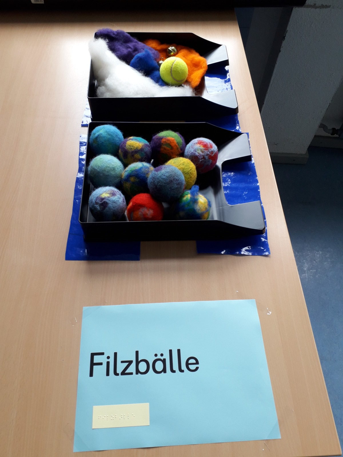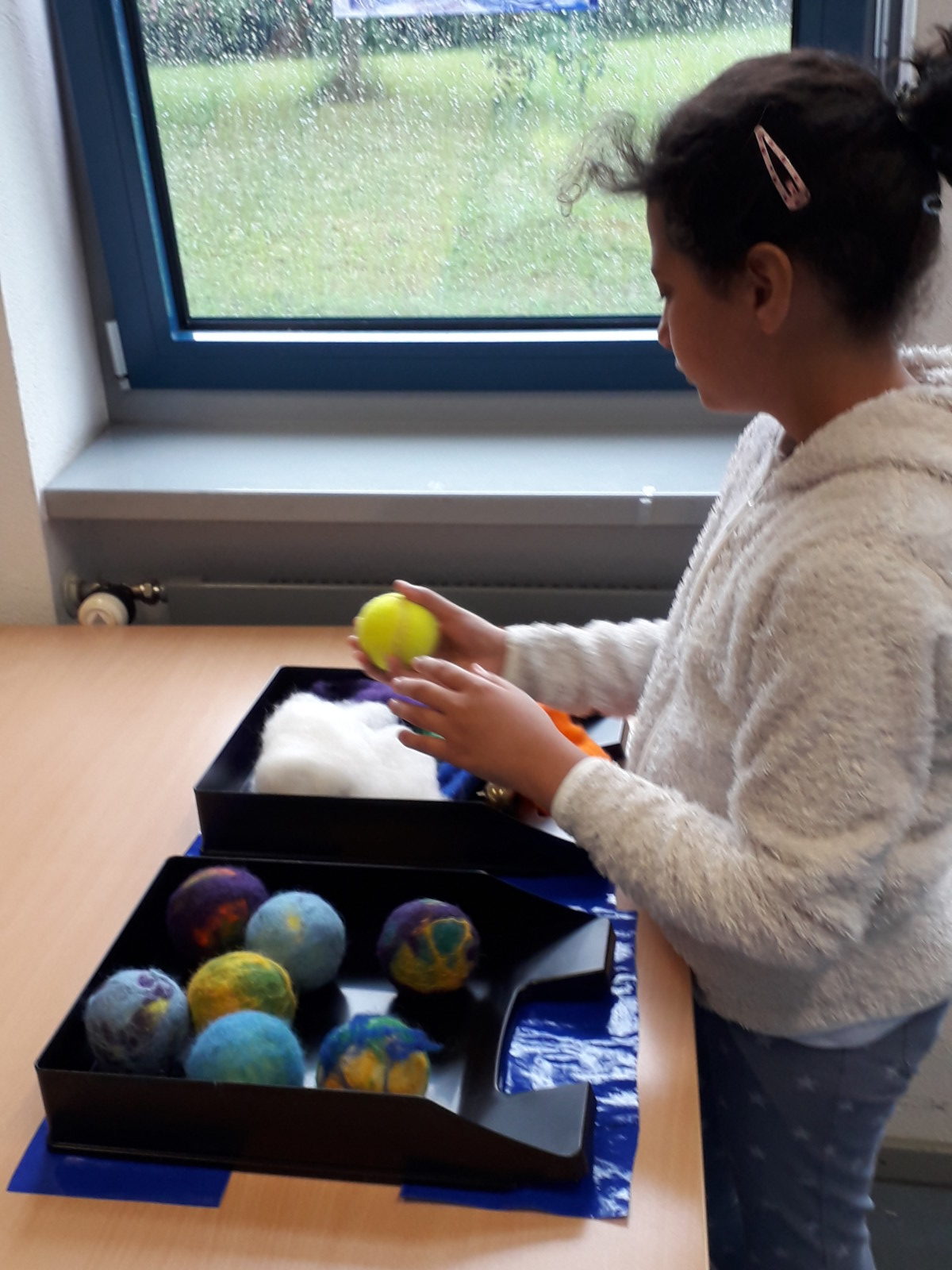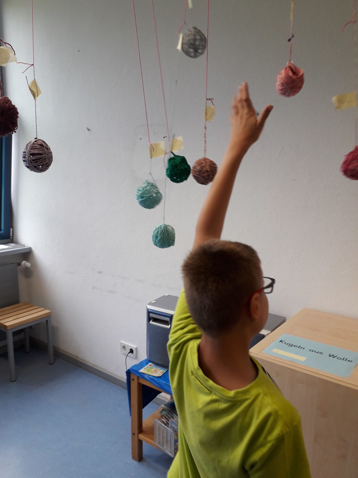Nach einer kurzen Begrüßung durch die Schülerinnen und Schüler konnten die Besucher die unterschiedlichen Kunstwerke anschauen, untersuchen und teilweise sogar ausprobieren. So war es z.B. möglich, die gefilzten Tennisbälle, die vorher mit Glöckchen gefüllt worden waren, gleich beim Kegeln zu testen. Mit umfilzten Stiften wurden Schreib- und Malversuche unternommen und die aufgehängten Wollbälle wurden vorsichtig bewegt.