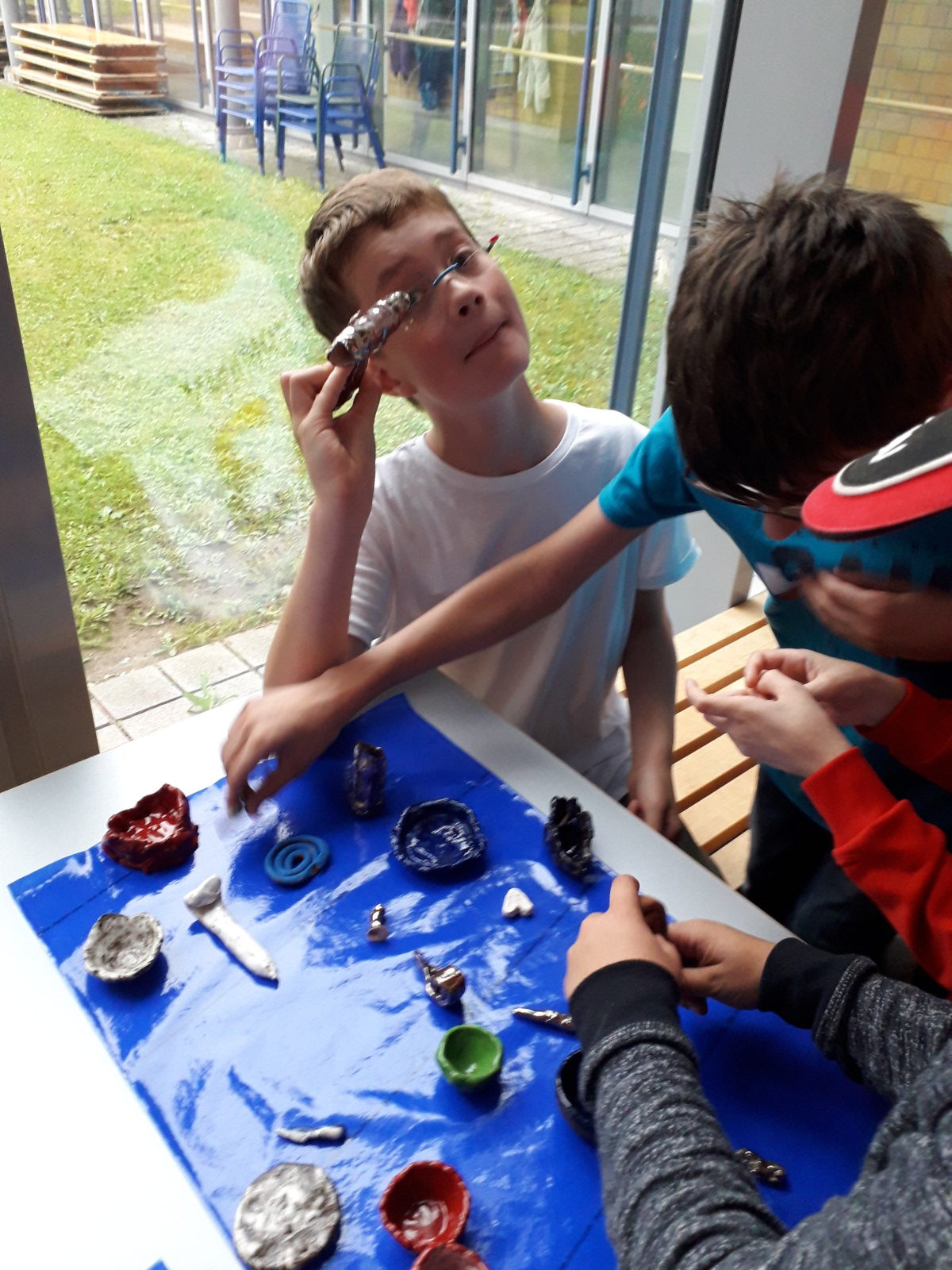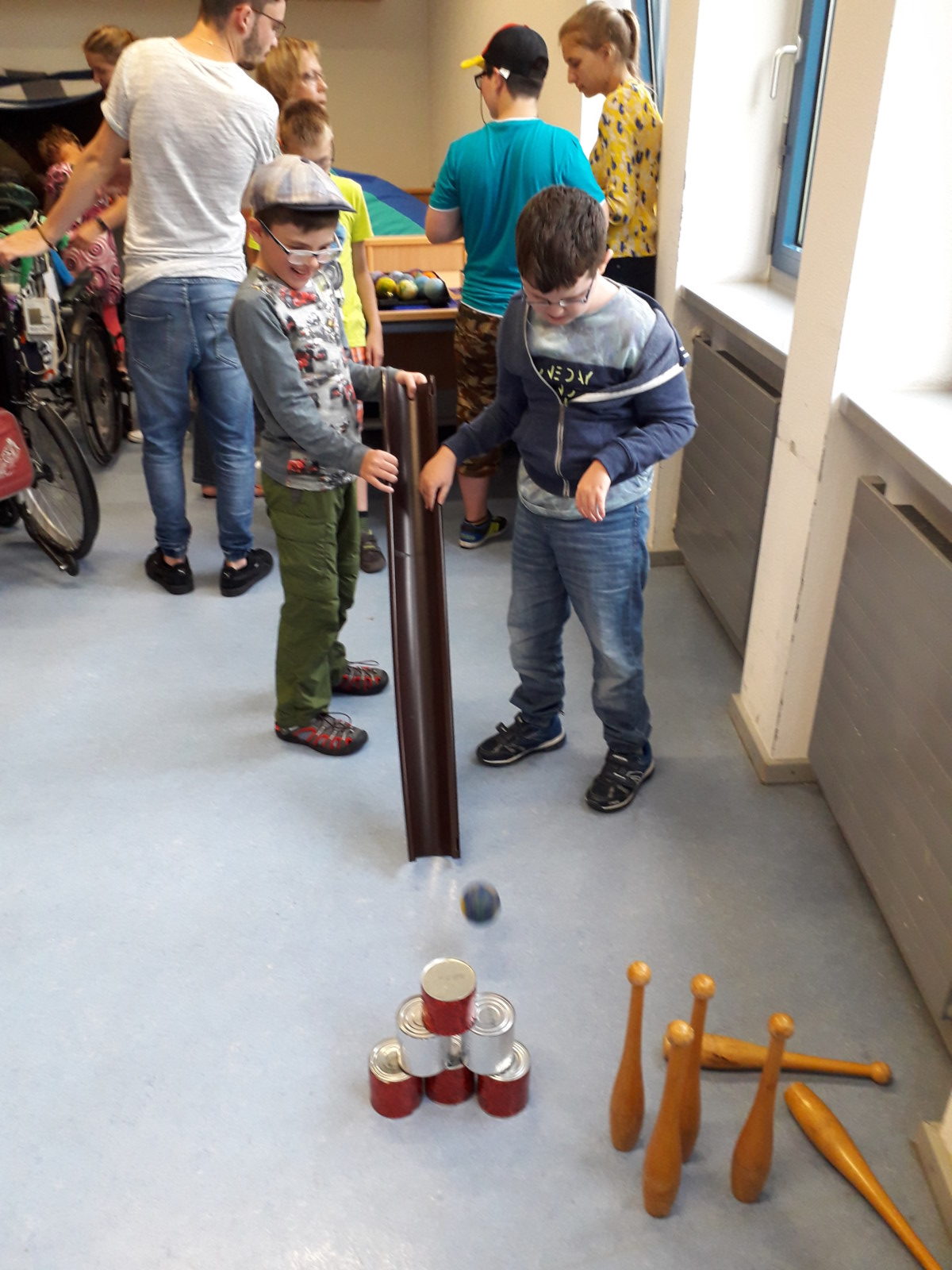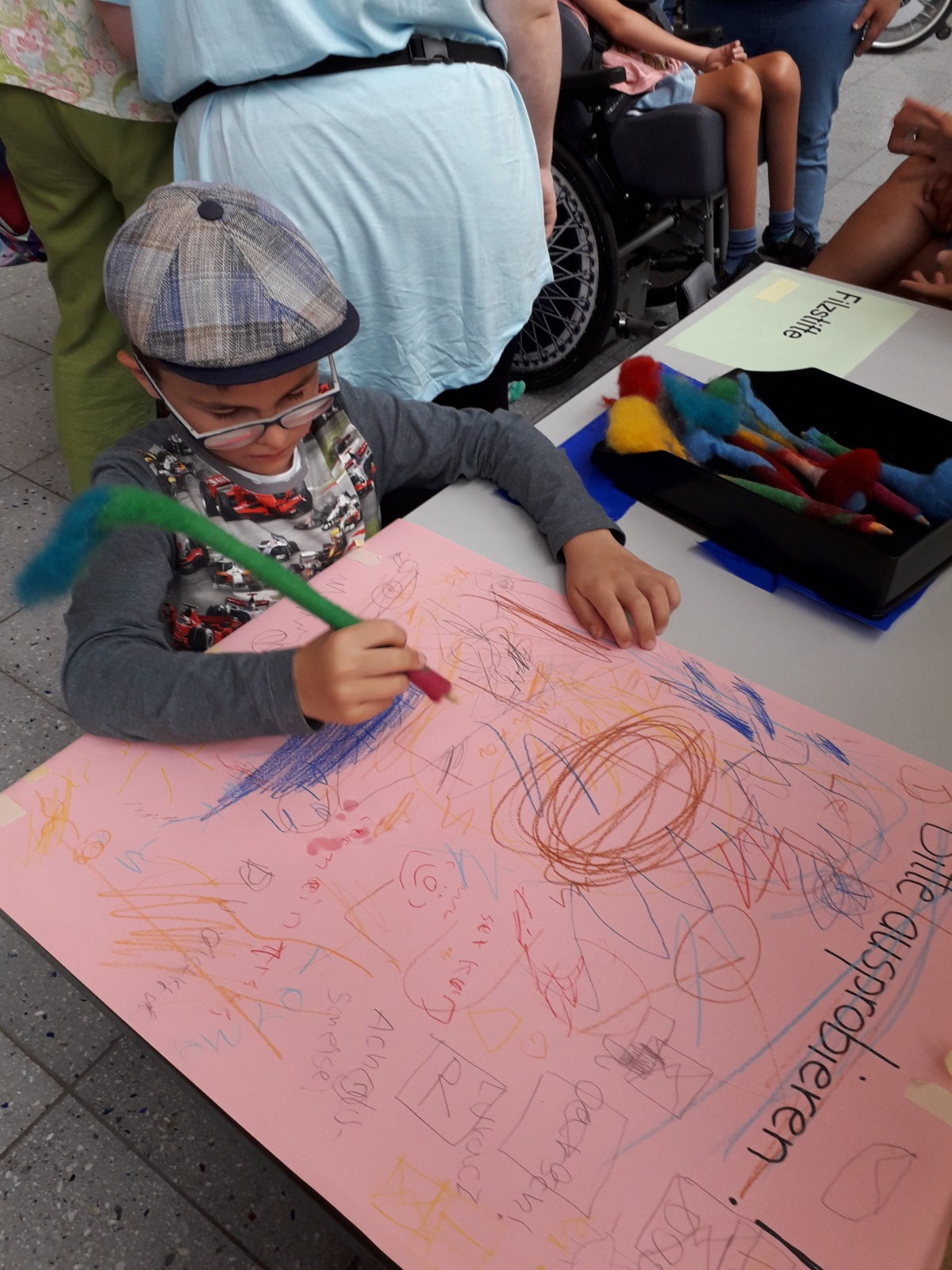 Nach einer kurzen Begrüßung durch die Schülerinnen und Schüler konnten die Besucher die unterschiedlichen Kunstwerke anschauen, untersuchen und teilweise sogar ausprobieren. So war es z.B. möglich, die gefilzten Tennisbälle, die vorher mit Glöckchen gefüllt worden waren, gleich beim Kegeln zu testen. Mit umfilzten Stiften wurden Schreib- und Malversuche unternommen und die aufgehängten Wollbälle wurden vorsichtig bewegt.