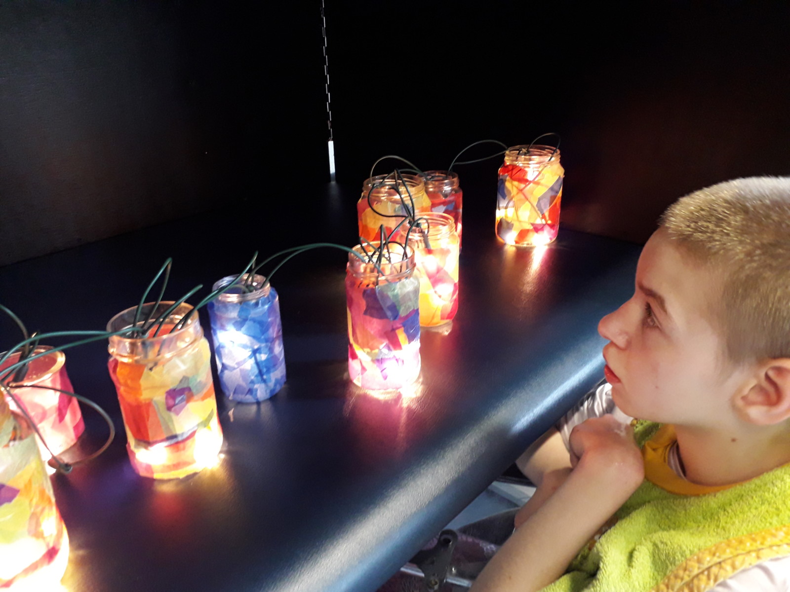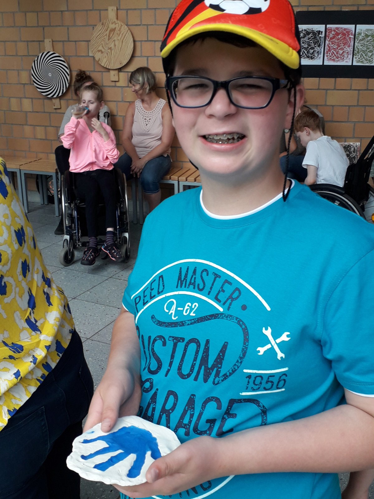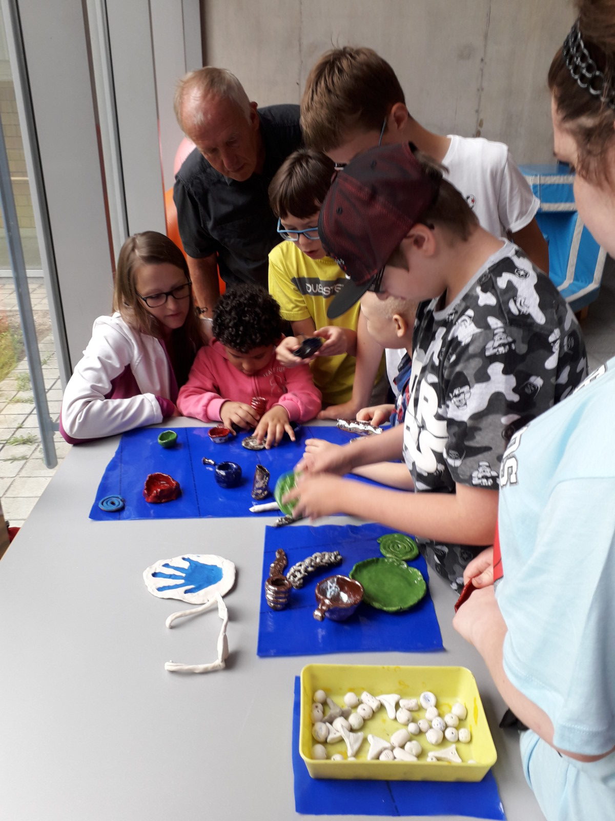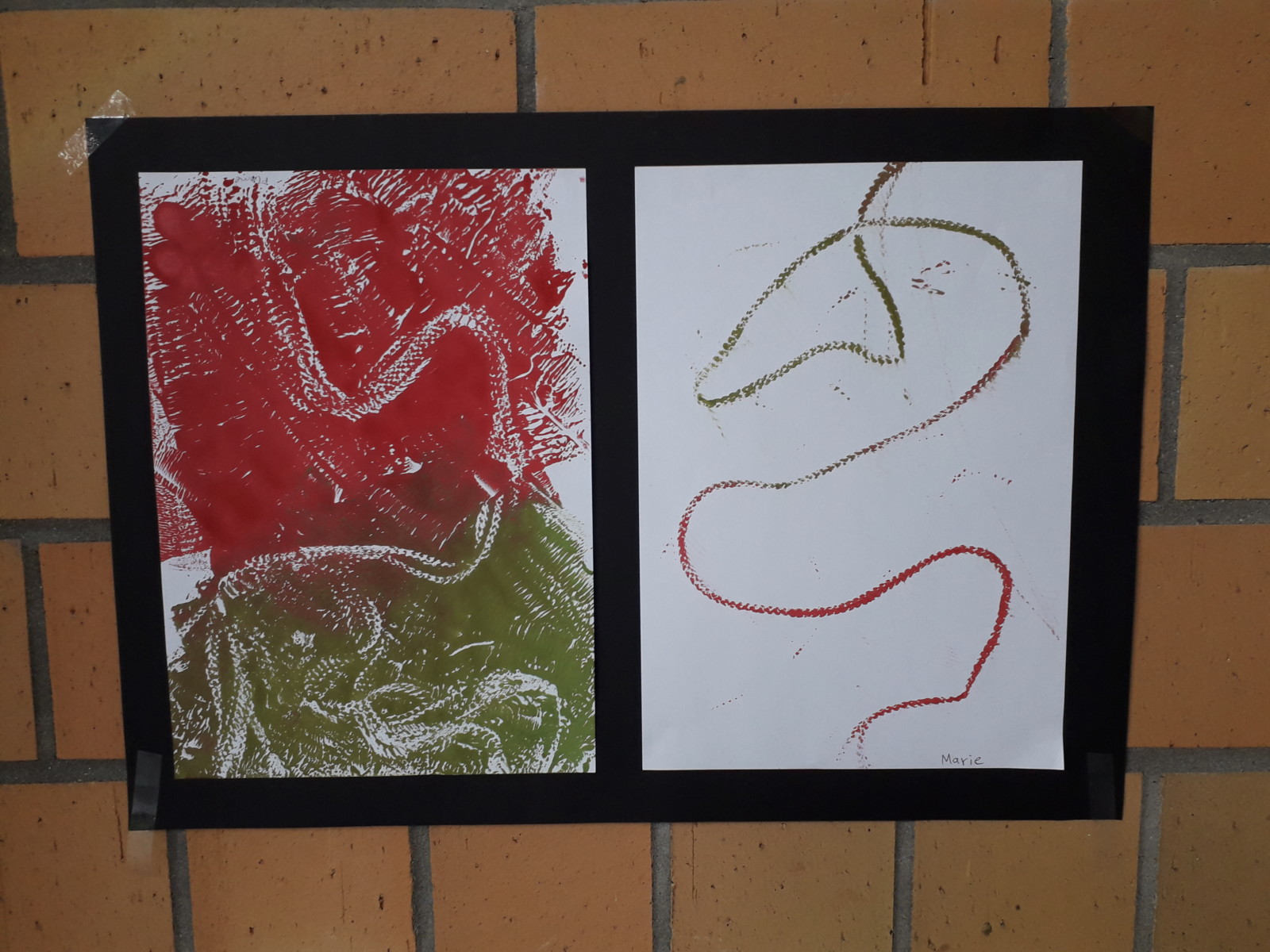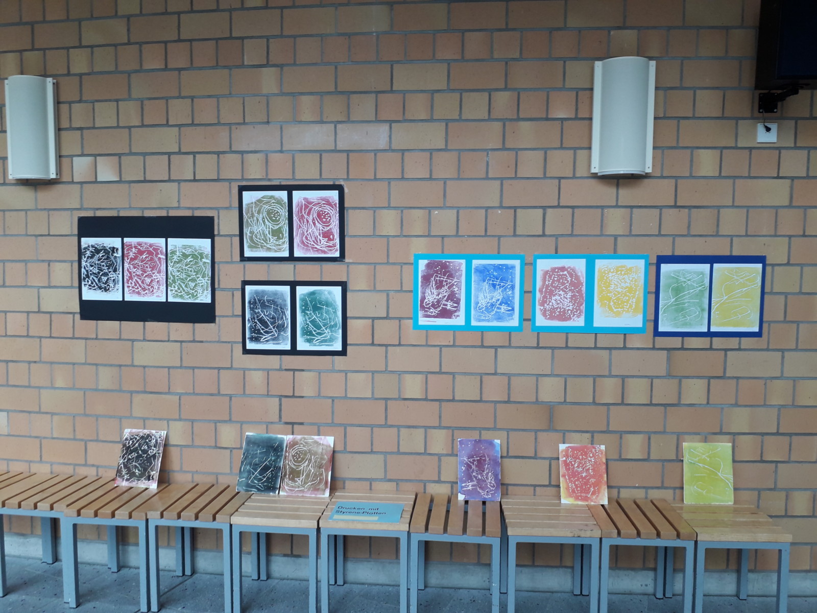 Darüber hinaus gab es Herbstmobiles, Glaslaternen, Tonarbeiten und Kunstdrucke. Gedruckt hatten die Schülerinnen und Schüler mit Schwämmen, Schnüren und Styreneplatten.