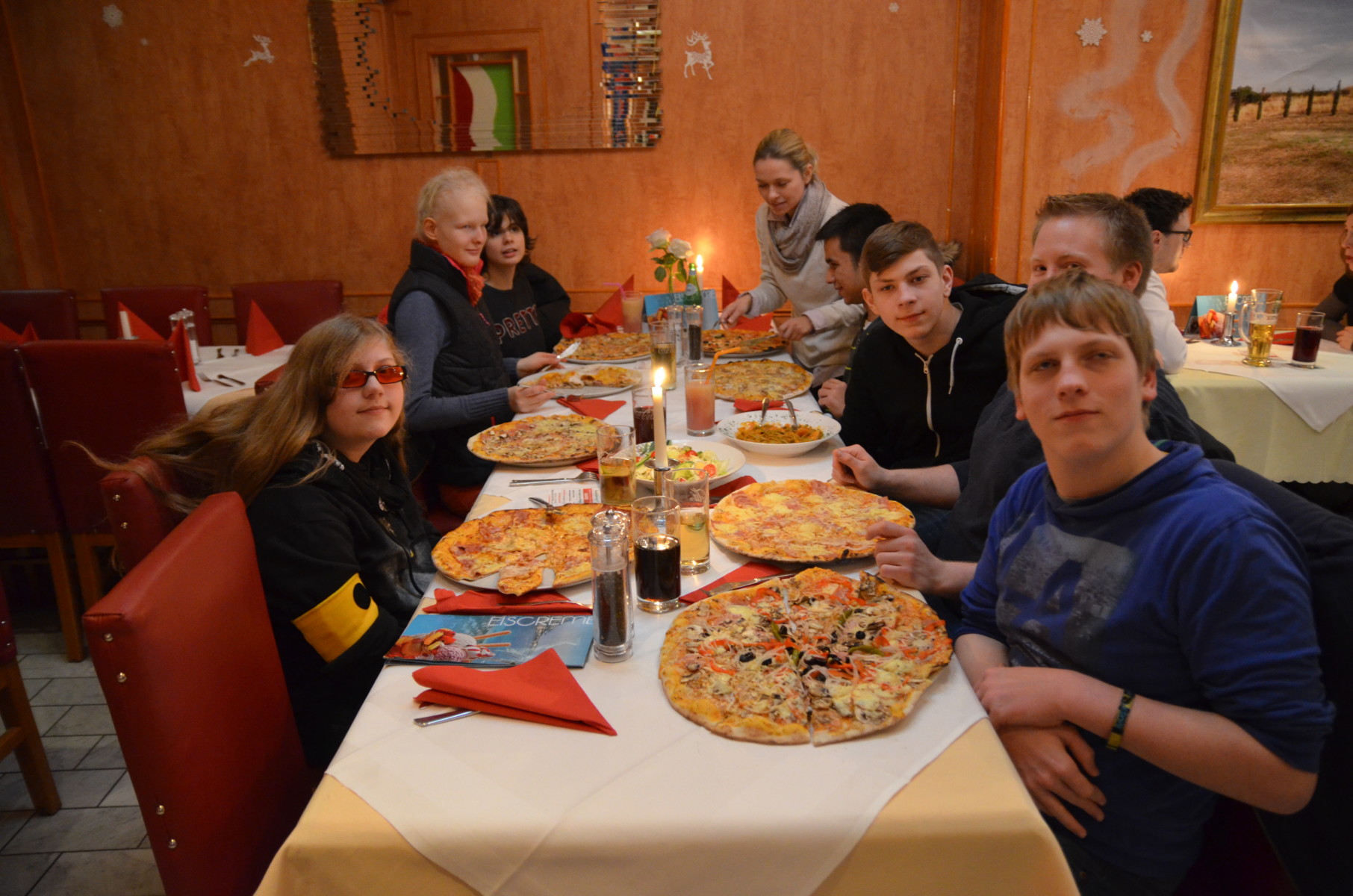 Die ehemaligen und die neu gewählten Internatssprecher kamen in den Genuss, sich bei einem gemeinsamen Abendessen mit Erziehern und der Internatsleitung über ihr zukünftiges Amt auszutauschen. Nach einer im wahrsten Sinne kühlen und windigen Anreise mit Bus und Bahn, freuten wir uns alle in dem gemütlichen und bereits lecker nach Pizza duftenden Restaurant Platz zu nehmen. Die umfangreiche Speisekarte lies keine Wünsche offen. Neben riesigen Pizzen, wurden Salate und Nudeln mit Lachs gewählt. Somit konnte für das leibliche Wohl bei lustigen, vielfältigen und gemeinsamen Gesprächsthemen bestens gesorgt werden. Hier begegneten sich auch neue Schüler, die bisher noch wenig Gelegenheit hatten, miteinander in Dialog zu kommen. Die Bewirtung und Freundlichkeit der Bedienung sorgten dafür, dass der Abend zu einem rundum freudigen Erlebnis wurden. Die Selbst- und Eigenständigkeit unserer Schüler wird hier selbstverständlich gesehen und unterstützt. Zum Abschluss gab es bei einigen Schülern sogar noch Platz für ein Dessert in Form eines Eises. Kugelrund, satt und angenehm erheitert über den netten Abend mit der gemischten Schülergruppe machten wir uns auf den Heimweg nach Ilvesheim.