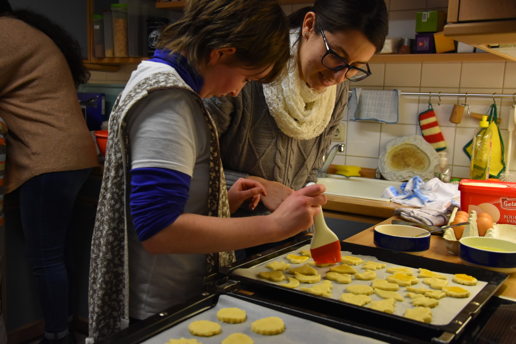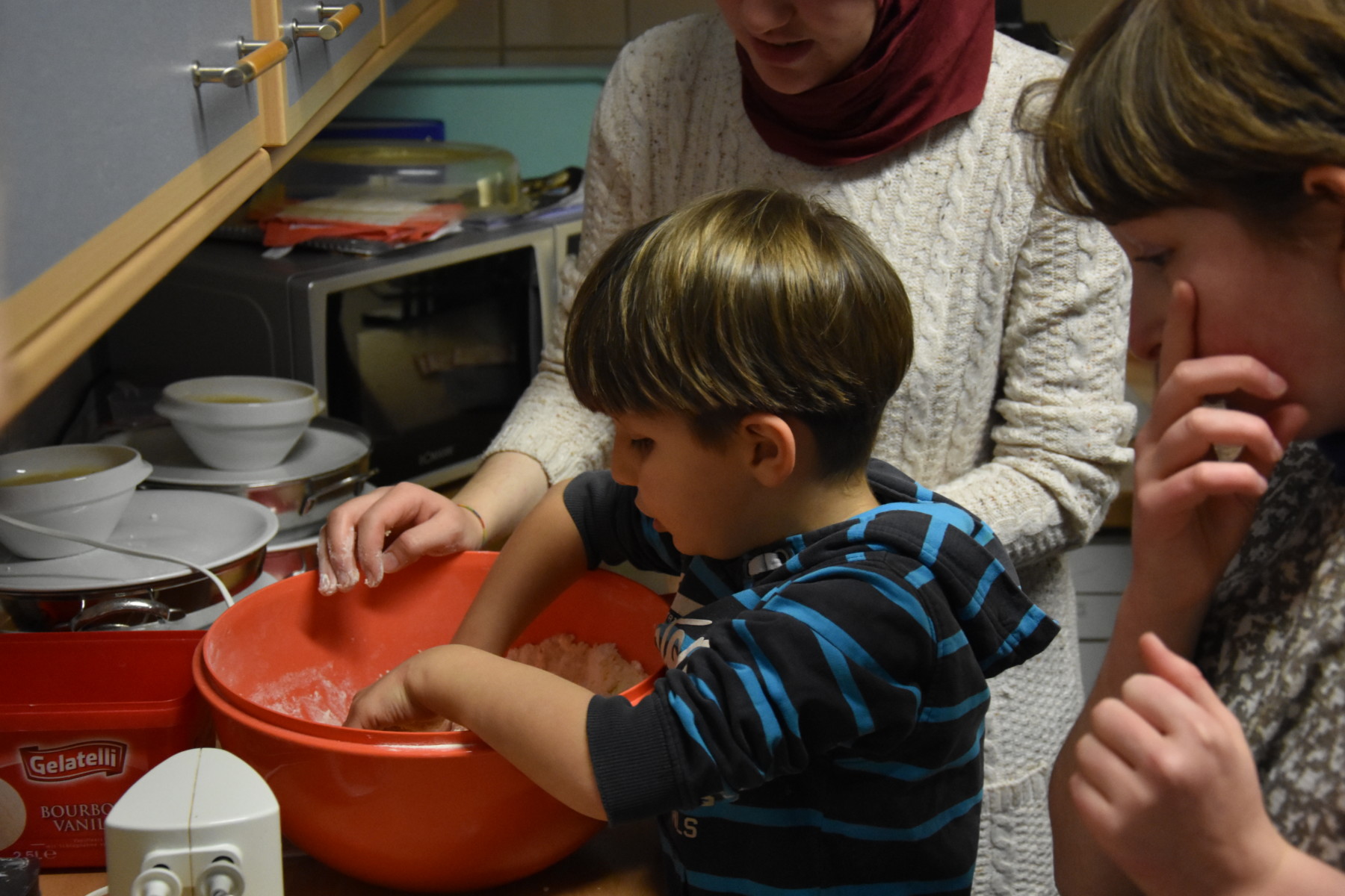 Insgesamt fünf der Schüler bereiteten den Butter-Plätzchenteig mit Unterstützung der drei Jugendleiterinnen zu und hatten sehr viel Spaß dabei. Jeder durfte eine Aufgabe übernehmen und sich ausprobieren.