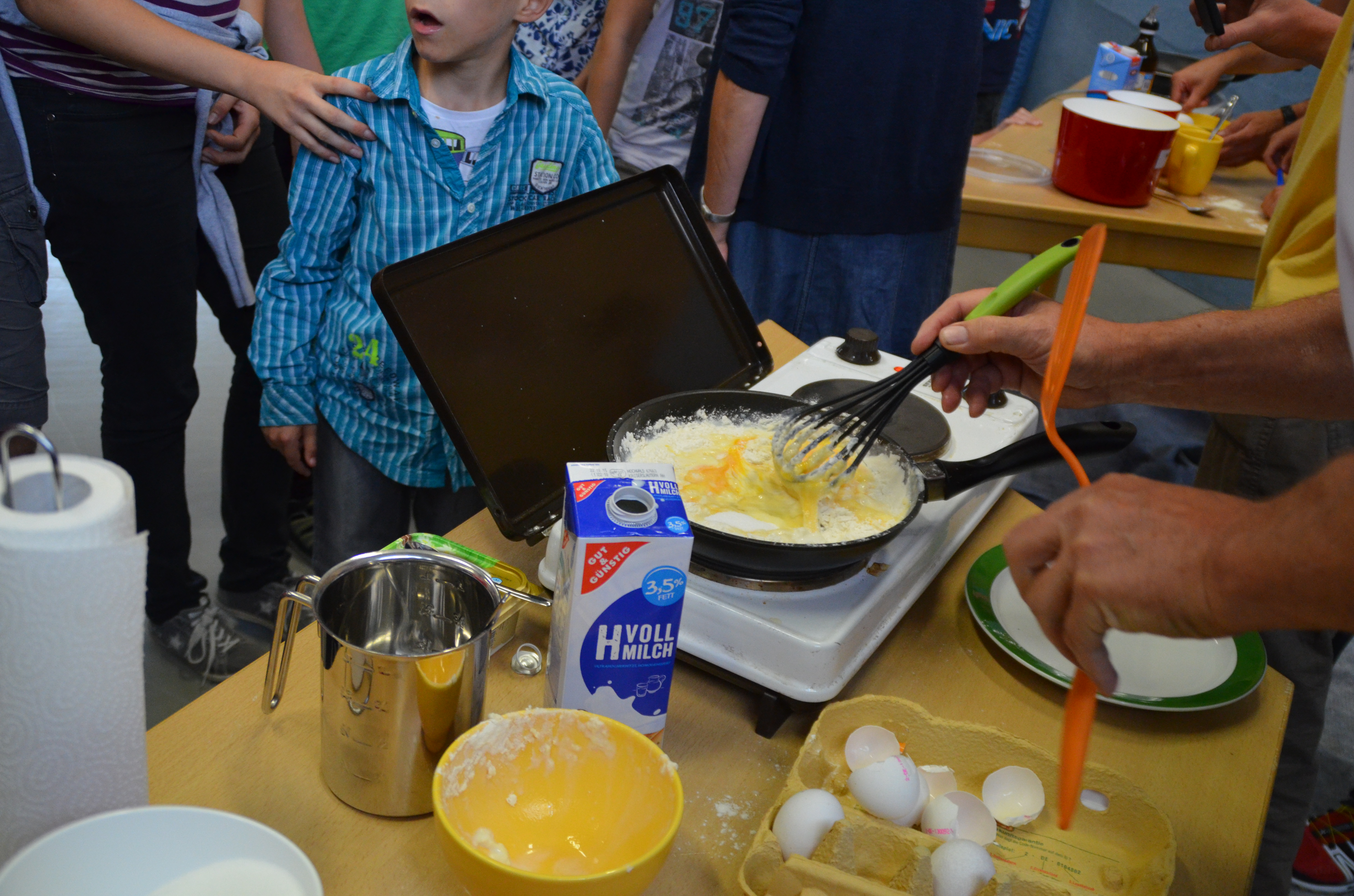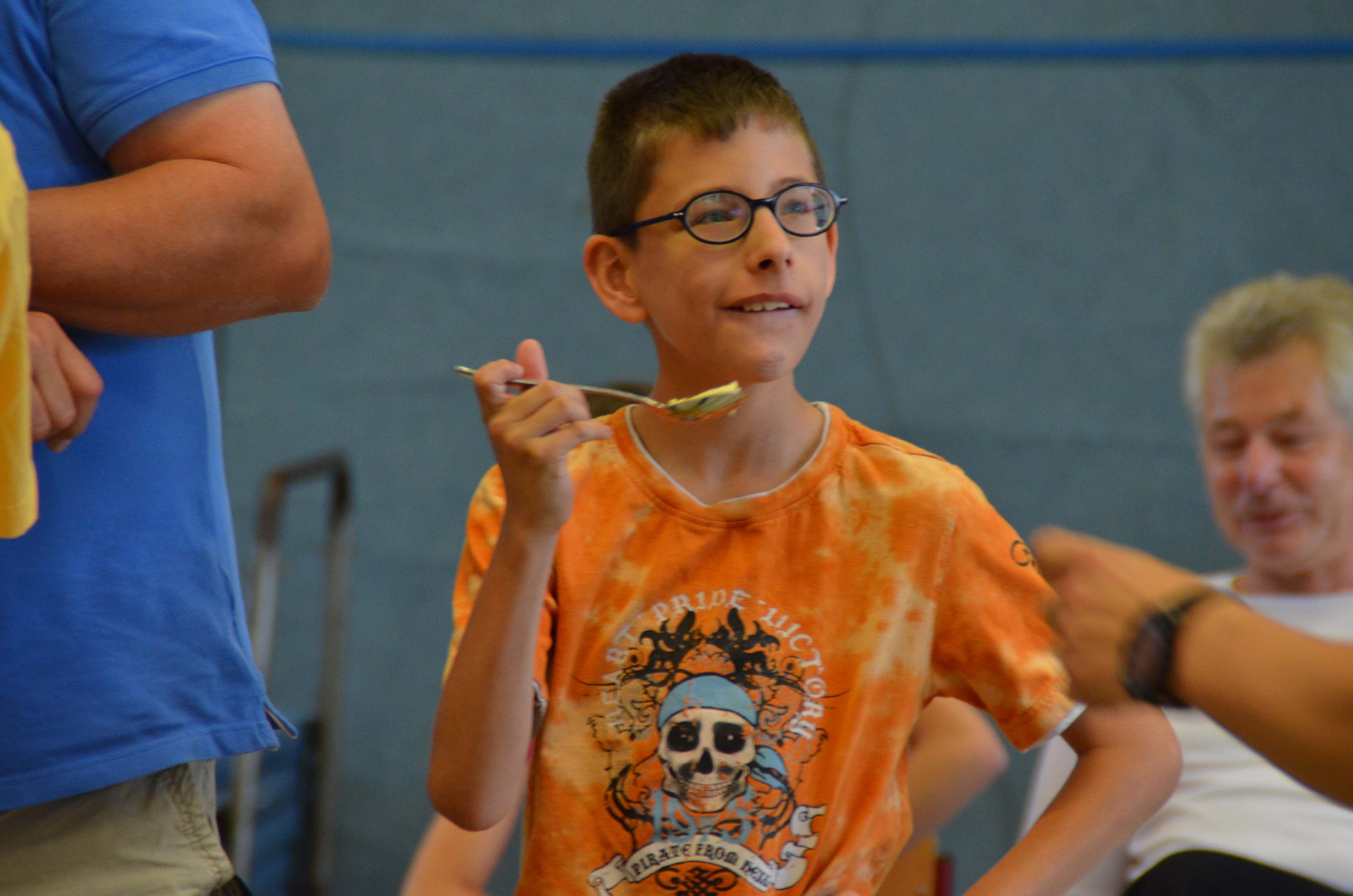 Im nächsten Duell, dem Geschmackstest, wurde der vierte und letzte Punkt für die Schüler erzielt. Eine Lehrerin hatte extra für dieses Spiel gekocht, pürriert und eingefärbt – so gab es z.B. giftgrün gefärbte und pürierte Spaghetti mit Tomatensauce oder pürierte Frikadellen, die wie Dreck aussahen … Ziel war es, alle Speisen zu erkennen – das ist deutlich schwieriger, wie man zunächst denkt! Da wurde Apfel-Johannisbeer-Babybrei zu Apfelmus, aus roter Grütze wird auf einmal Vanillepudding – tja, das kommt davon, wenn man die Dinge rot, blau, grün, gelb, rosa oder pink färbt!