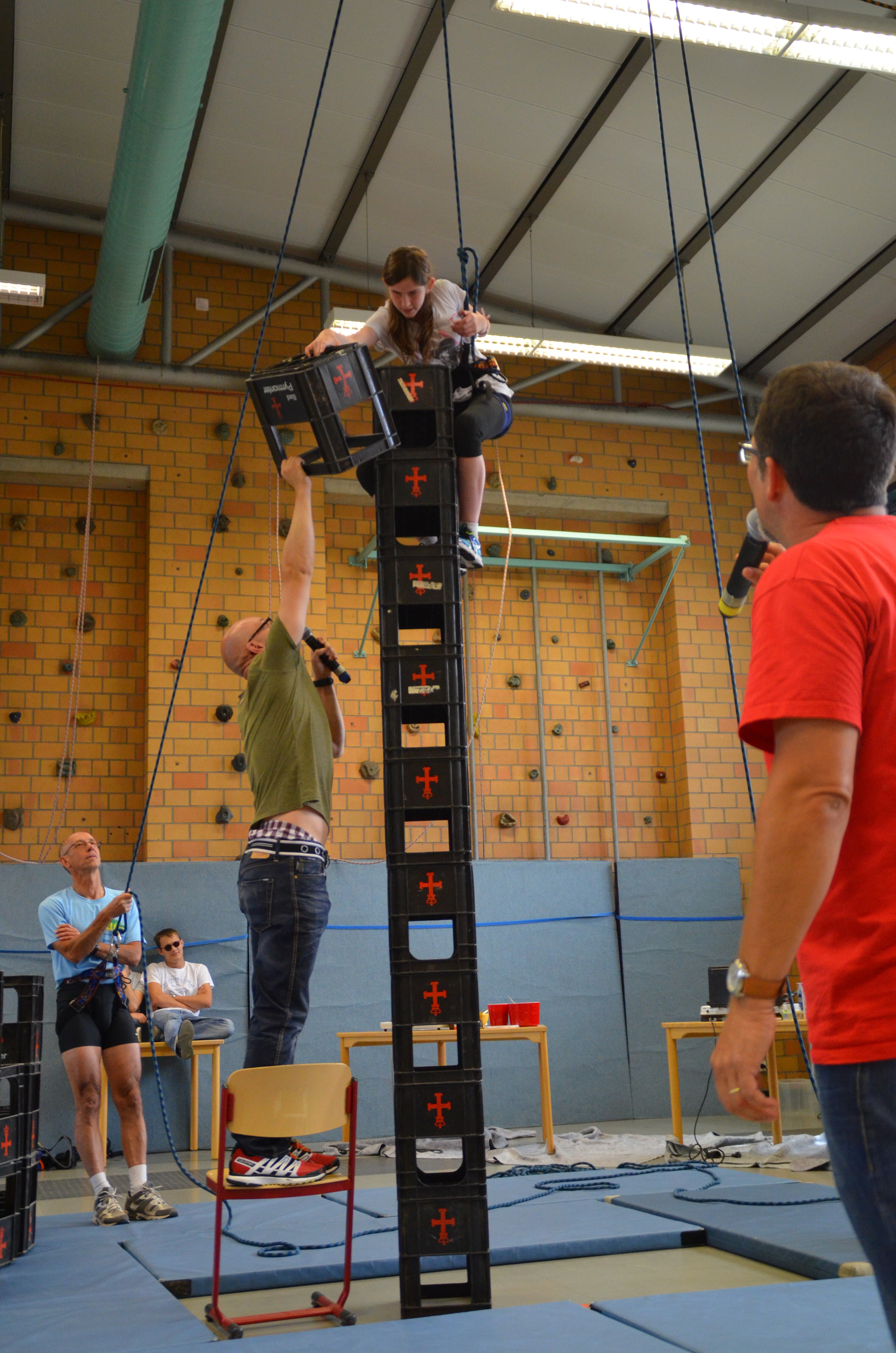 Als Nächstes kam ein Battle, dem sich eine junge Sportlerin zwar mutig entgegenstellte, jedoch diesen Wettkampf nicht für sich entscheiden konnte. Hierbei ging es darum, so viele Getränkekisten wie möglich aufeinanderzustapeln und währenddessen daran hochzuklettern, sodass man am Ende, insofern möglich, ganz oben auf dem Turm steht. Sowohl Erwachsener als auch Jugendliche wurden dafür mit einem Klettergurt ausgestattet und kamen weit über die 2-Meter-Marke.