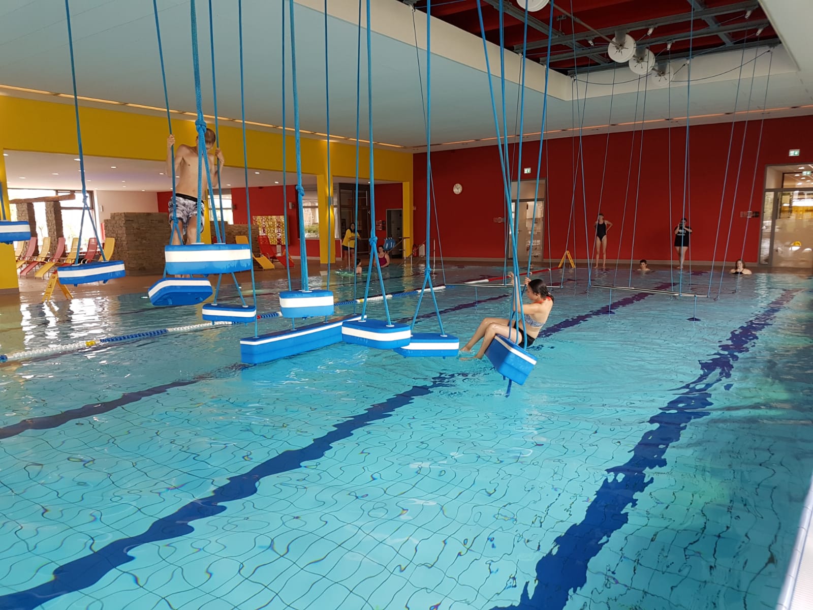 Nachdem man sich mit Burgern, frischen Obst und Gemüse gestärkt hatte, ging es zu den Mannschaftssportarten. Luca, Davide und Jan vertraten die Schloss-Schule beim diesjährigen einmalig stattfindenden Aqua-Cross: in einer Staffel muss zunächst ein Hindernisparcour überklettert, untertaucht, durch-balanciert und überhangelt werden, bevor ein Schwimmer starten kann. Davide konnte mit seiner Staffel den zweiten Platz erkämpfen und war einer der wenigen Teilnehmer, die den Parcour ohne Strafpunkte meisterte!