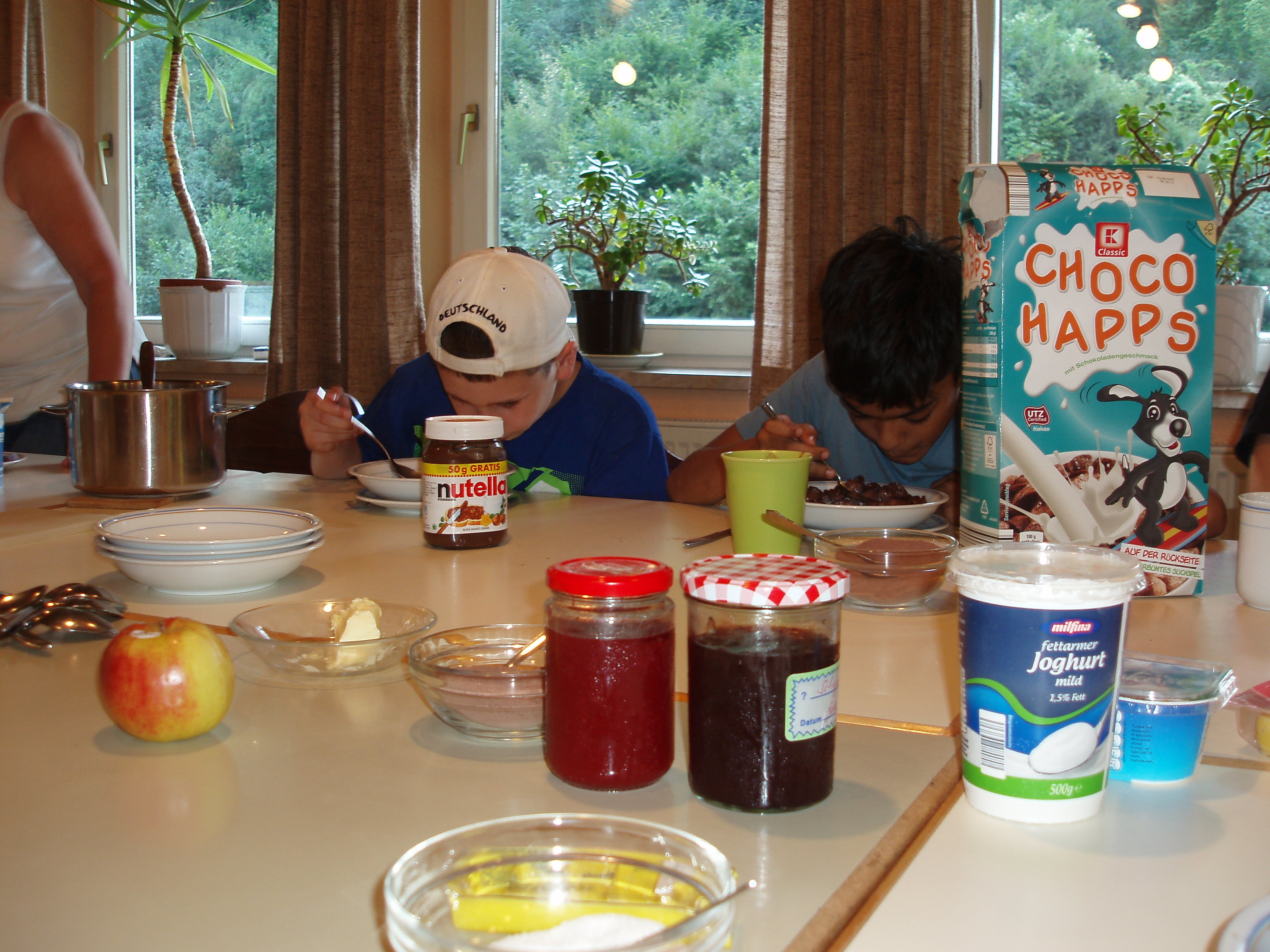 Frühstück: viele Müslisorten Flakes Brötchen Beilagen für die Brötchen, ein Beispiel: Nutella