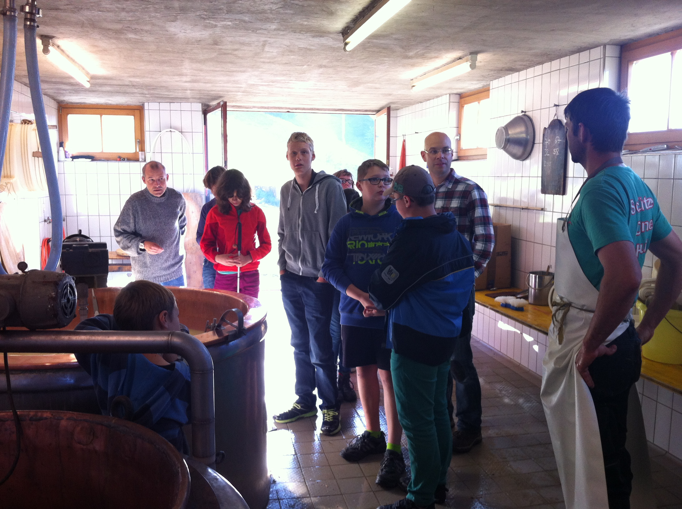 Am nächsten Morgen wurde es ein bisschen stressig, da wir einen Termin hatten, den wir nicht verpassen wollten und wir davor noch eine lange Fahrt mit Bus und der Bezauer Bergbahn zu bewältigen hatten. Also standen wir um halb sieben auf, frühstückten, spülten und packten in einer Blitzaktion, bevor wir uns um 07.50 Uhr mit unseren Rucksäcken auf den Weg zur Bushaltestelle machten. Wir fuhren nach Bezau, mussten noch ein Stückchen laufen und fuhren dann mit der Bergbahn zur Mittelstation. Interessant daran war, dass es sich in der Gondelbahn so anfühlte, als würde sie sehr langsam fahren, obwohl sie in Wirklichkeit doch recht zügig unterwegs war. Dies wurde uns allerdings erst bewusst, als wir nach dem Aussteigen hören konnten, wie sie auf dem Weg zur Bergstation an uns vorbei sauste. Wir gingen entspannt von der Mittelstation über die Alpe Sonderdach nach oben. Rechts und links weideten Kühe mit Kuhglocken. So konnten auch die Blinden die Tiere deuten und die Tonvielfalt der Glocken erfahren. In der Sennerei erfuhren wir dann, dass es ca. sechzig Kühe waren. Der Senner erklärte und zeigte uns, wie Käse und Butter hergestellt wird. Er meinte, dass er von diesen sechzig Kühen pro Tag bis zu 700 Liter Milch bekommt. Wir konnten den ganzen Prozess mit Abschöpfen des Frischkäses aus der Molke, Pressen in Holzformen, und auch das Anheizen des Kessels miterleben. Auch erfuhren wir, dass er aus der übrig bleibenden Molke sogenannte „Wälderschokolade“ produziert, eine etwas salzig schmeckende Karamelcreme. Auch durften wir Käse und ganz frische Butter probieren. Zum Schluss zeigte uns der kleine Sohn des Senners ein Kalb, das am Tag zuvor geboren worden war und wir konnten auch das laute Grunzen der neugierigen Schweine miterleben.