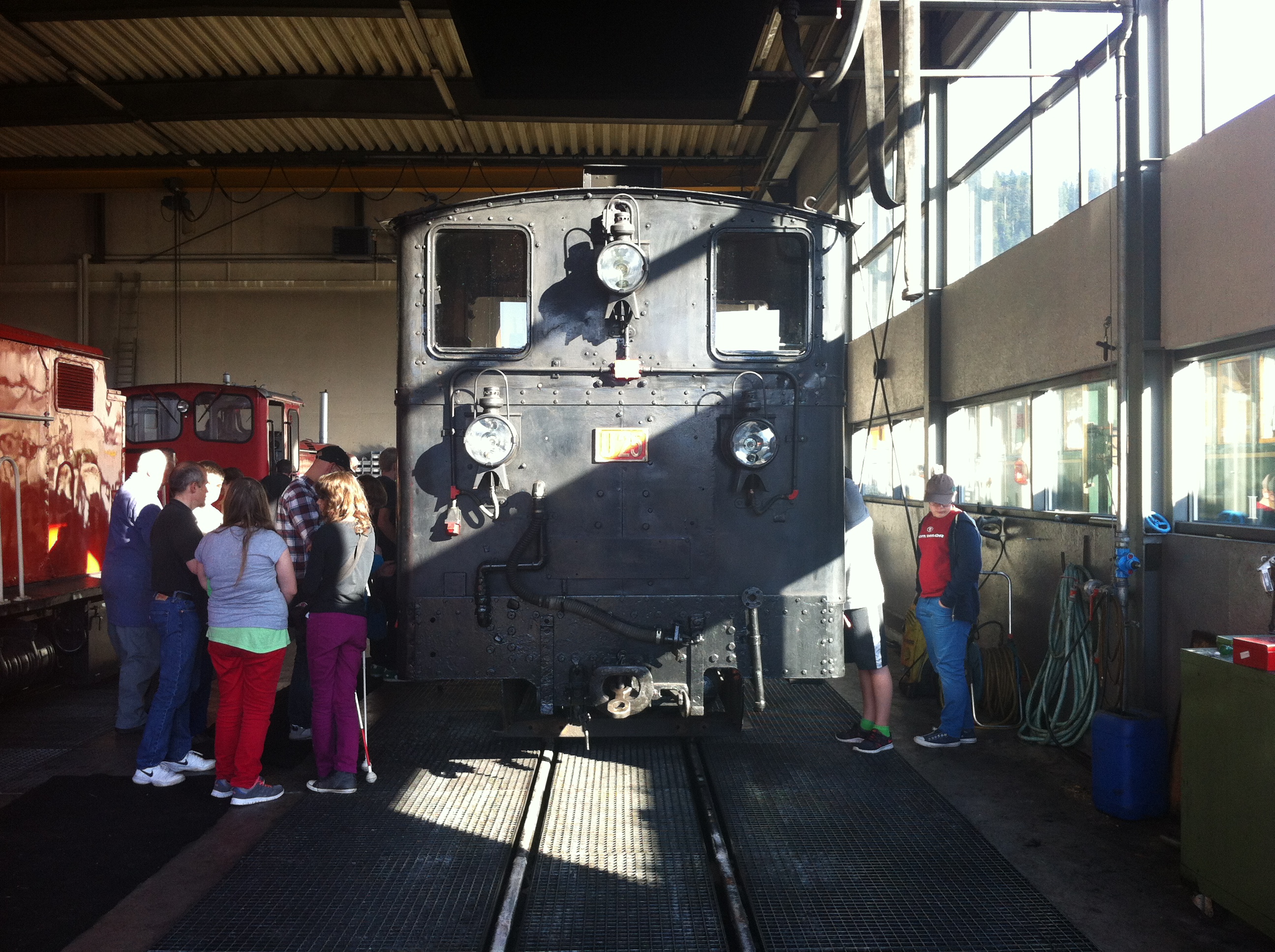 Um viertel vor drei brachen wir dann bereits zu unserer ersten Unternehmung auf: Unser Ziel war der Bahnhof in Bezau (ein Nachbarort von Bersbuch). Dort fuhren wir mit dem Wälderbähnle. Das Bähnchen besteht aus einer historischen Lok und einigen Waggons, die mit Holzsitzen ausgestattet sind. Die Fahrt führte über eine historische Strecke von Bezau über Bersbuch bis nach Schwarzenberg (Nachbarort von Bersbuch), die von 1902 bis 1989 noch regulär im Betrieb war. Dabei konnten wir auch unsere Hütte wieder erkennen. Frau Liebers machte Fotos davon. Als wir wieder in Bezau ankamen, durften diejenigen, die wollten, mit auf den Führerstand der Lok kommen – und stellt euch vor: Batuhan, ein vollblinder Junge unserer Klasse, durfte sogar ganz alleine fahren! Anschließend konnten wir in der Reparaturhalle weitere Wagen und Loks besichtigen und bekamen vom Lokführer Einiges erklärt.