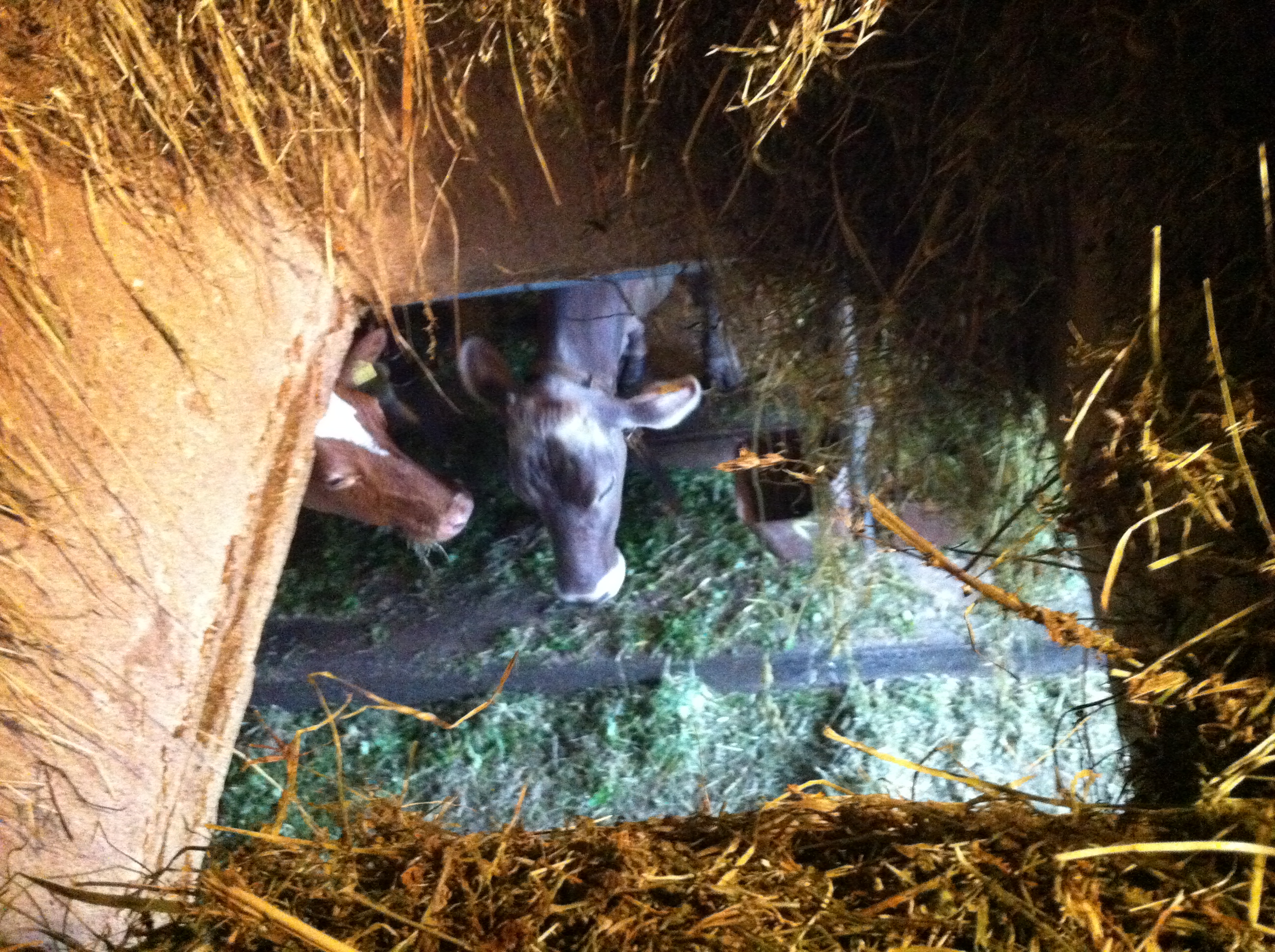 Dort wurden wir schon beim Aussteigen mit lautem Muhen begrüßt. Direkt neben dem Parkplatz befand sich ein Stall, deren sich darin befindende Kühe uns mit neugierigen Blicken musterten. In diese Musterungsprozedur stimmten wir ein, indem wir ebenfalls das „Wohngebiet der Kühe“ betraten. Dabei lernten wir nicht nur die Tiere kennen, sondern bemerkten auch, dass nicht nur jeder Mensch, sondern auch jede Kuh ihre ganz eigene Stimme hat. Besonders auffällig war ein Exemplar, welches einen unglaublich hohen Ton erzeugte. Christinas Kommentar dazu: „Ich glaube, die Kuh ist heiser!“.