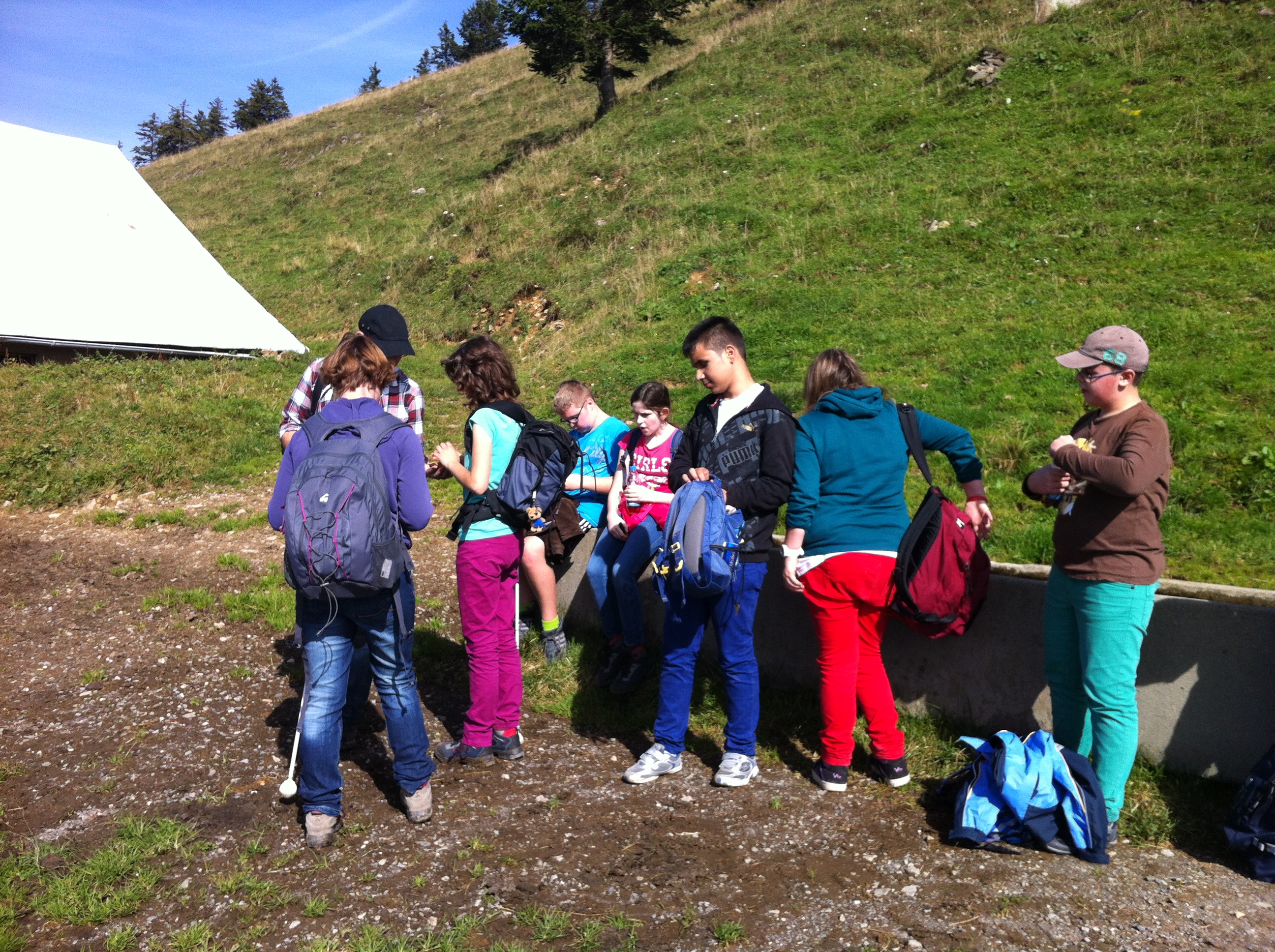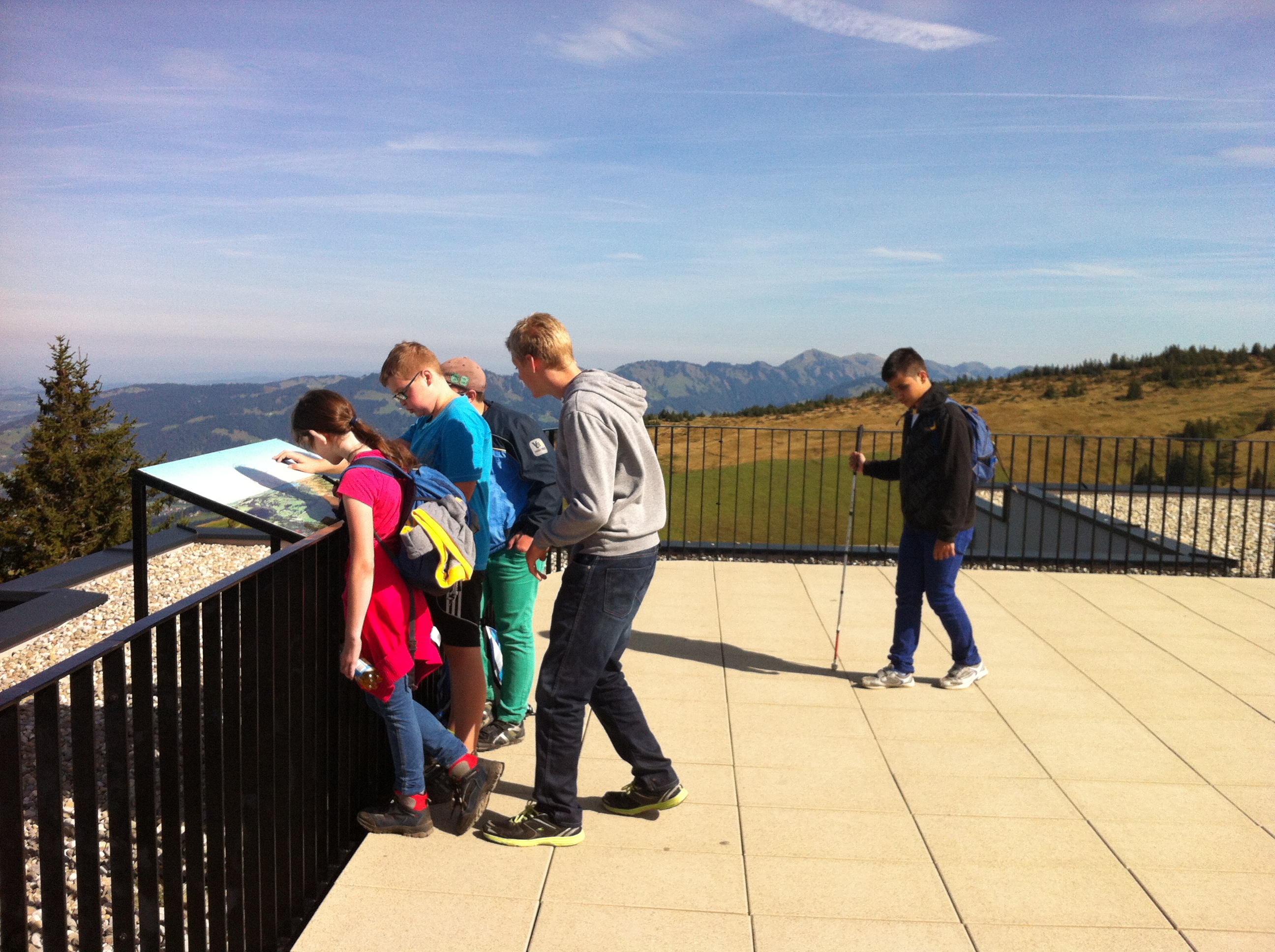 Am nächsten Morgen wurde es ein bisschen stressig, da wir einen Termin hatten, den wir nicht verpassen wollten und wir davor noch eine lange Fahrt mit Bus und der Bezauer Bergbahn zu bewältigen hatten. Also standen wir um halb sieben auf, frühstückten, spülten und packten in einer Blitzaktion, bevor wir uns um 07.50 Uhr mit unseren Rucksäcken auf den Weg zur Bushaltestelle machten. Wir fuhren nach Bezau, mussten noch ein Stückchen laufen und fuhren dann mit der Bergbahn zur Mittelstation. Interessant daran war, dass es sich in der Gondelbahn so anfühlte, als würde sie sehr langsam fahren, obwohl sie in Wirklichkeit doch recht zügig unterwegs war. Dies wurde uns allerdings erst bewusst, als wir nach dem Aussteigen hören konnten, wie sie auf dem Weg zur Bergstation an uns vorbei sauste. Wir gingen entspannt von der Mittelstation über die Alpe Sonderdach nach oben. Rechts und links weideten Kühe mit Kuhglocken. So konnten auch die Blinden die Tiere deuten und die Tonvielfalt der Glocken erfahren. In der Sennerei erfuhren wir dann, dass es ca. sechzig Kühe waren. Der Senner erklärte und zeigte uns, wie Käse und Butter hergestellt wird. Er meinte, dass er von diesen sechzig Kühen pro Tag bis zu 700 Liter Milch bekommt. Wir konnten den ganzen Prozess mit Abschöpfen des Frischkäses aus der Molke, Pressen in Holzformen, und auch das Anheizen des Kessels miterleben. Auch erfuhren wir, dass er aus der übrig bleibenden Molke sogenannte „Wälderschokolade“ produziert, eine etwas salzig schmeckende Karamelcreme. Auch durften wir Käse und ganz frische Butter probieren. Zum Schluss zeigte uns der kleine Sohn des Senners ein Kalb, das am Tag zuvor geboren worden war und wir konnten auch das laute Grunzen der neugierigen Schweine miterleben.