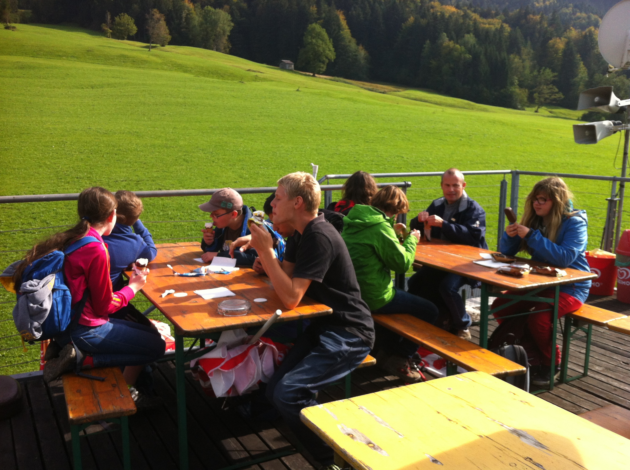 Wieder auf der Hütte machten sich die Jungs mit Herrn Rüger und Frau Liebers direkt auf den Weg zur Ach und testeten die Kälte des Wassers, während die Mädchen und Bathuan im Haus blieben. Wir duschten, packten aus und Herr Mielke nutzte die Zeit, um Kerstins Gehör zu testen. Als dann die Wasserratten duschten, befassten sich die Landratten mit dem Zubereiten der Käsespätzle. Natürlich mit Käse von der Alm am Vormittag. Um viertel nach acht waren wir dann soweit, dass wir essen konnten. Heute wurde nicht mehr musiziert oder weiteres Programm gemacht und so kehrte schnell Ruhe ein (Anmerkung des Klassenlehrers: Die eigentlich geplante Nachtwanderung fiel leider wegen strömenden Regens aus.).